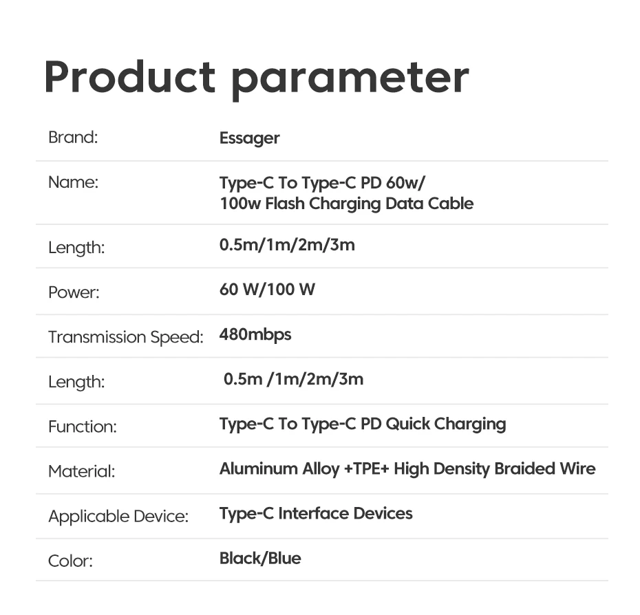 Comprar Essager Cable USB C a tipo C PD100W 60W Cable de carga rápida Cable de datos del cargador USB-C para Macbook Samsung Xiaomi Cable tipo C 3M