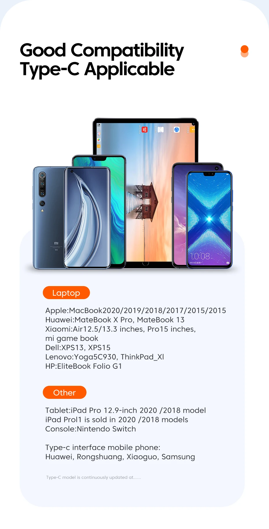 Admite carga rápida PD de 100 W, también puede admitir carga rápida de equipos de interfaz tipo c/thunderbolt 3