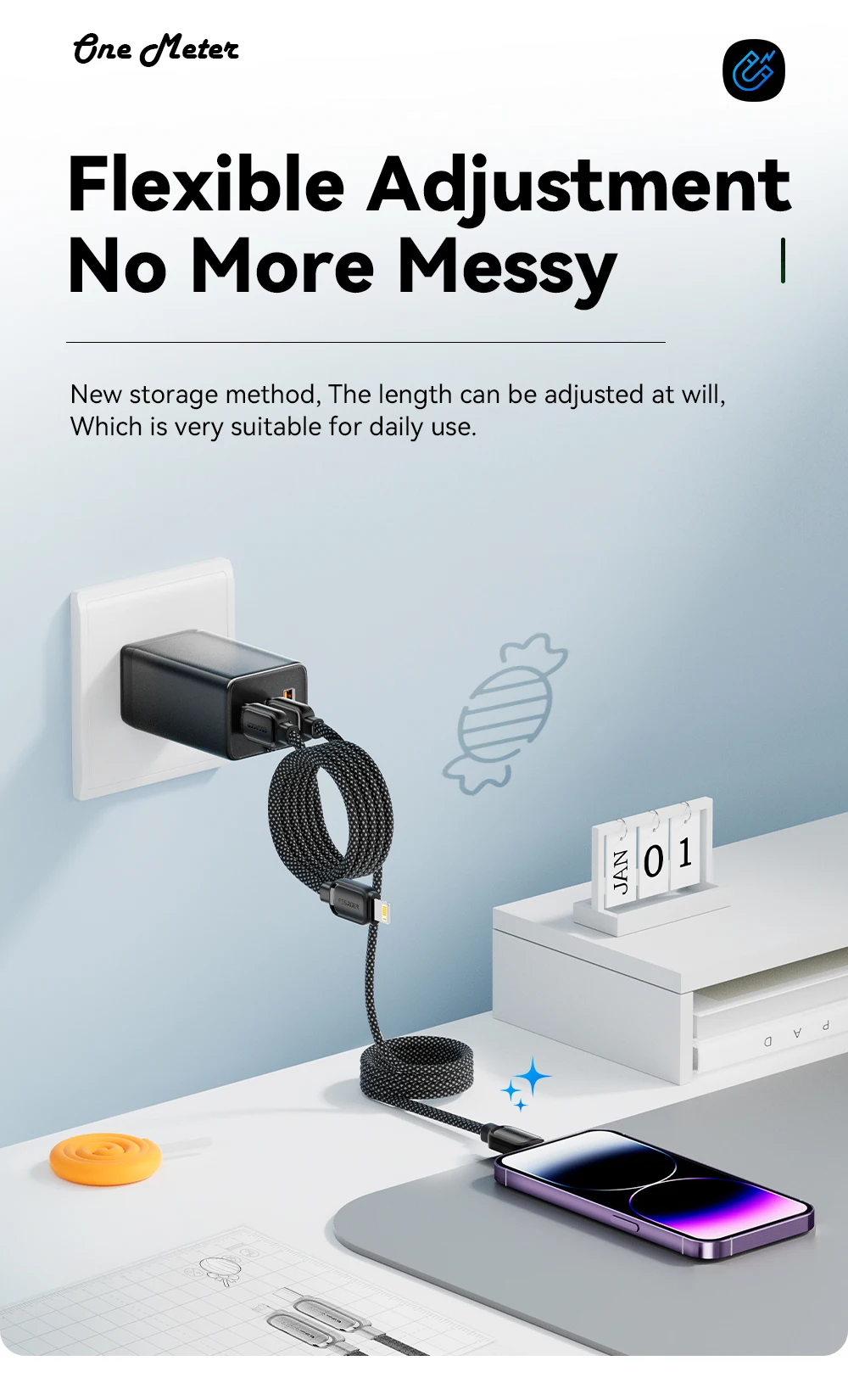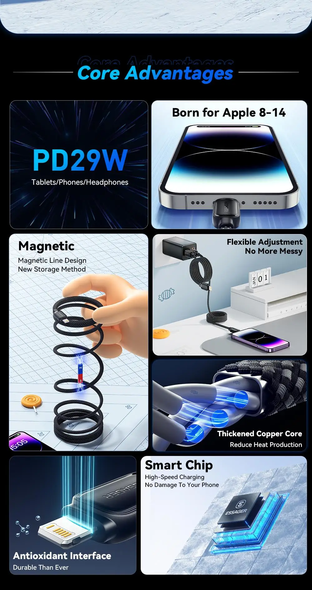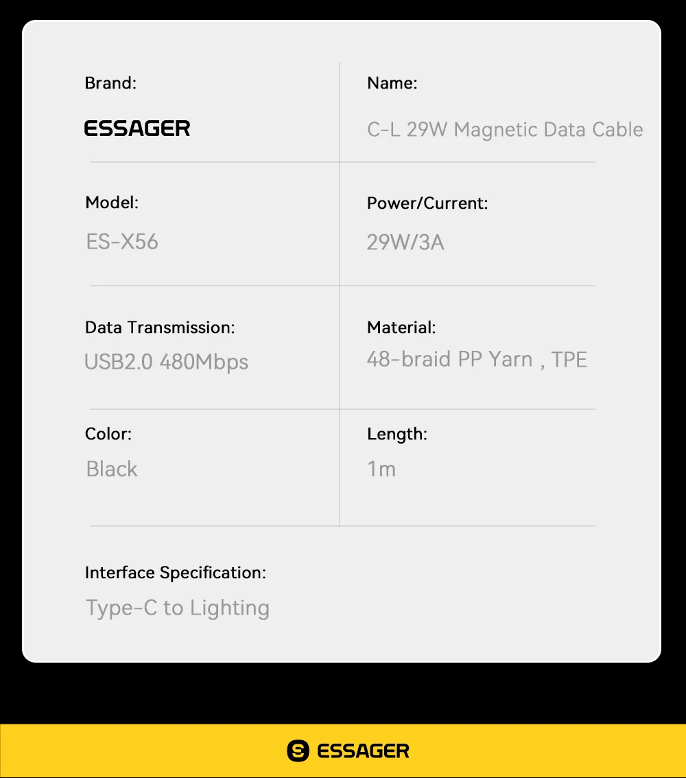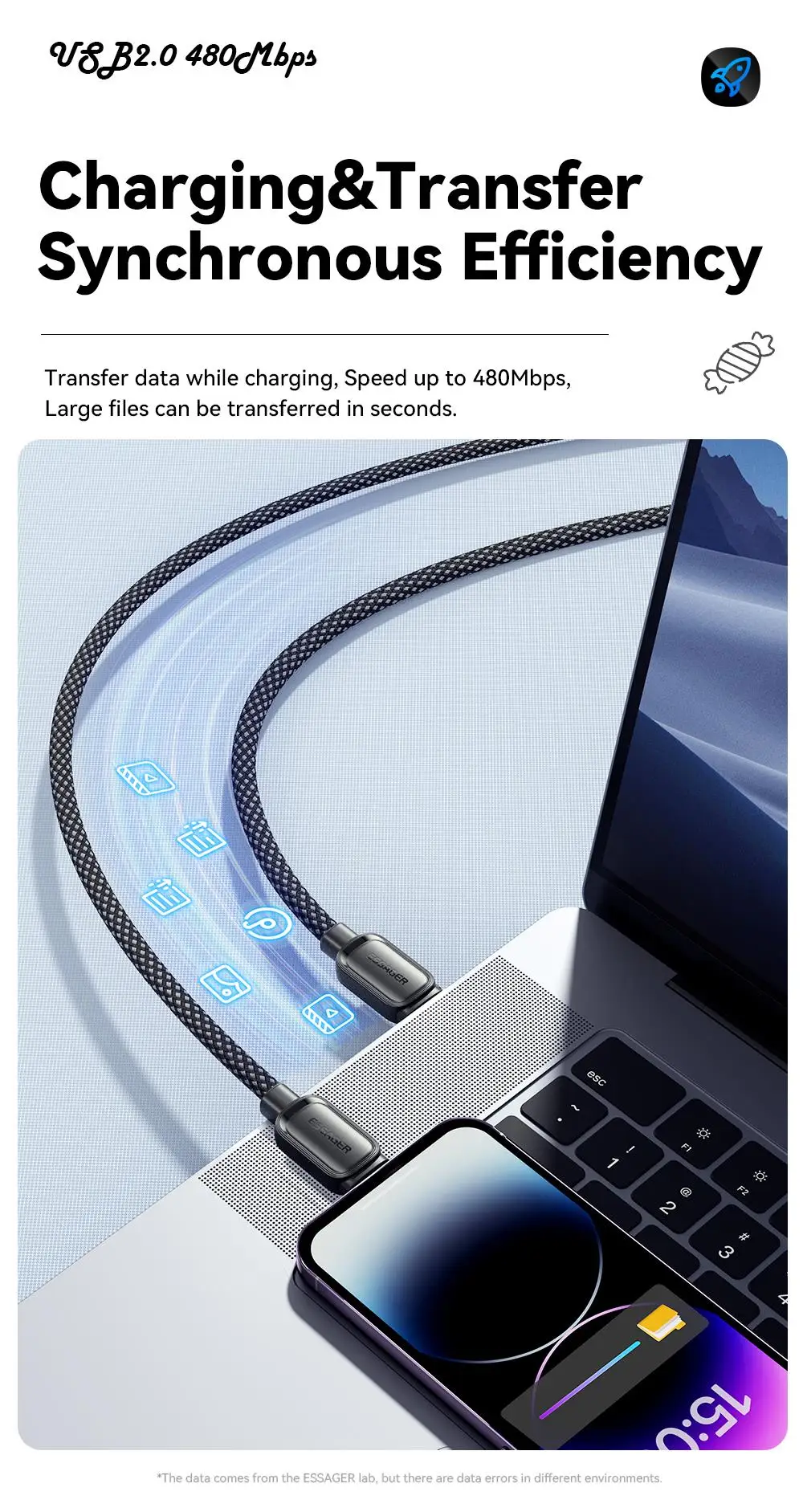 Parámetros del producto Modelo: ES-X53 Material: TPE, 48 hilos tejidos de PP Especificación de la interfaz: tipo C a Lightning Potencia/corriente: 29W/3A Transmisión de datos: USB2.0 480Mbps Longitud: 1m