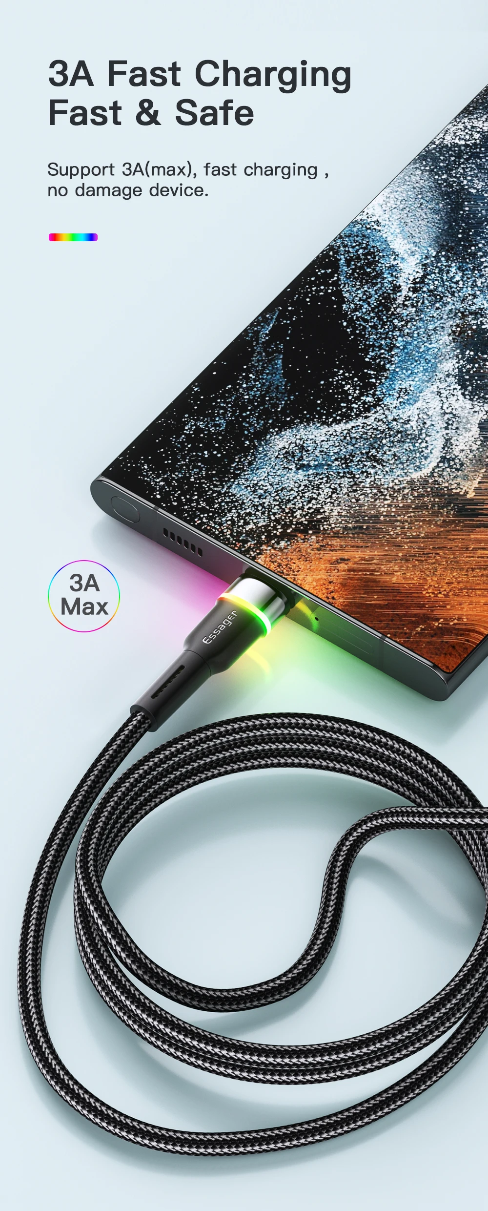 Carga rápida 3A: admite 3A (máx.), carga rápida, sin dañar el dispositivo.