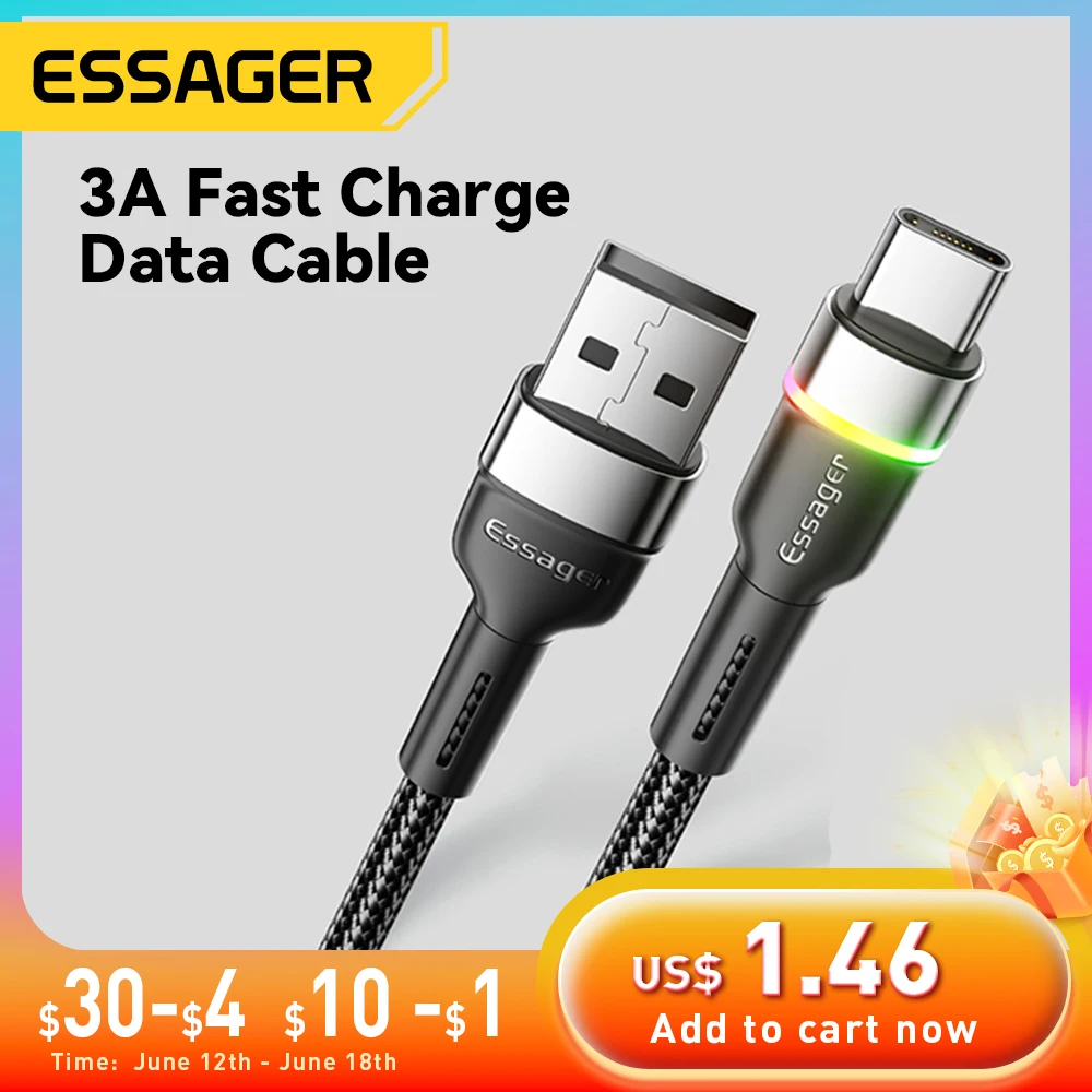 Comprar Essager-Cable USB tipo C para teléfono móvil, cargador rápido 3A para Xiaomi, Huawei, Redmi Mate, Samsung, USBC