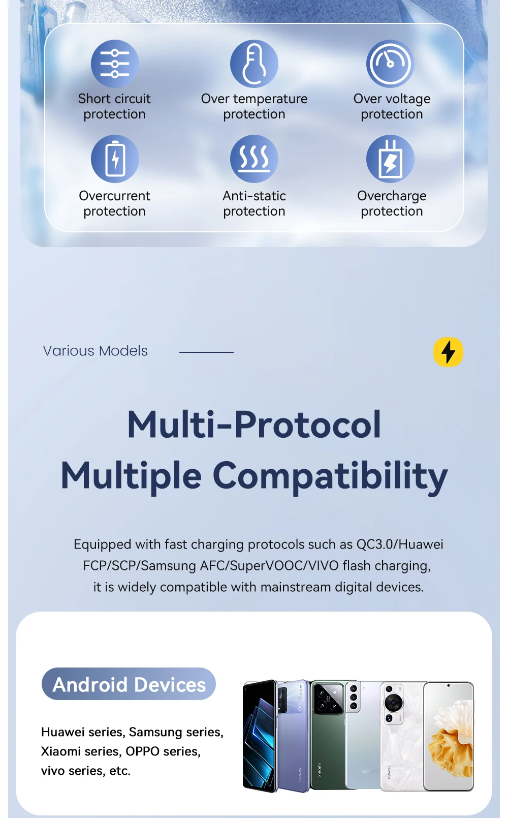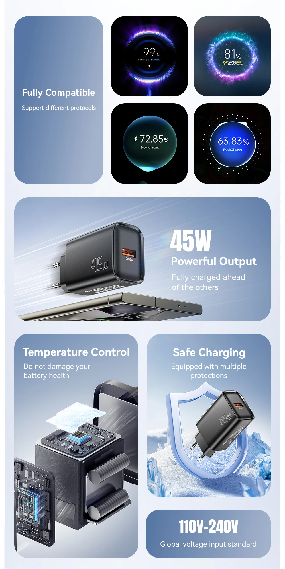 Funciona con todos los dispositivos: admite QC3.0, Huawei FCP/SCP, Samsung AFC, SuperVOOC, VIVO FlashCharge y más.
