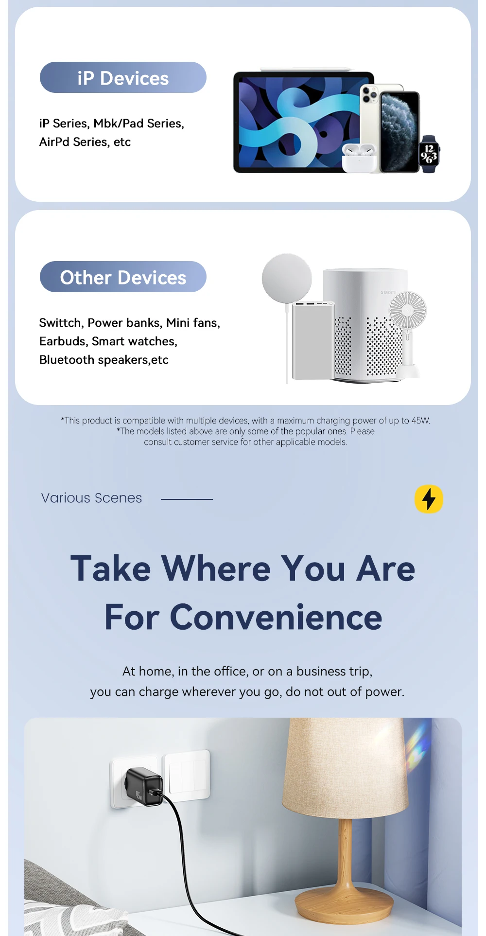 El único puerto USB-A ofrece una carga ultrarrápida, superando a los cargadores estándar.Alimenta teléfonos, tabletas, interruptores y pequeños electrodomésticos simultáneamente.