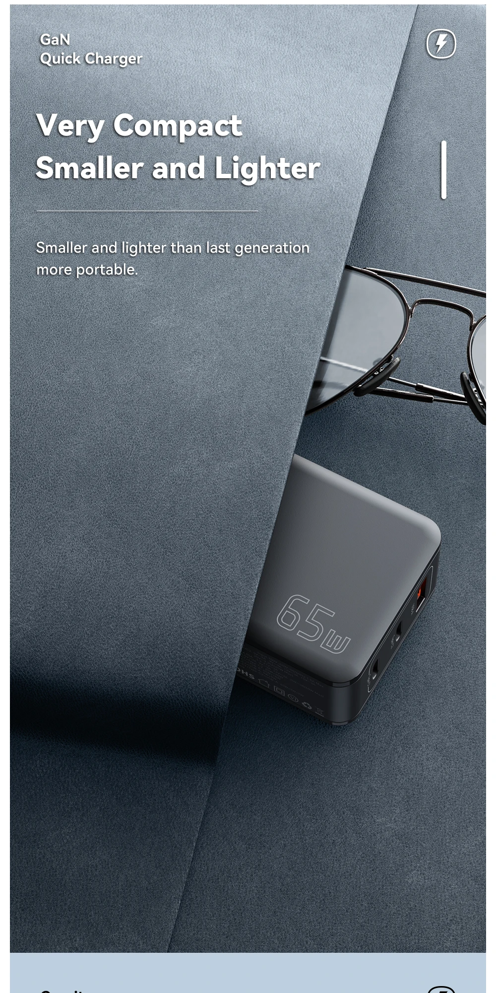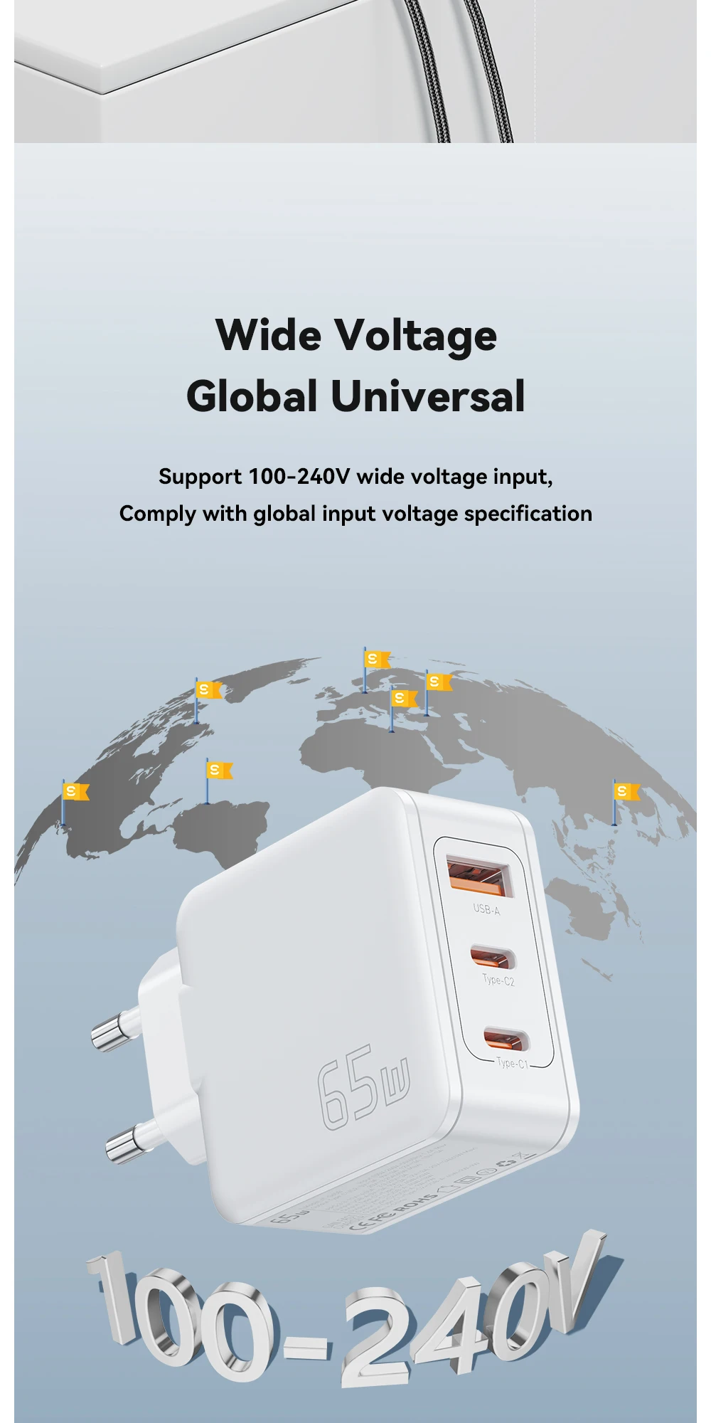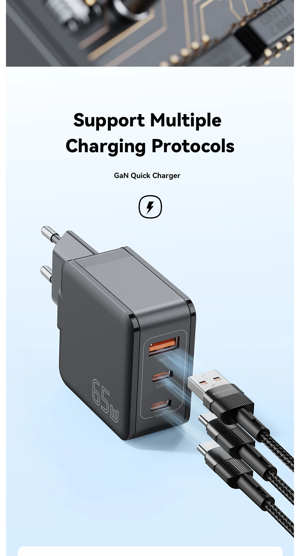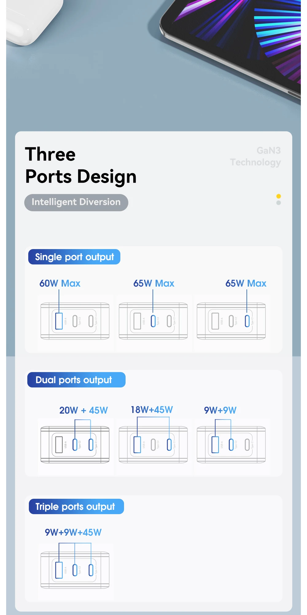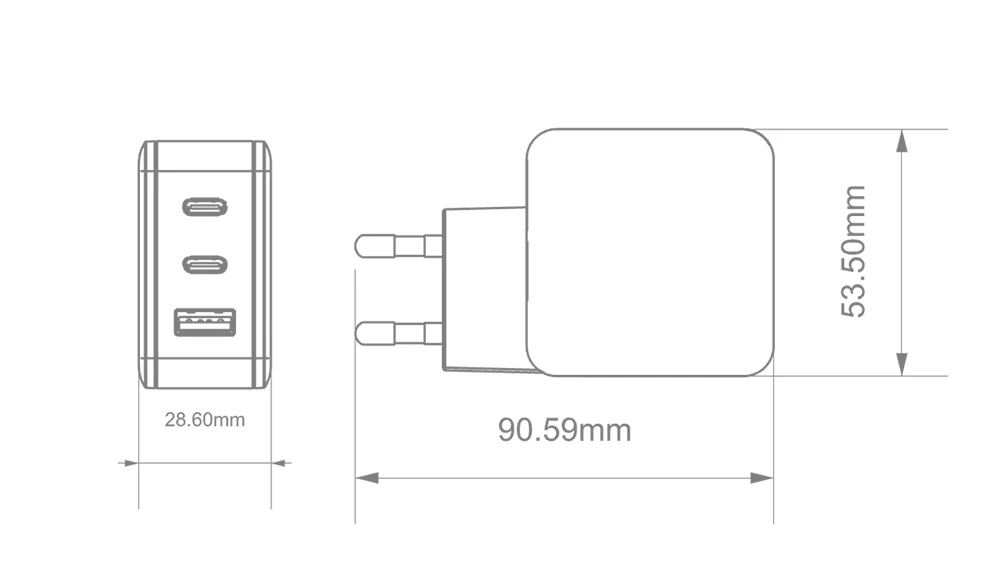 65W GaN Cargador de viaje 2C + A PD65W Carga rápida, Tres salidas, Protecciones múltiples, Tamaño pequeño