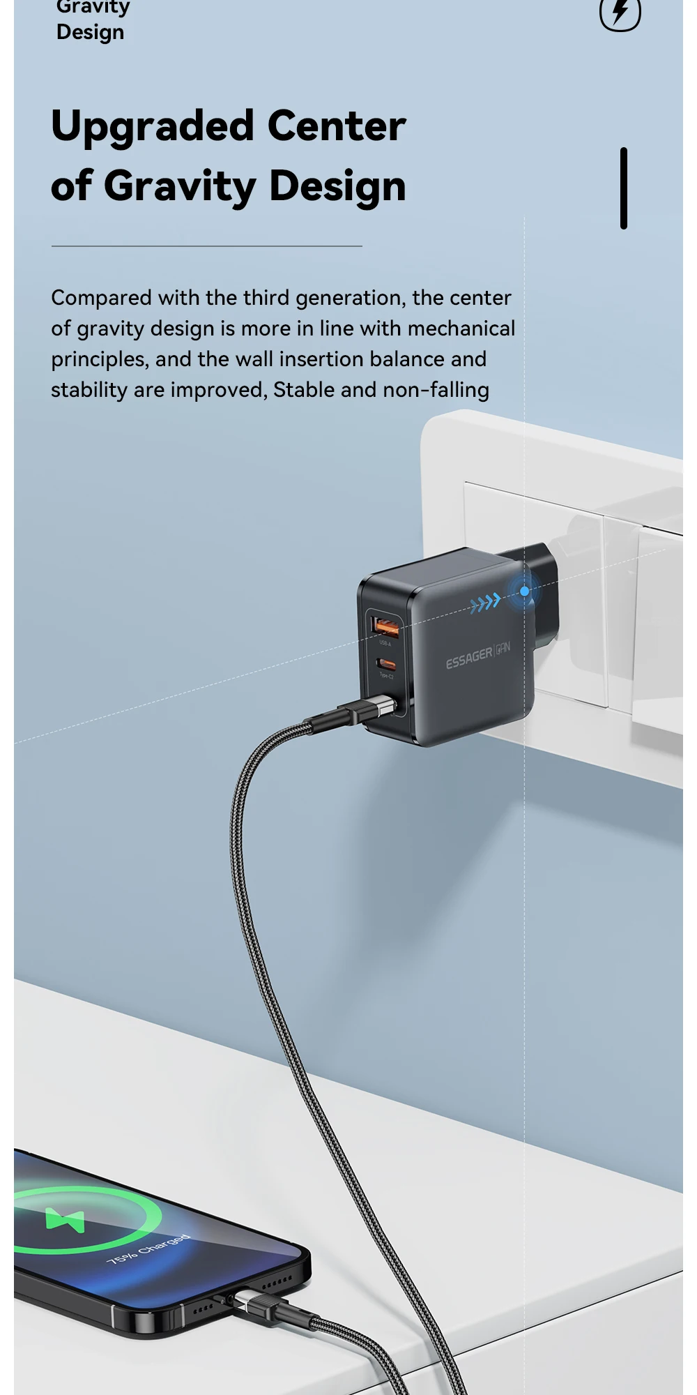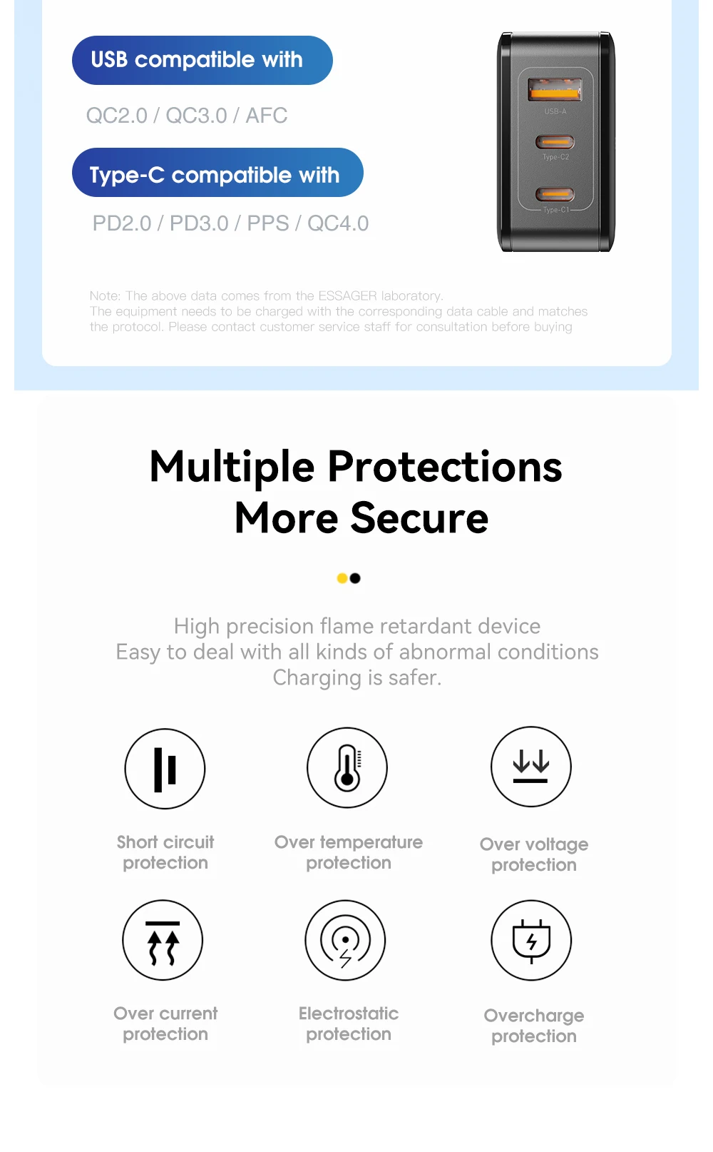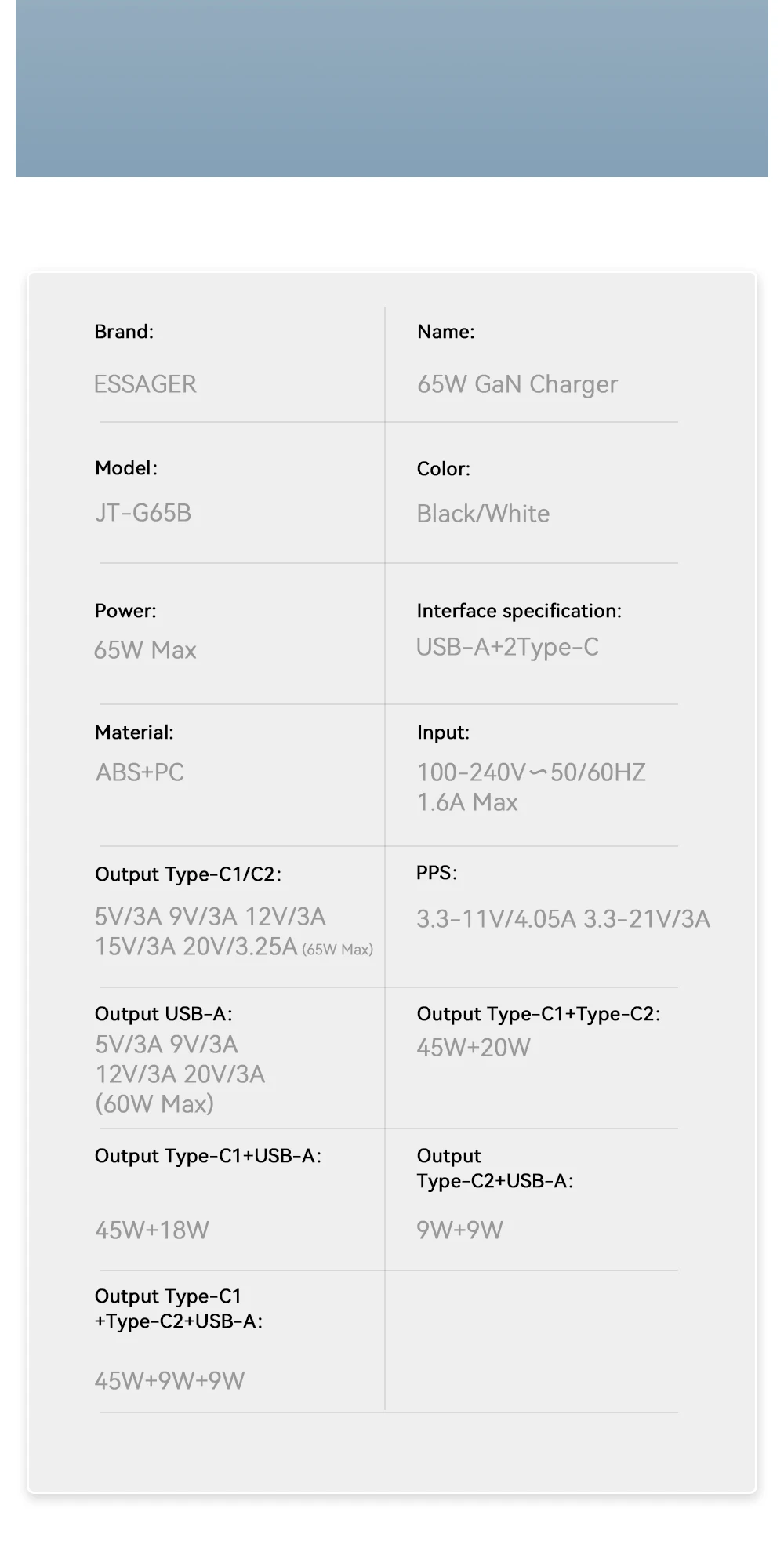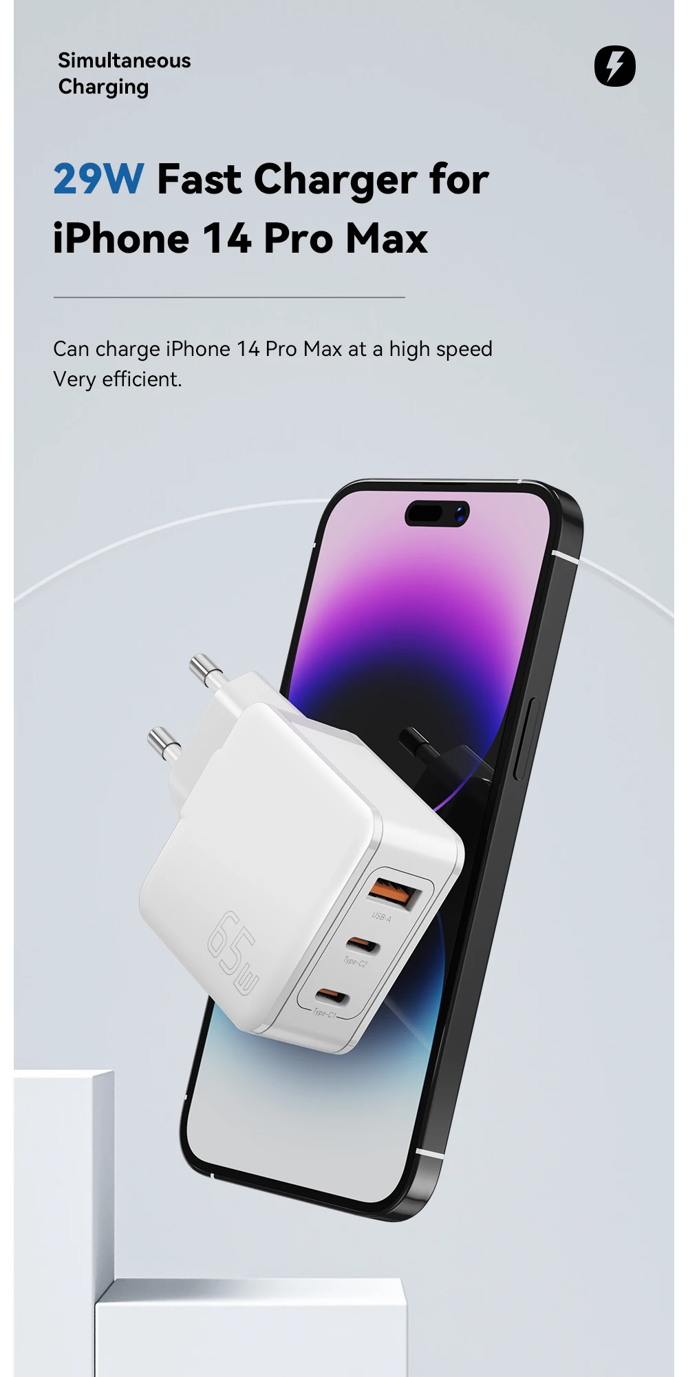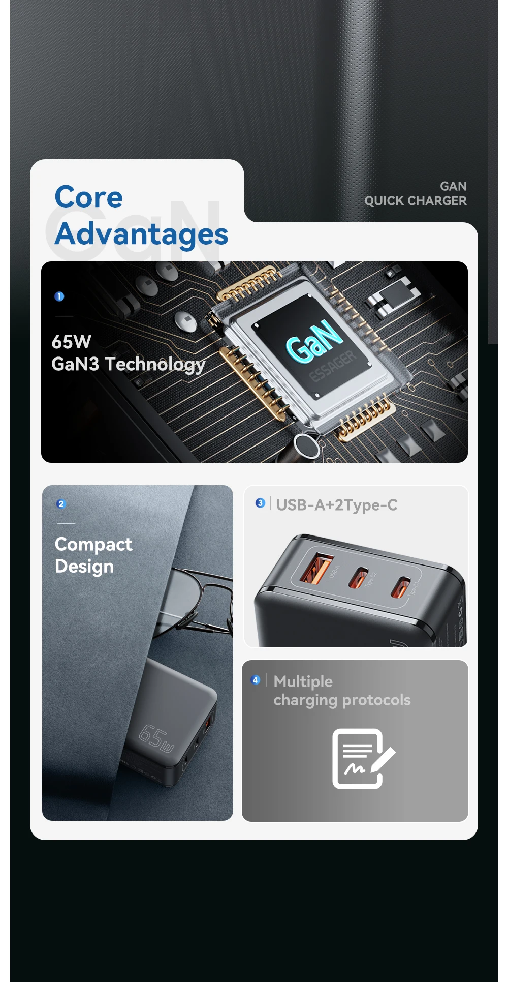 65W GaN Cargador de viaje 2C + A PD65W Carga rápida, Tres salidas, Protecciones múltiples, Tamaño pequeño