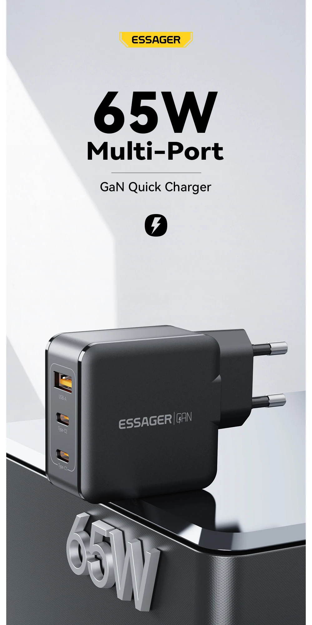 Comprar Essager-cargador GaN de 65W, adaptador de 3 puertos USB C para IPhone 14, 13, 12 Pro Max, Xiaomi 12, Samsung, IPad Pro, Cargador rápido de viaje