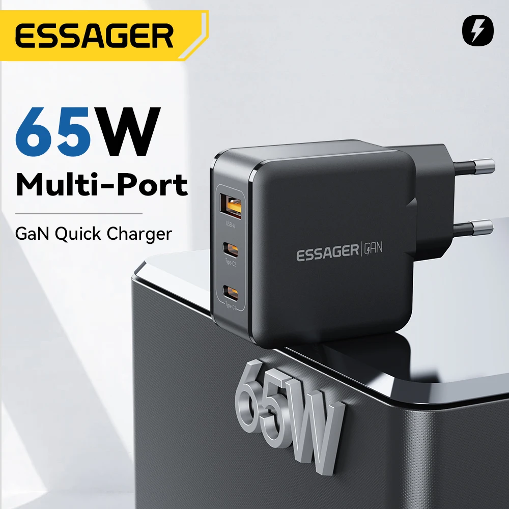 Comprar Essager-cargador GaN de 65W, adaptador de 3 puertos USB C para IPhone 14, 13, 12 Pro Max, Xiaomi 12, Samsung, IPad Pro, Cargador rápido de viaje