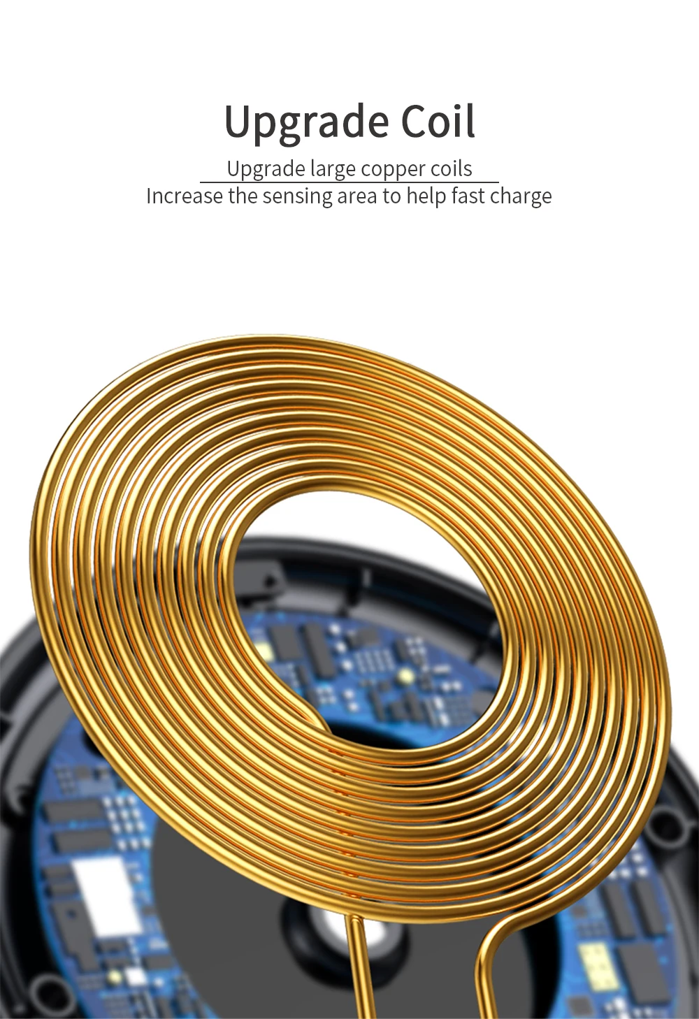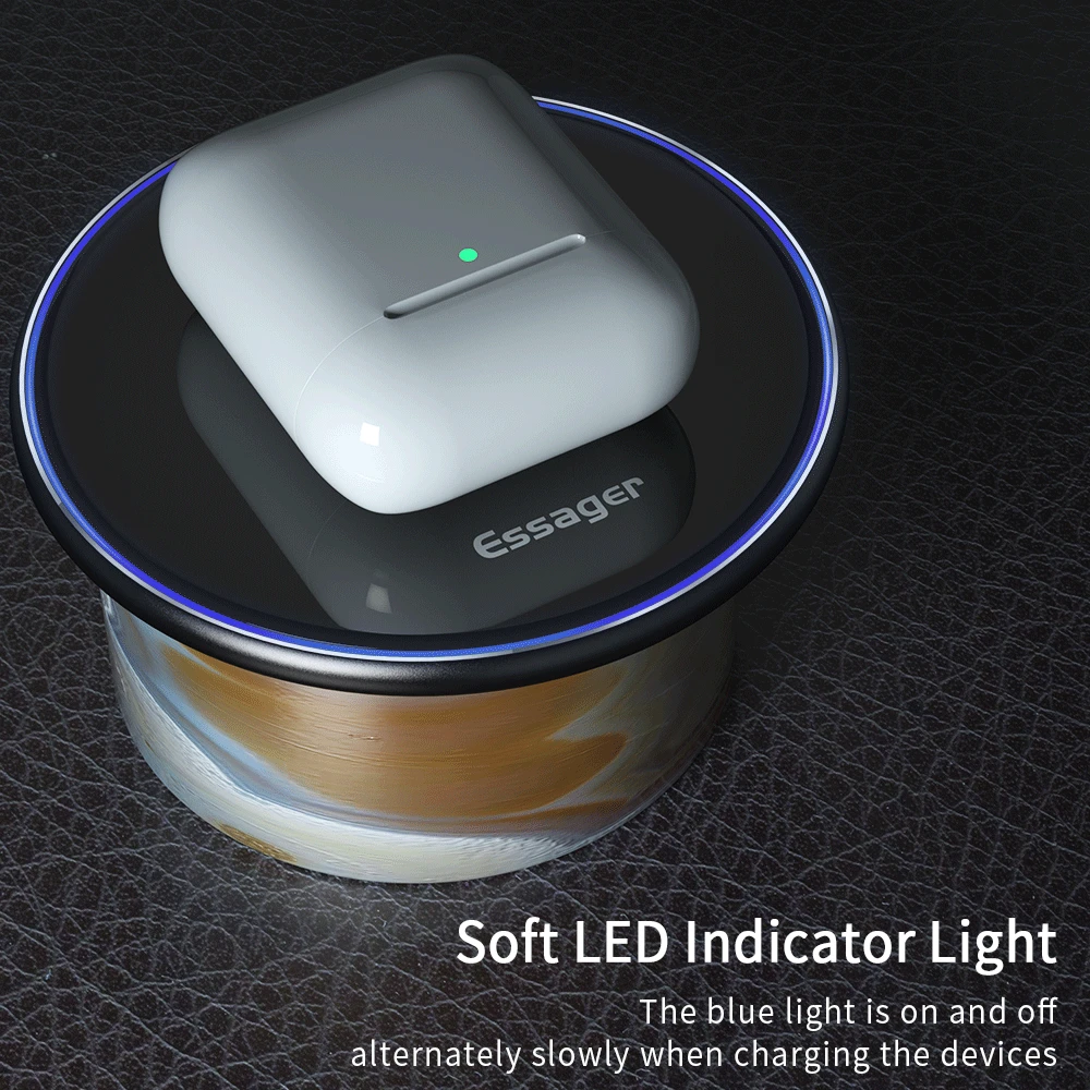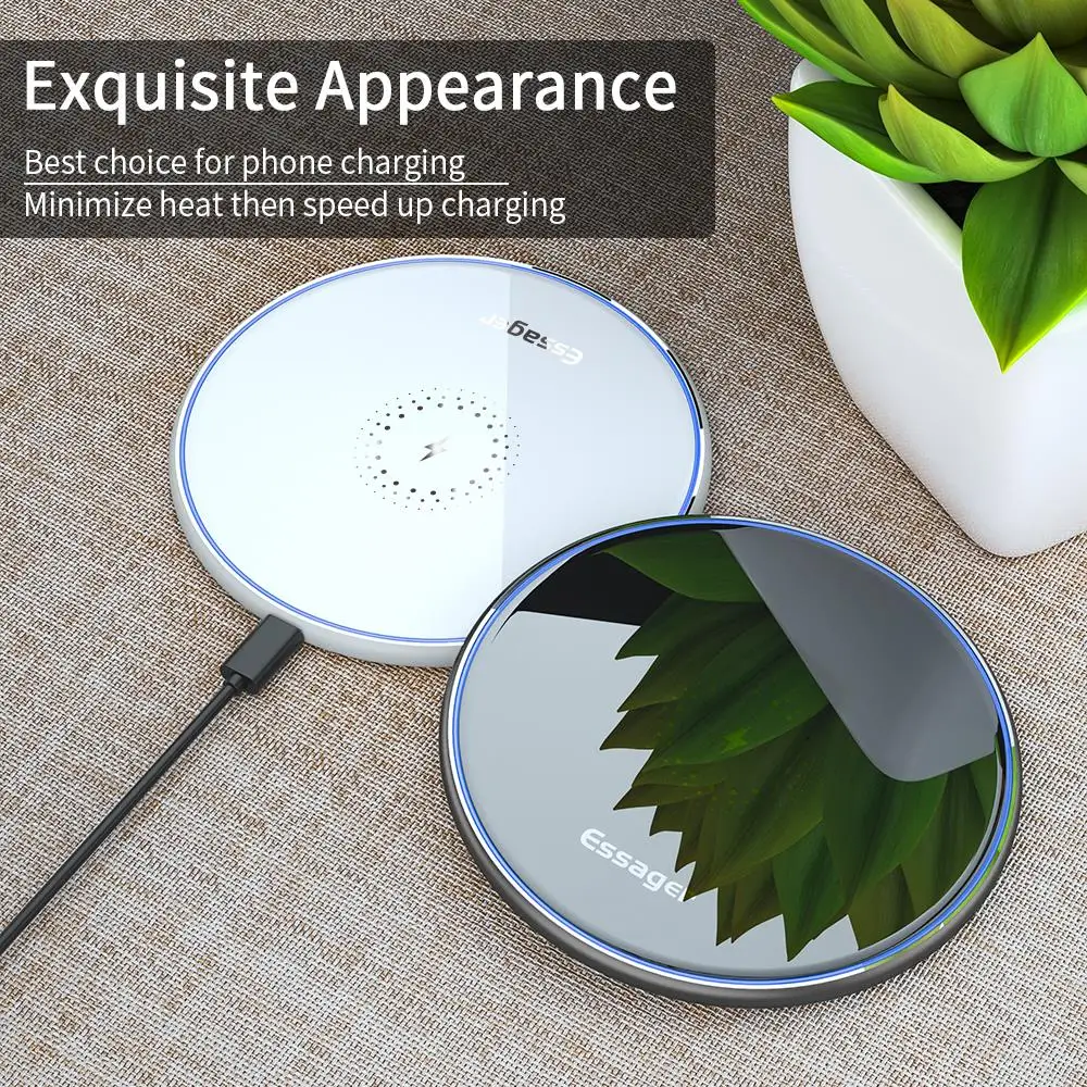 Cargador inalámbrico Qi de 10W Essager -Salida Modo de carga rápida de 10W: (con adaptador de carga rápida 2,0/3,0) Para Samsung Galaxy S20 / S10 / S9 + / S9 / S8 / S8 + / S7 borde/S7/S6 edge + Para Samsung Nota 10/nota 9/nota 8/7 Modo de carga rápida de 7,5 W: (Con adaptador de carga rápida 2,0/3,0) Para iPhone/11/11 Pro / 11 Pro Max / XS Max/XR iPhone/iPhone XS / iPhone X/8/8 Plus 5W modo de carga estándar: (con adaptador de 5V/2A) Para todos los demás teléfonos y dispositivos habilitados para Qi -Entrada Micro USB: DC 5V/2A. DC 9V/1.67A. Tamaño: 10,1*7cm Material: aleación de aluminio Característica -Poner y cargar -Luz suave LEDIndicator -Reconocimiento de objetos extraños -Anti-diseño antideslizante