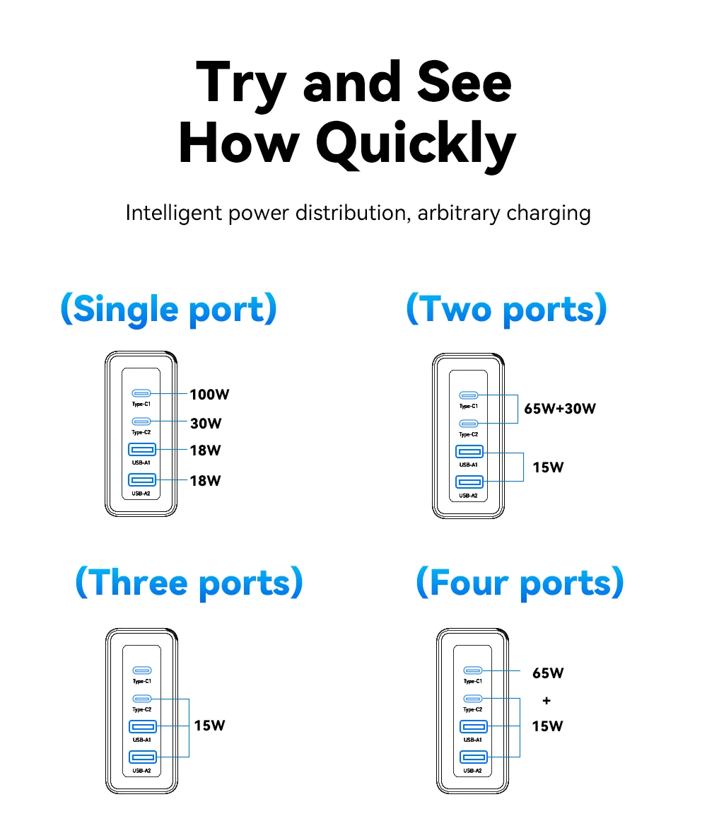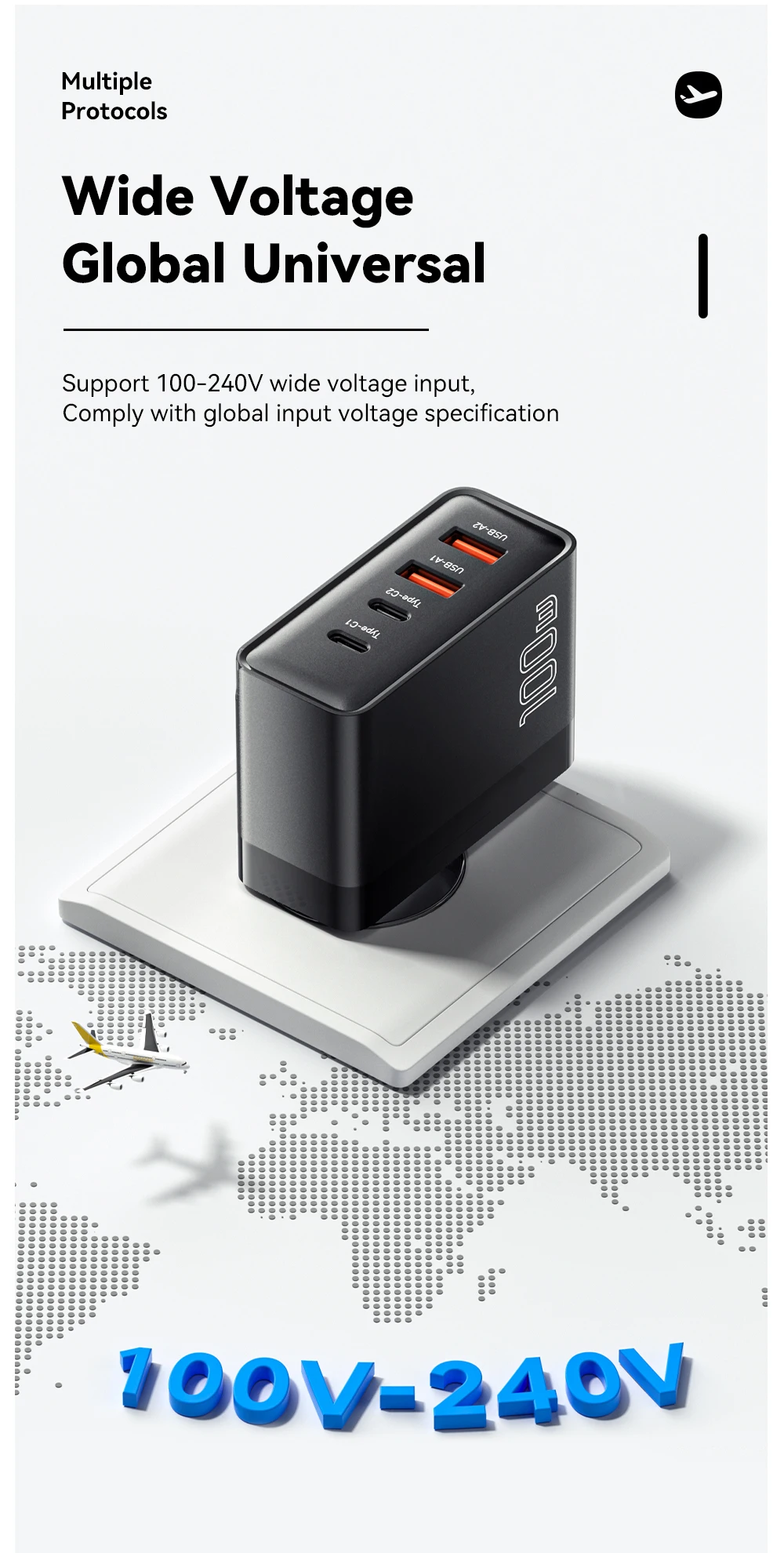 Característica 1:Combinación de cuatro puertos 100W2C2A, adecuada para la carga simultánea de múltiples dispositivos (portátiles, tabletas, teléfonos, auriculares).