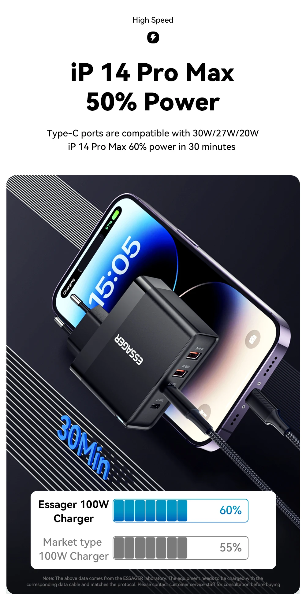 Característica 3:Carga rápida PD, hasta 60% de carga para IP14 en 30 minutos, hasta 60% de carga para iPad en 30 minutos y hasta 50% de carga para Macbook Pro en 16 pulgadas en 30 minutos.