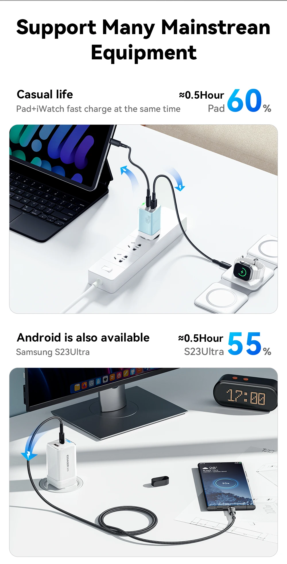Para dispositivos de la serie Samsung Galaxy:Nuestro cargador de 45W con carga súper rápida admite carga de 45W.
