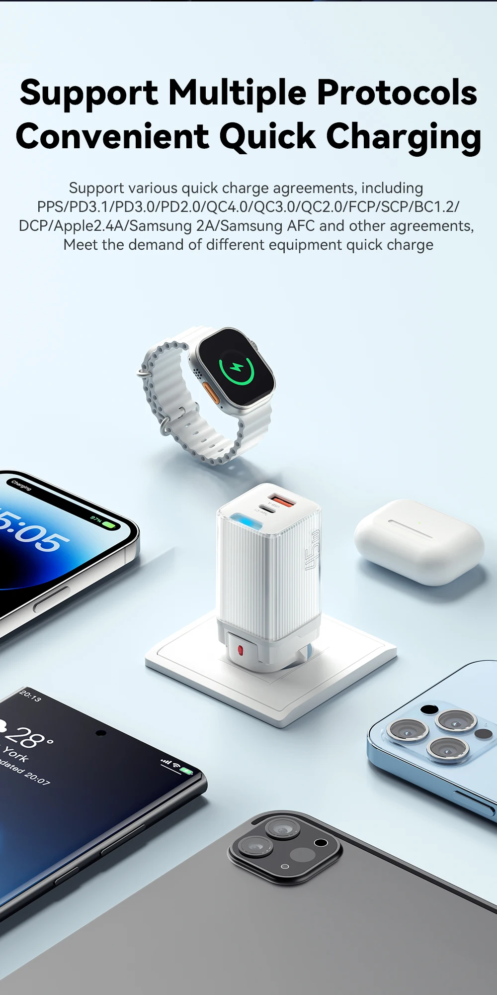 PD3.0 、 PPS 、 QC4 +(QC4.0/QC3.0)、 FCP 、 AFC 、 APPLE 5V2.4A 、 BC1.2