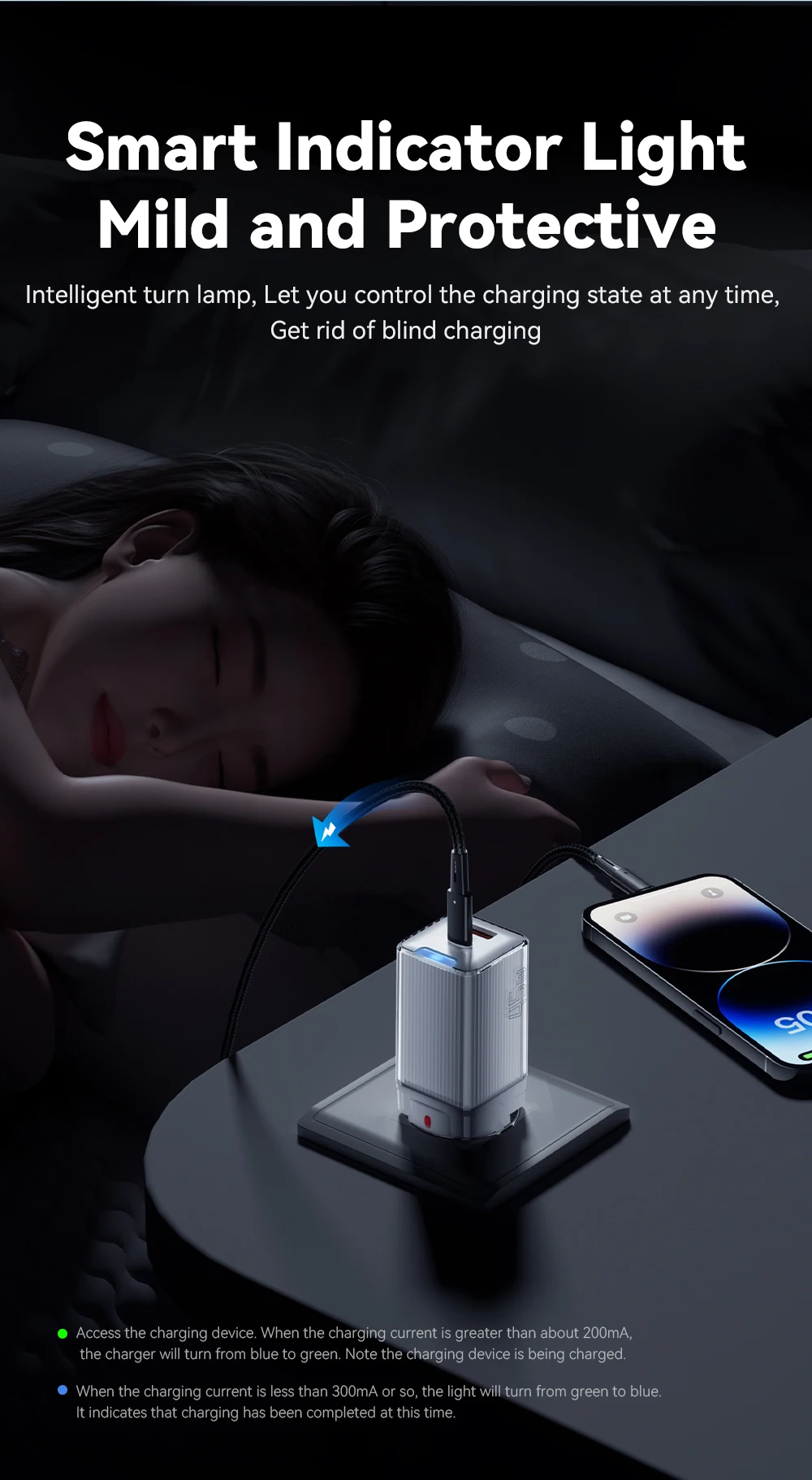 2. Conecte cuando la corriente de carga y el dispositivo de carga sea superior a aproximadamente 200mA, el cargador cambiará de una luz azul a una luz verde. Indica que el dispositivo de carga se está cargando actualmente;