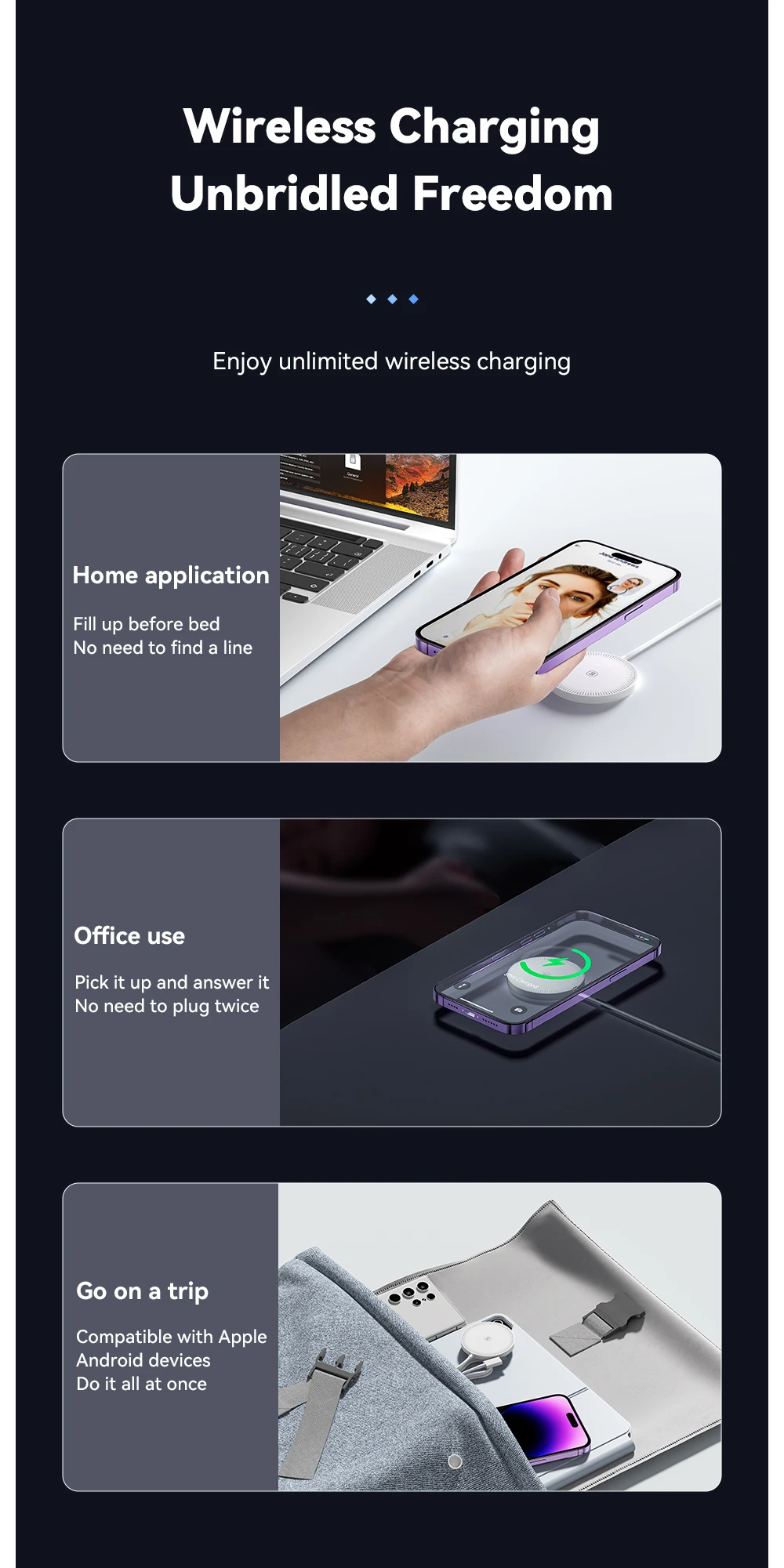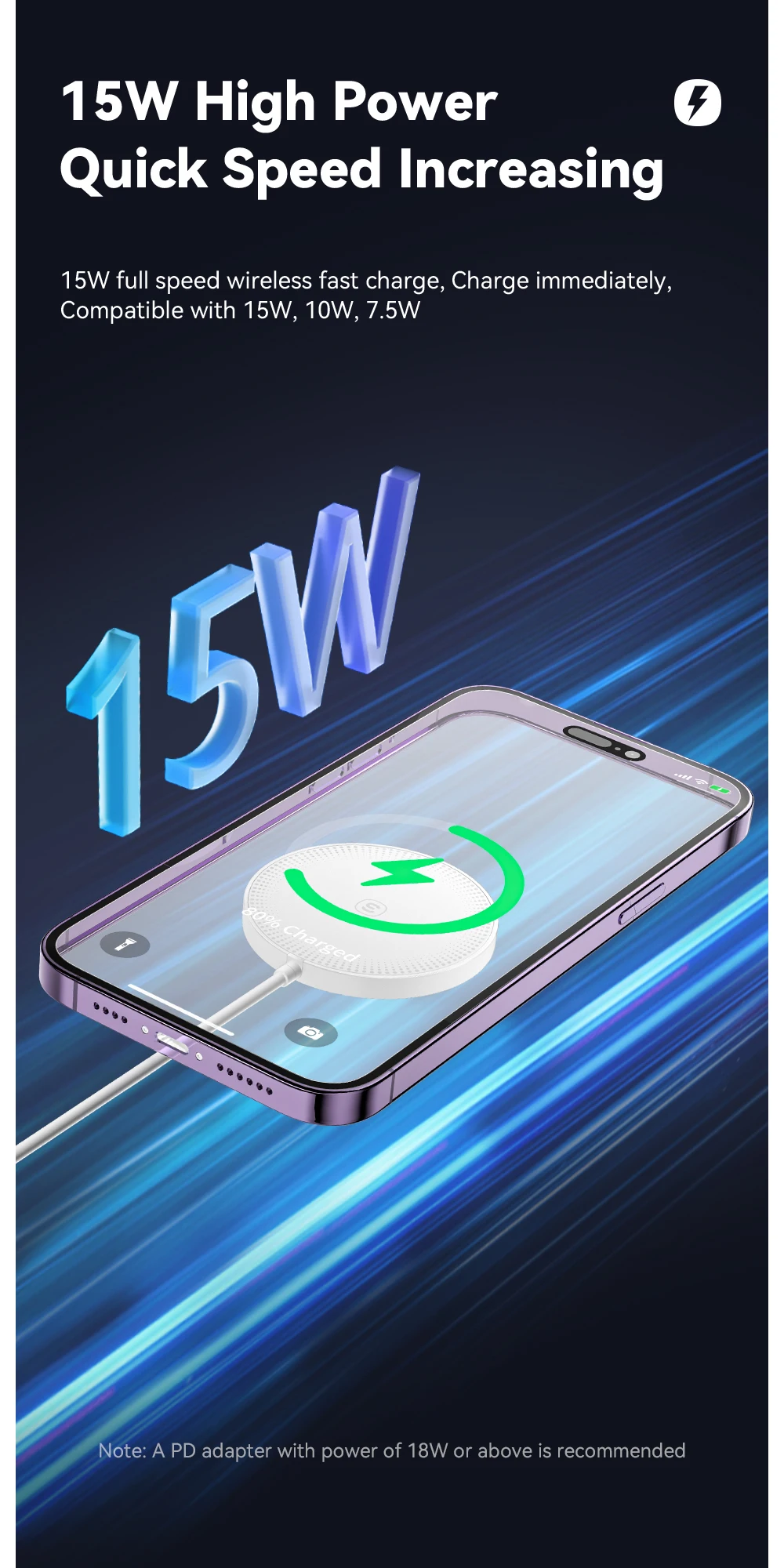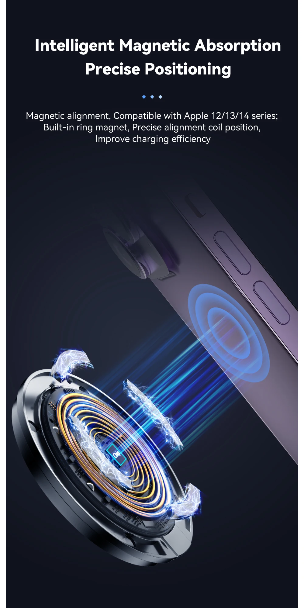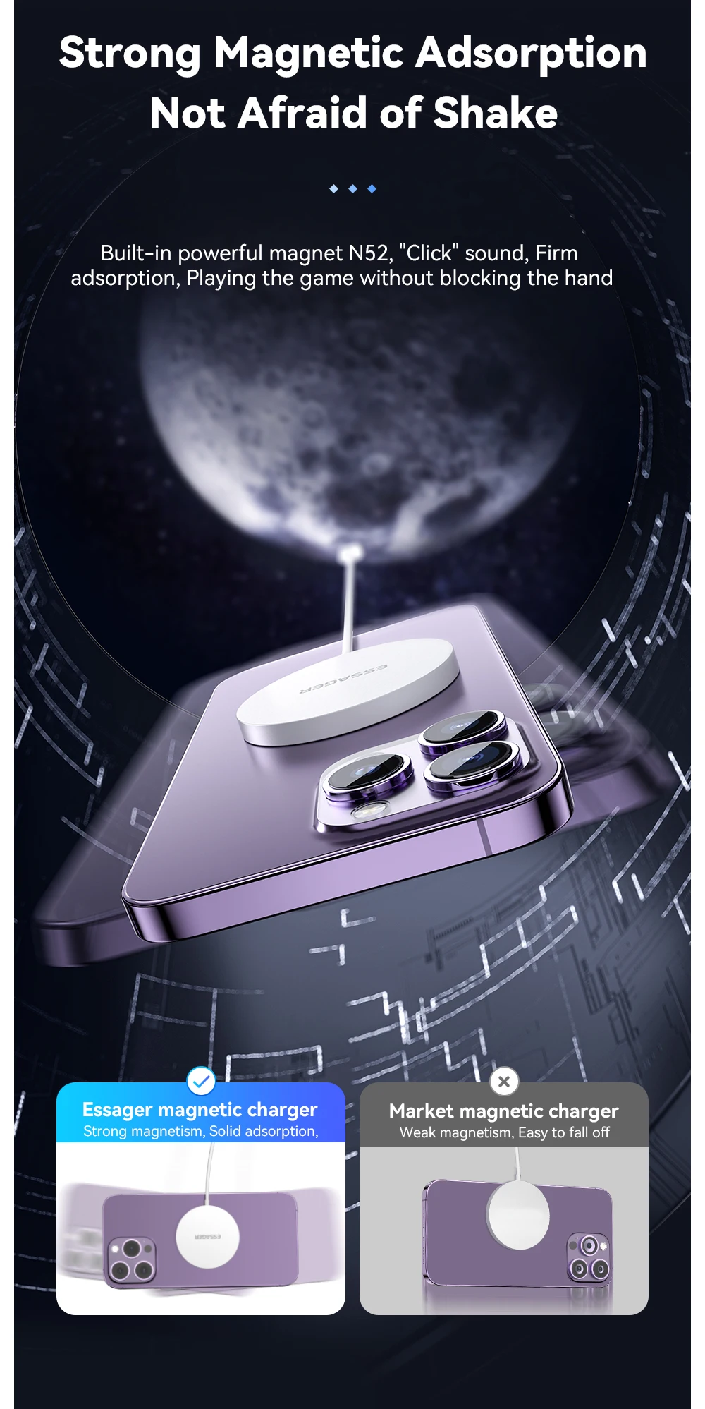 5W/7,5W/10W/15wConsejos:1.Carga inalámbrica magnética rápida delgada de 15 W personalizada para la serie iPhone 12 13 14.Le recomendamos que utilice el adaptador Essager PD de 20 W como compañero perfecto para este cargador inalámbrico magnético.2.2.La carga inalámbrica magnética se absorbe automáticamente y se alinea con precisión, lo que aumenta la eficiencia de carga en un 50%.3.3.Admite múltiples modos de carga de 5W/7,5W/10W/15W, la carga inteligente y rápida no dañará la máquina4.Equipado con un cable tipo C de 1 m, libre de moverse durante la carga, juegue desde cualquier ángulo sin restriccionesDescripción:Cargador inalámbrico magnético de 15w para iPhone 12 13 14 Pro Max Mini. Admite carga rápida PD.