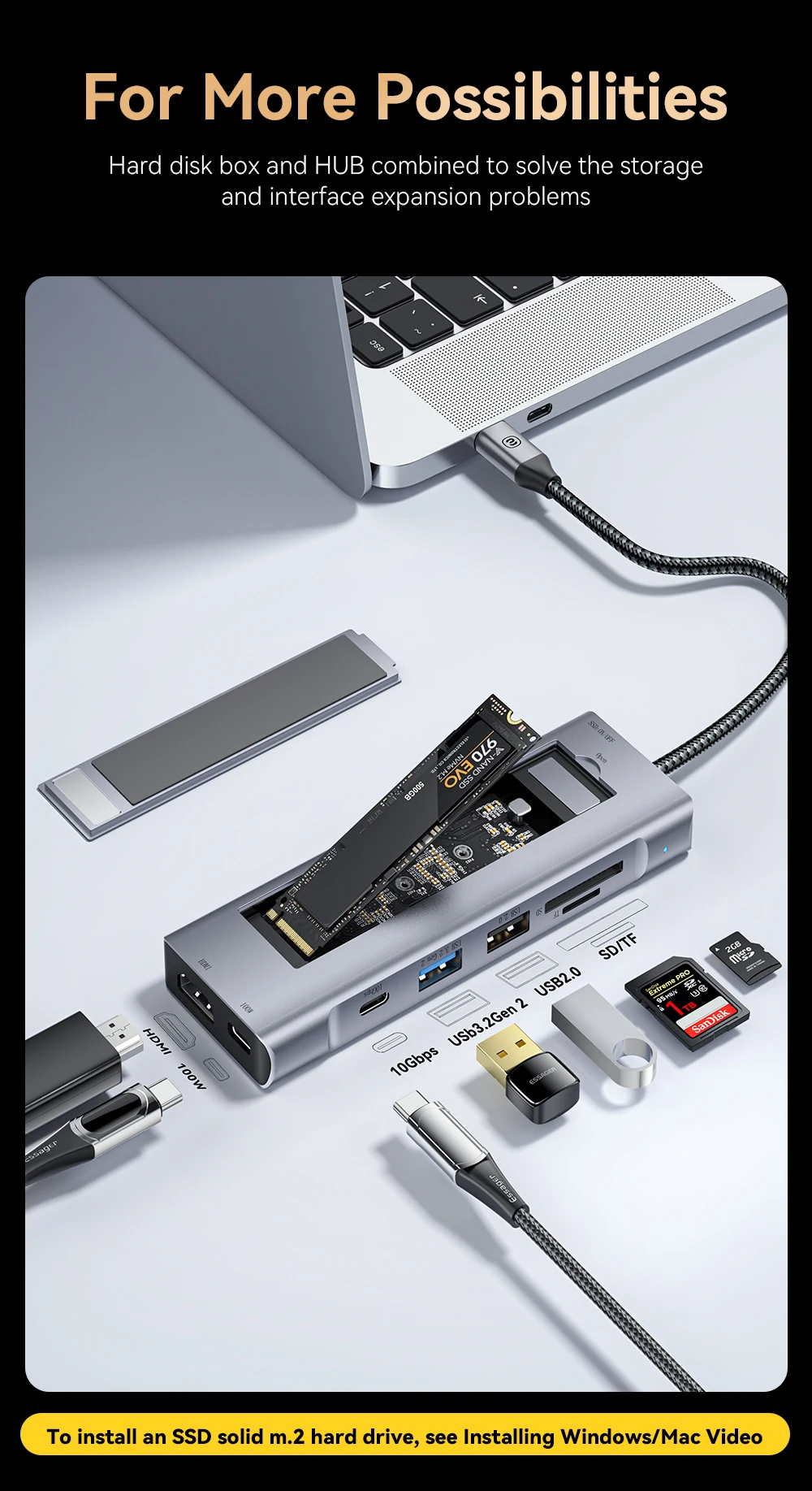 Característica 2: 8 concentradores de interfaz, respectivamente M.2 SSD Disco Duro Caddy/USB3.2 / USB 2,0/HDMI/Tipo-c 100W/Tipo-c 10Gpbps / SD / TF,