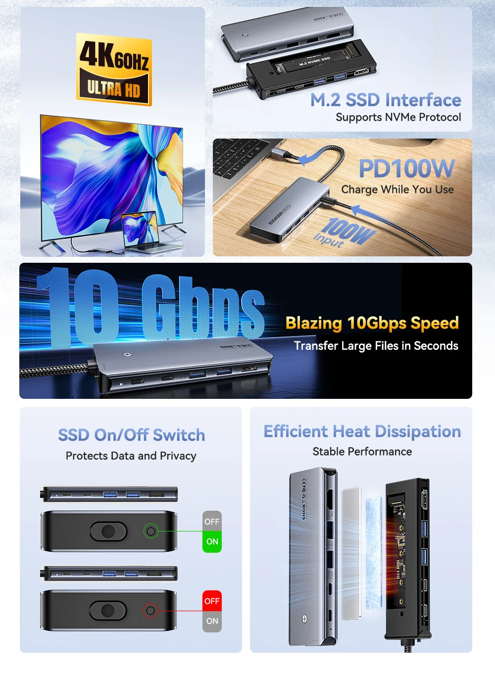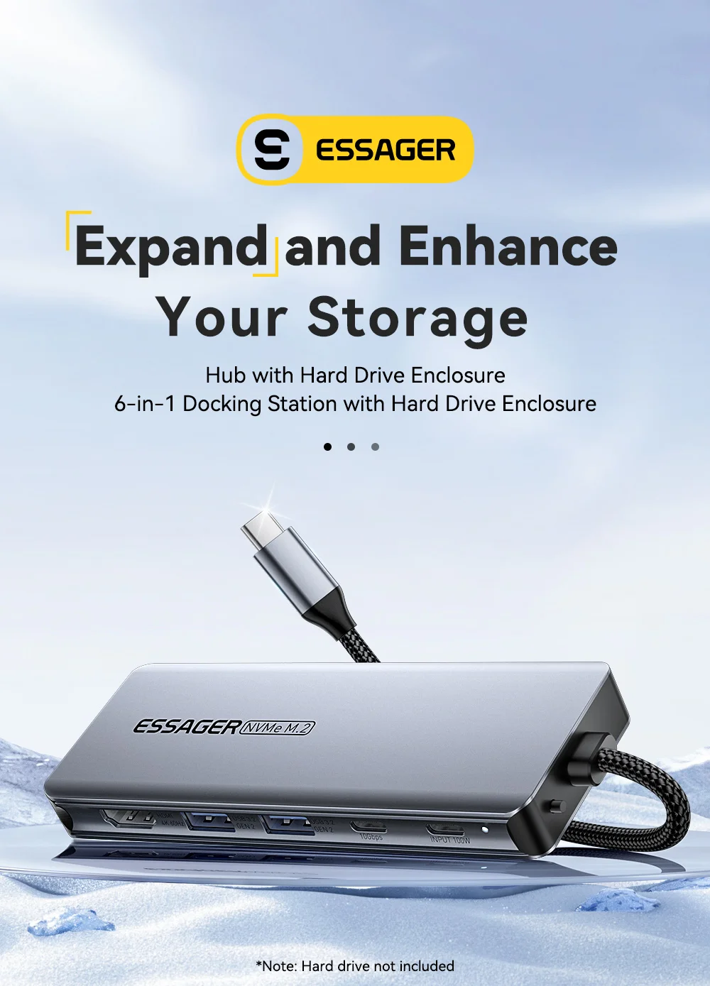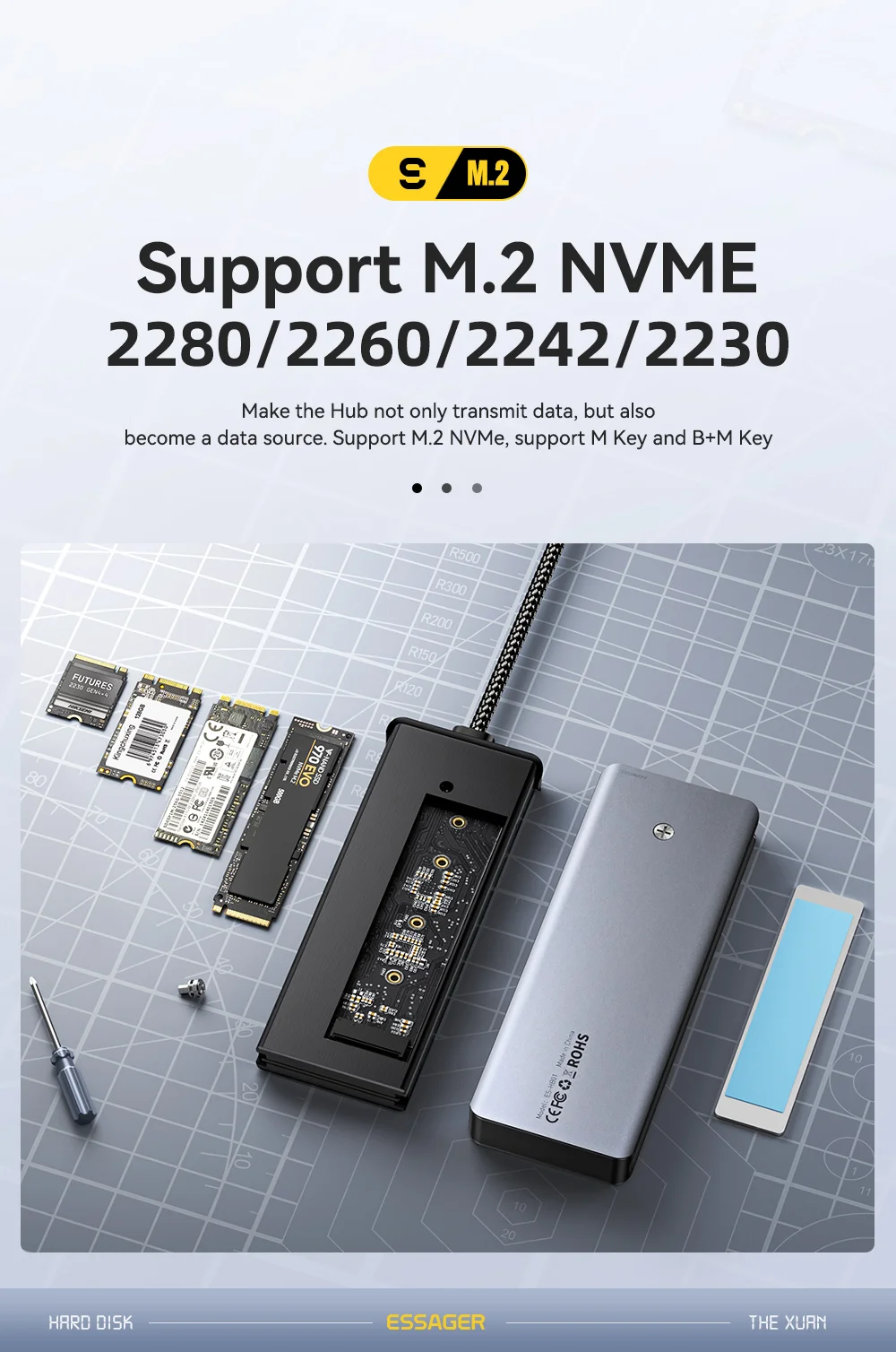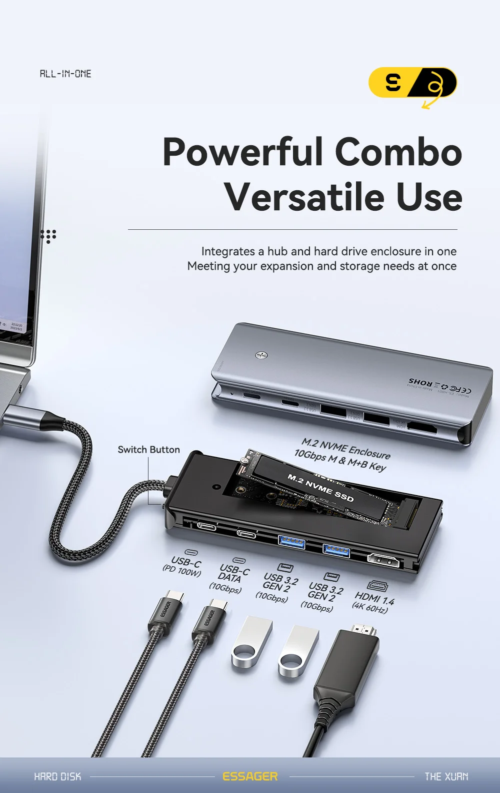 Comprar Essager-Hub USB tipo C con carcasa de disco duro M.2 SSD, adaptador 6/7 en 1 PD100W USB3.2 10gbps HDMI USB tipo C para Macbook Pro Air PC