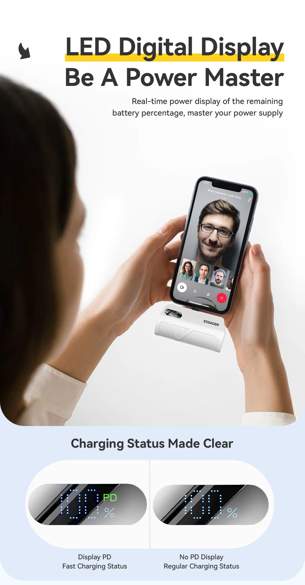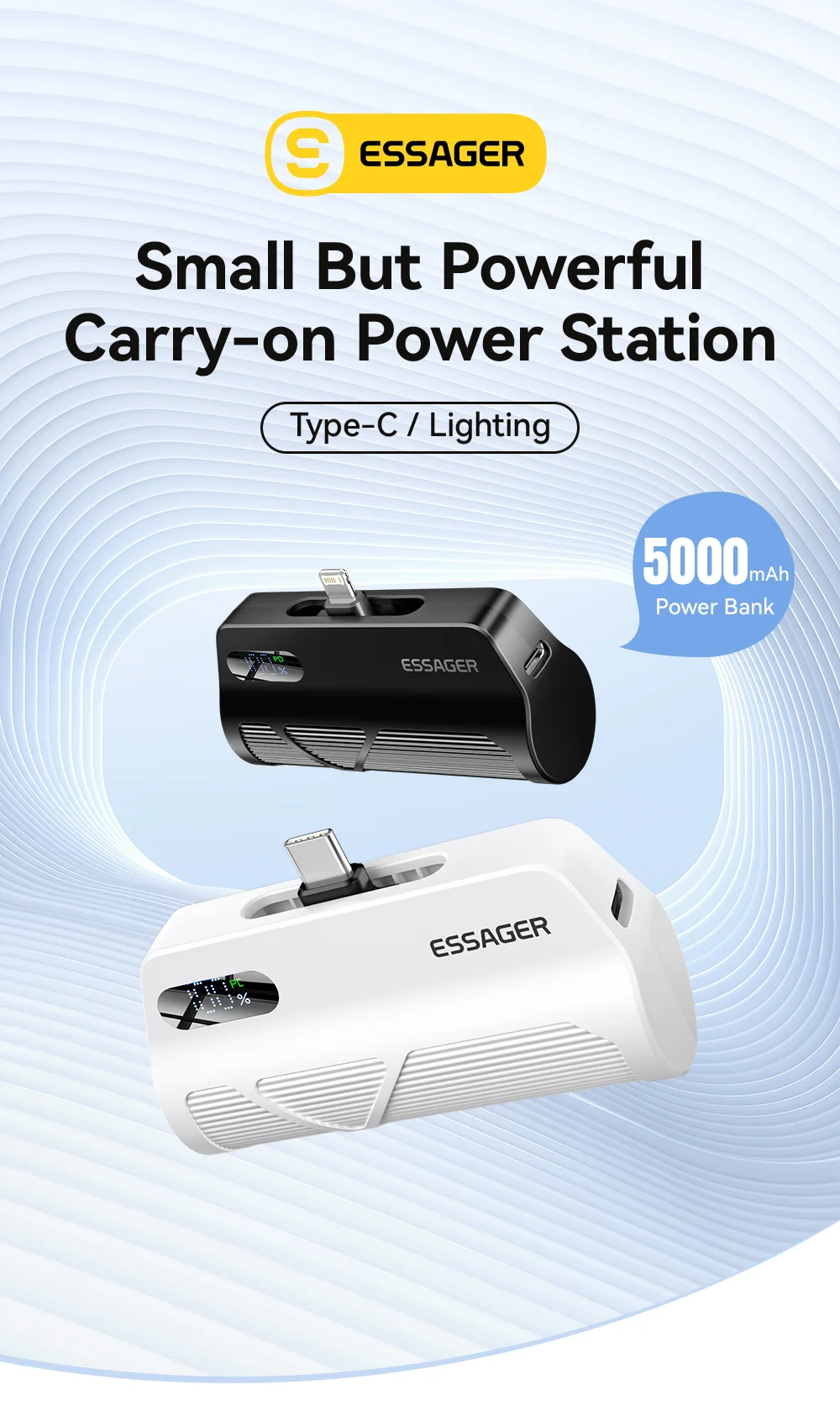 El banco de energía portátil en cápsula de 5000 mAh con enchufes de carga tipo C y Lightning satisface todas sus necesidades de energía portátil. Este banco de energía está diseñado para brindarle un banco de energía portátil, equipado con interfaces tipo C y Lightning, lo que garantiza la compatibilidad con varios dispositivos, incluidos teléfonos inteligentes, tabletas, cámaras y más.