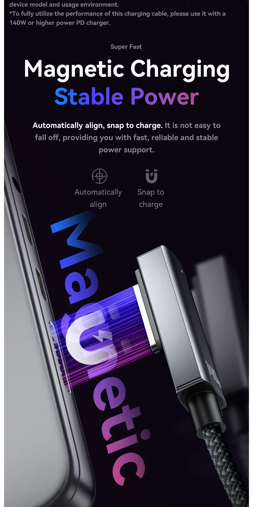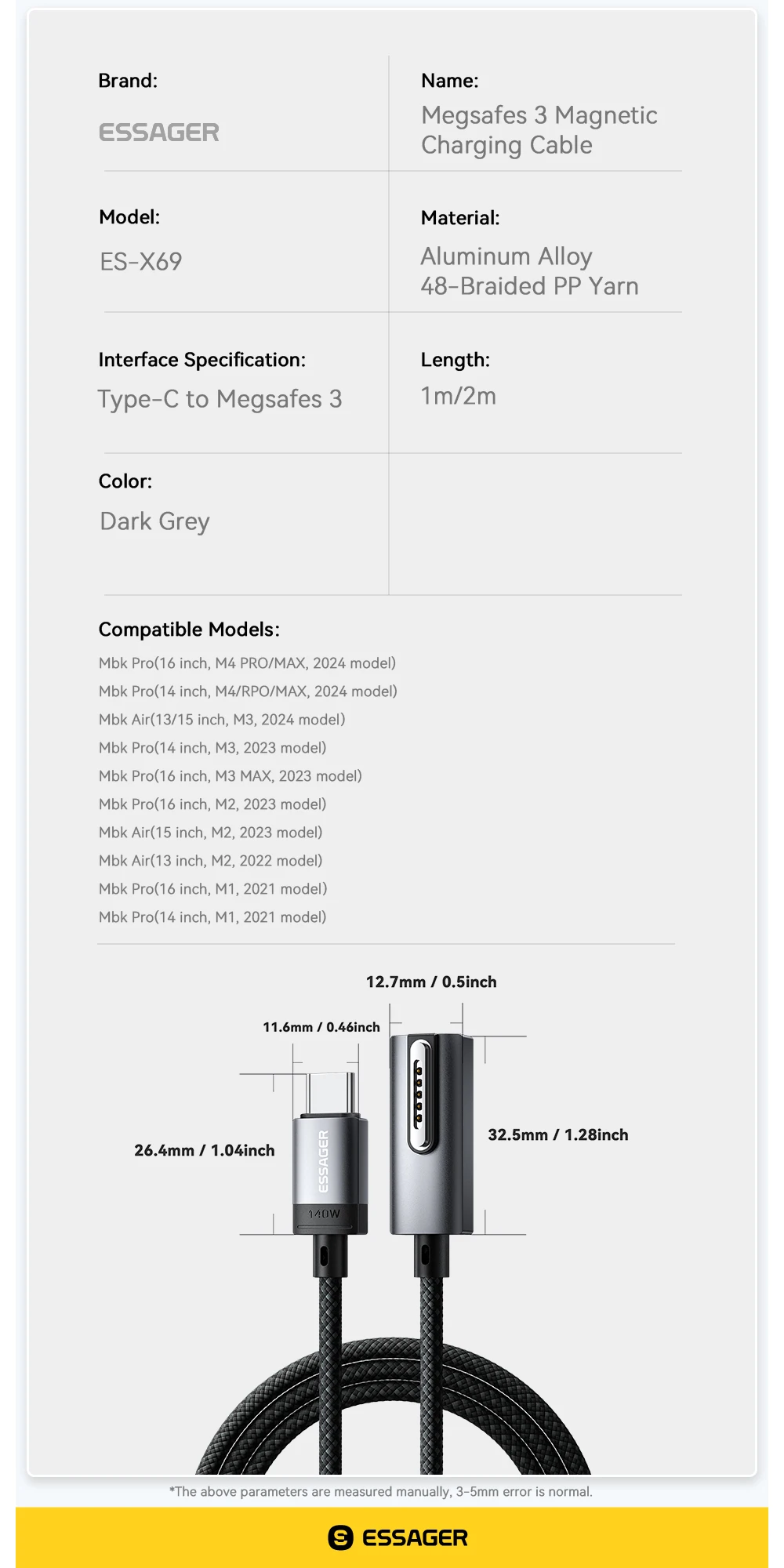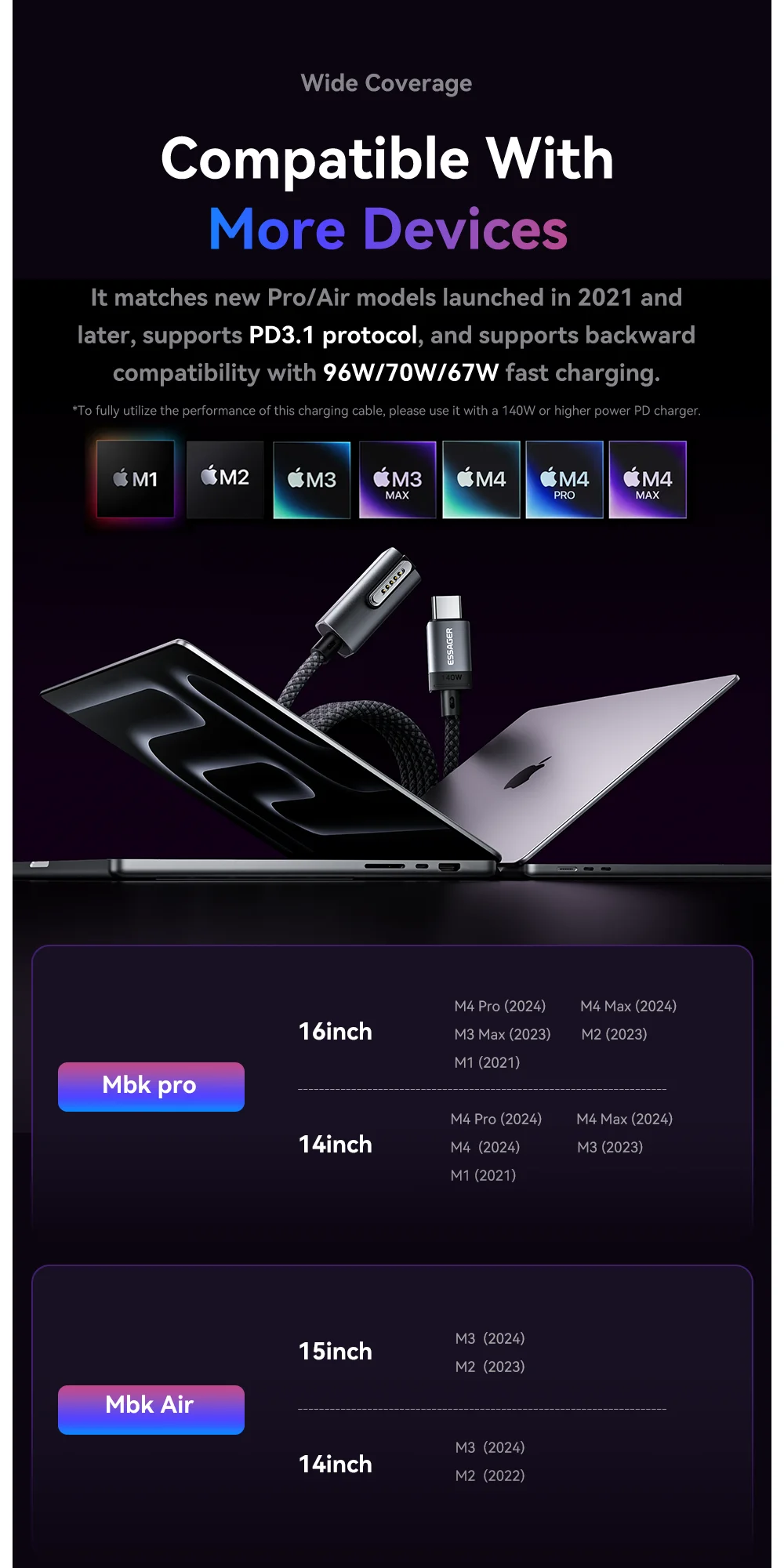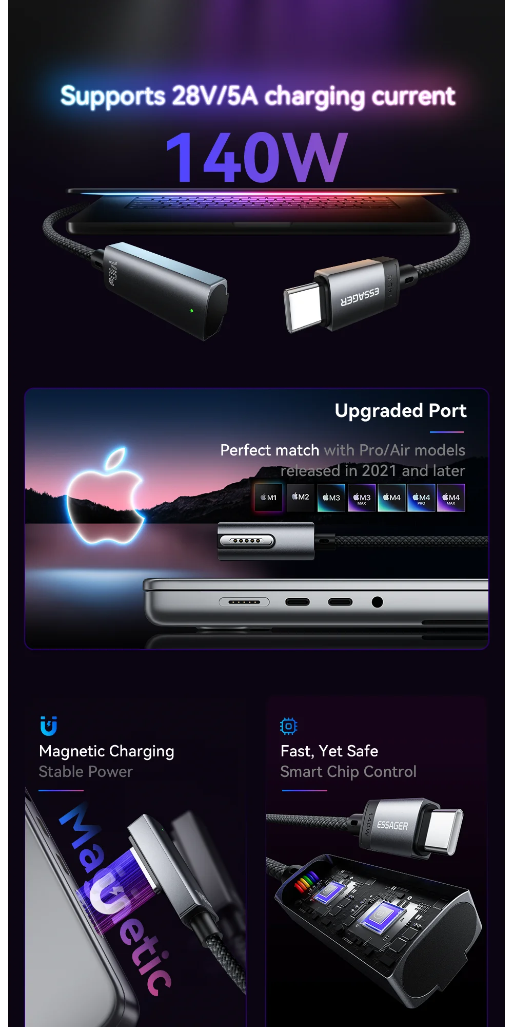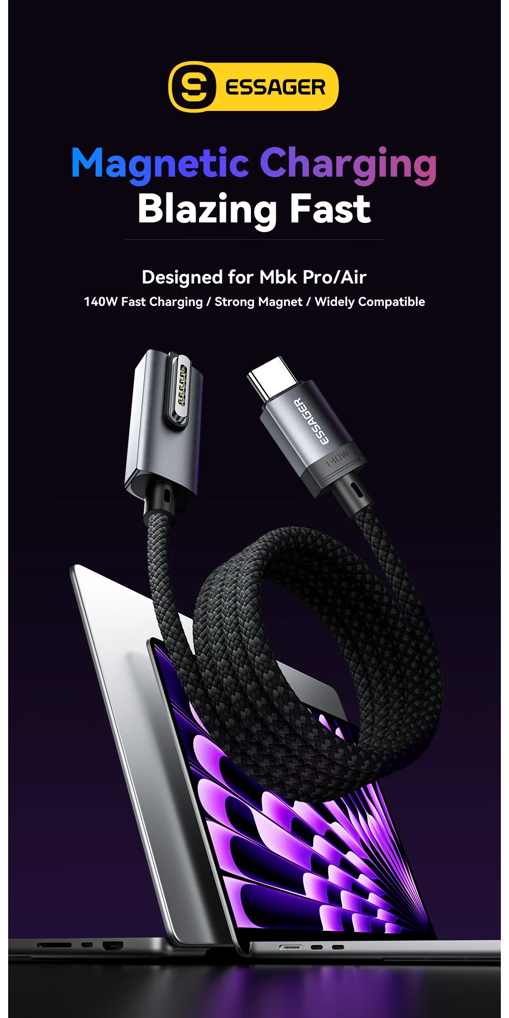 Essager USB tipo C a Magsafe 3 Cable cargador magnético portátil Cable de carga rápida PD3.1 140W para Macbook Pro Air 13 16 14 M1 M2
