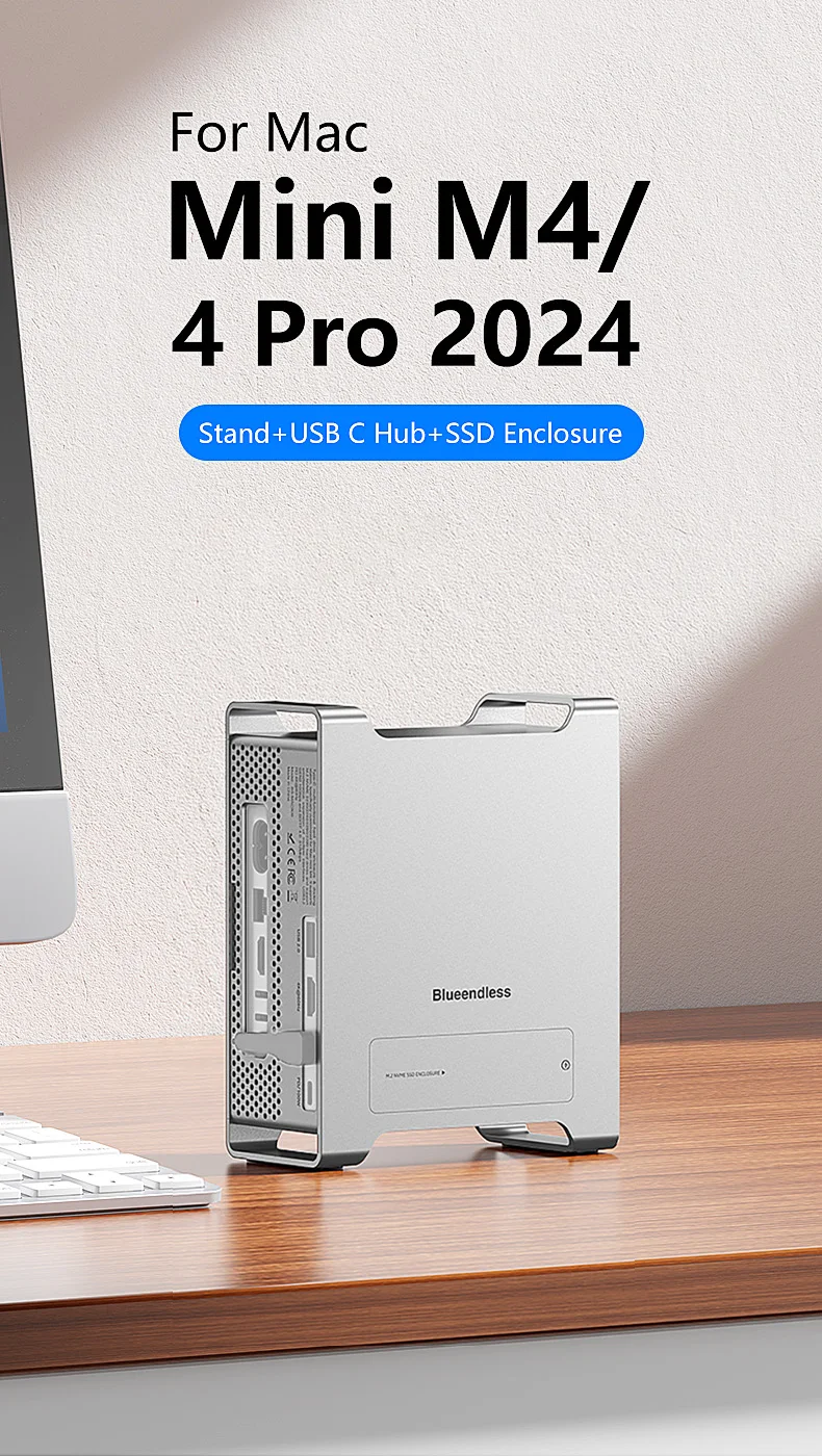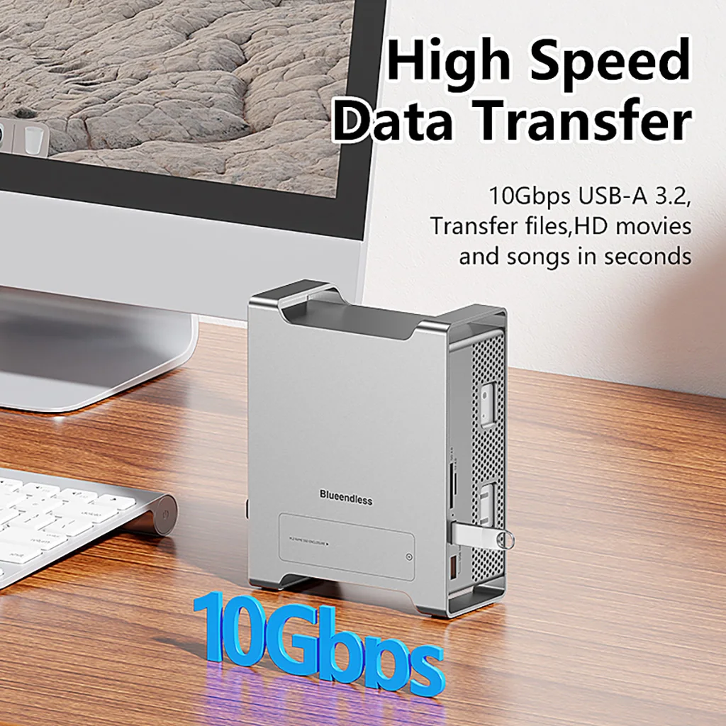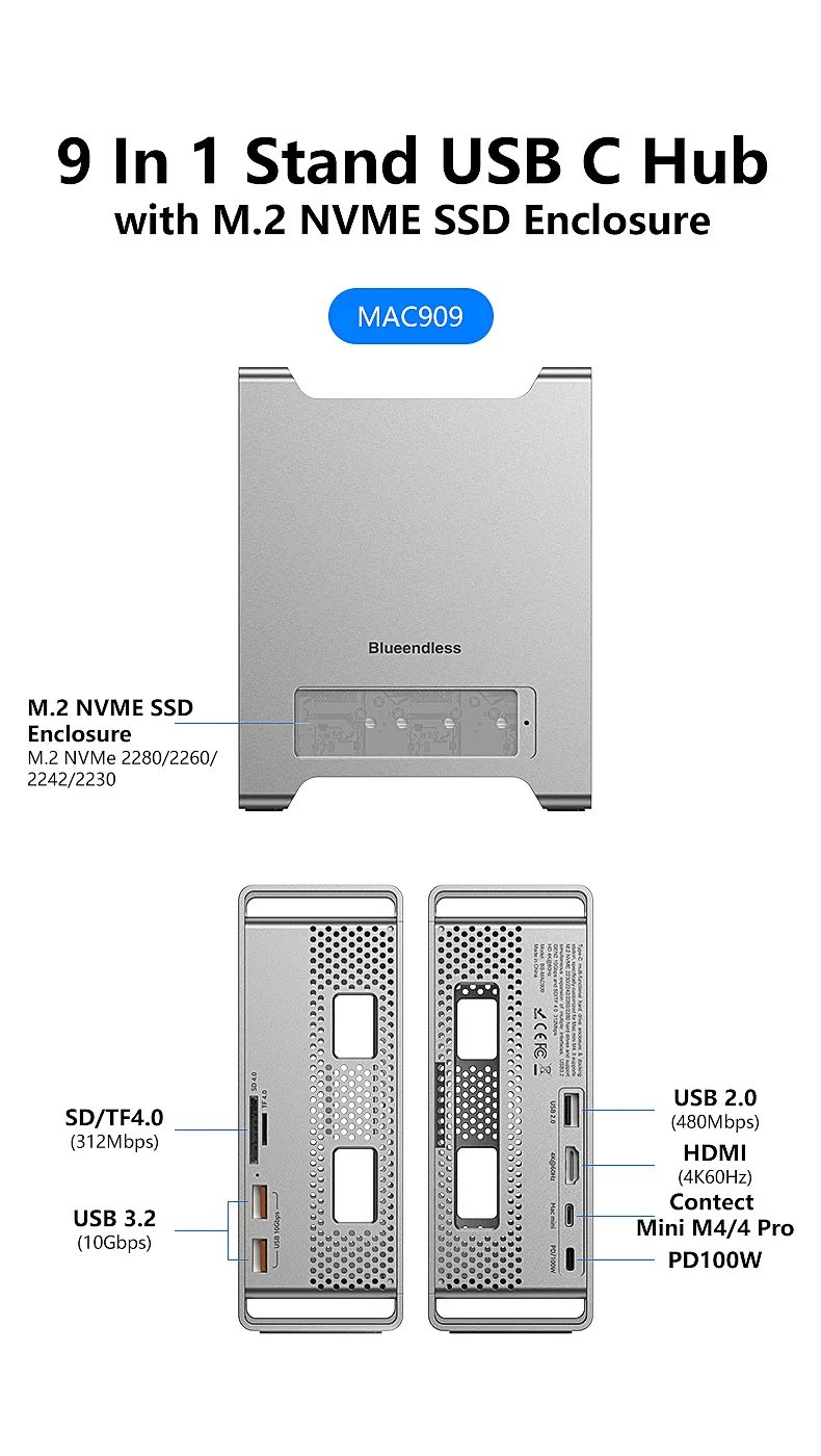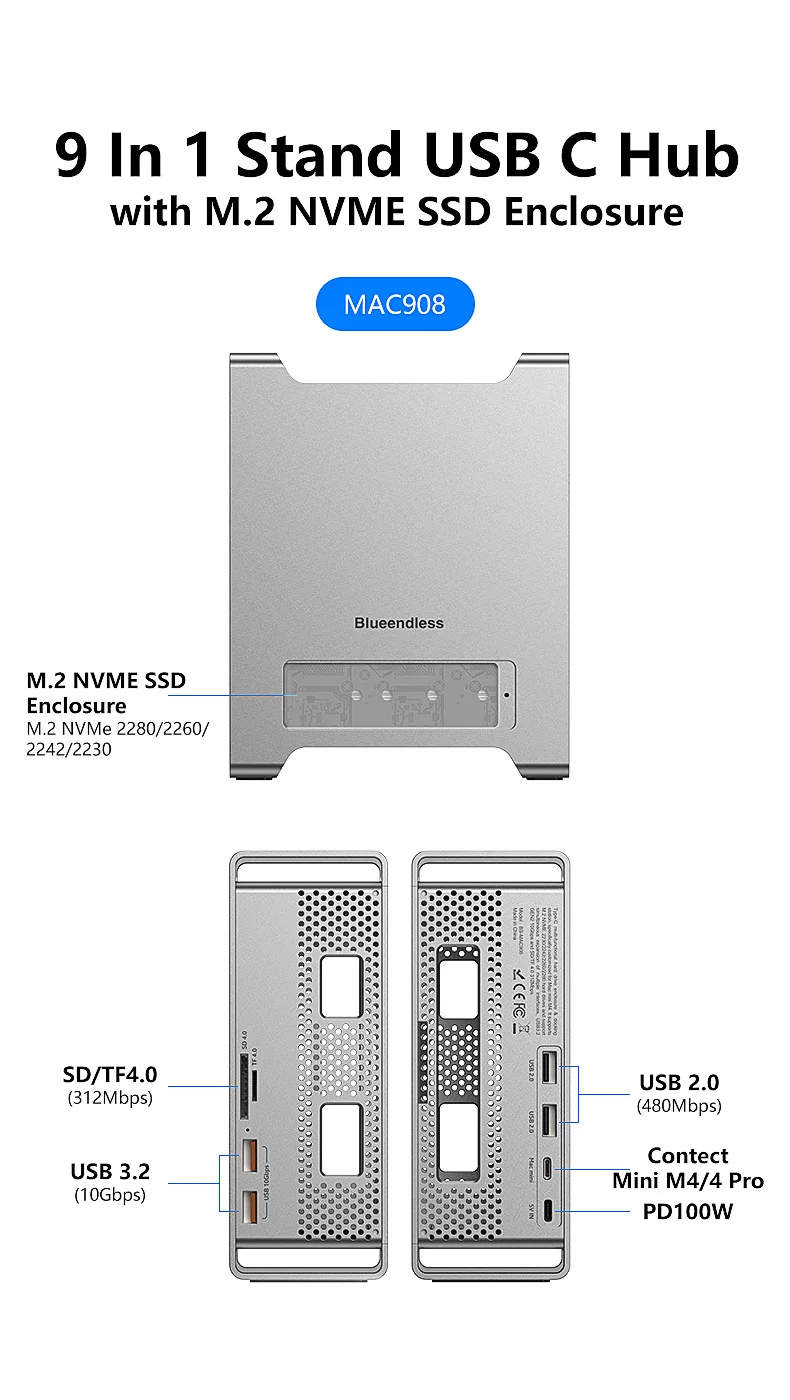 Estación de acoplamiento Blueendless tipo C para Mac Mini M4 Soporte y base de concentrador USB con 10 Gbps USB 3,2 USB 2,0 SD TF M.2 para carcasa NVME de aluminio
