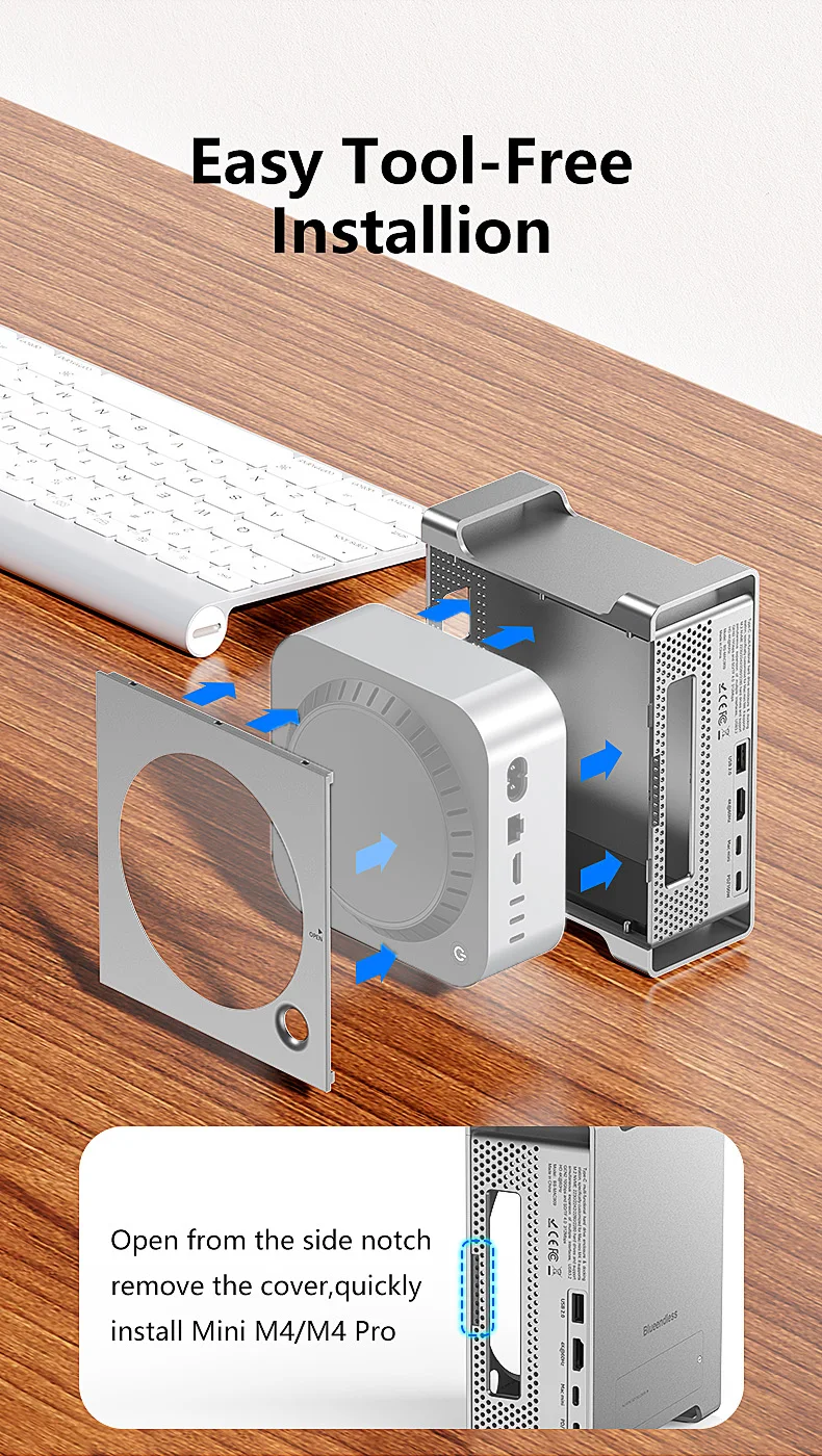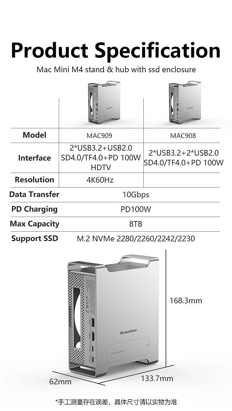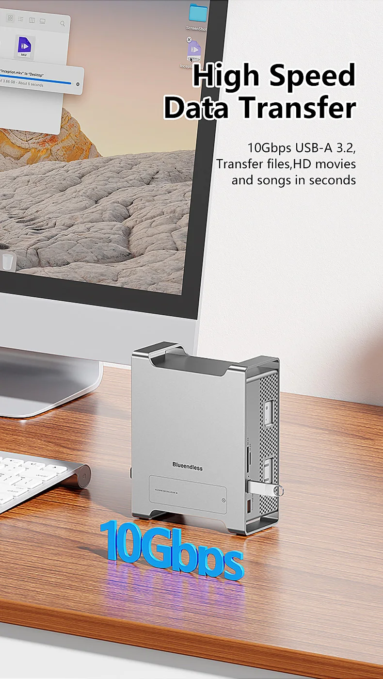 Estación de acoplamiento Blueendless tipo C para Mac Mini M4 Soporte y base de concentrador USB con 10 Gbps USB 3,2 USB 2,0 SD TF M.2 para carcasa NVME de aluminio