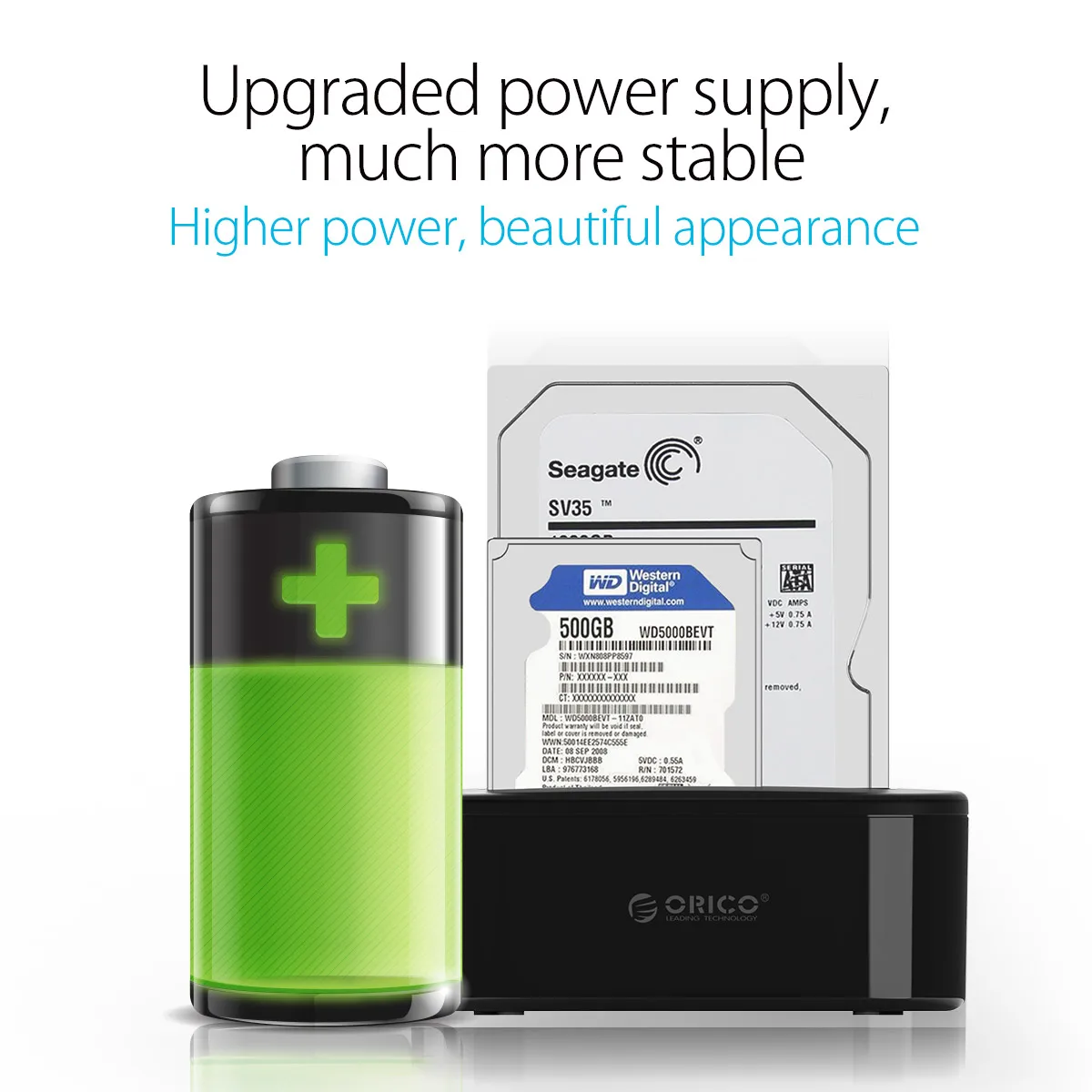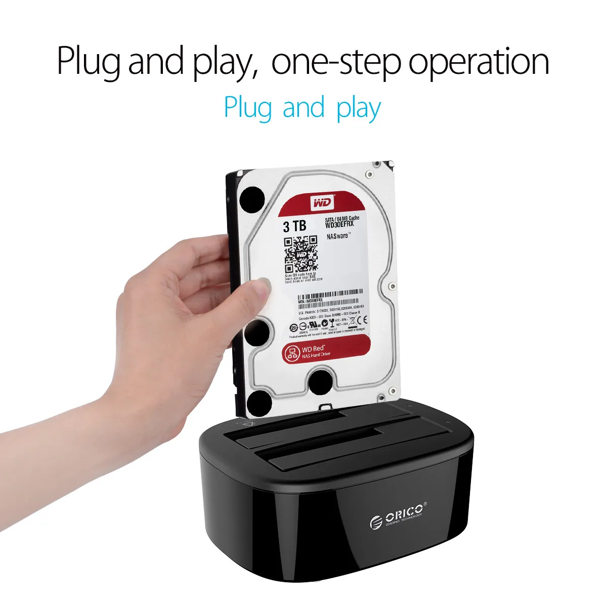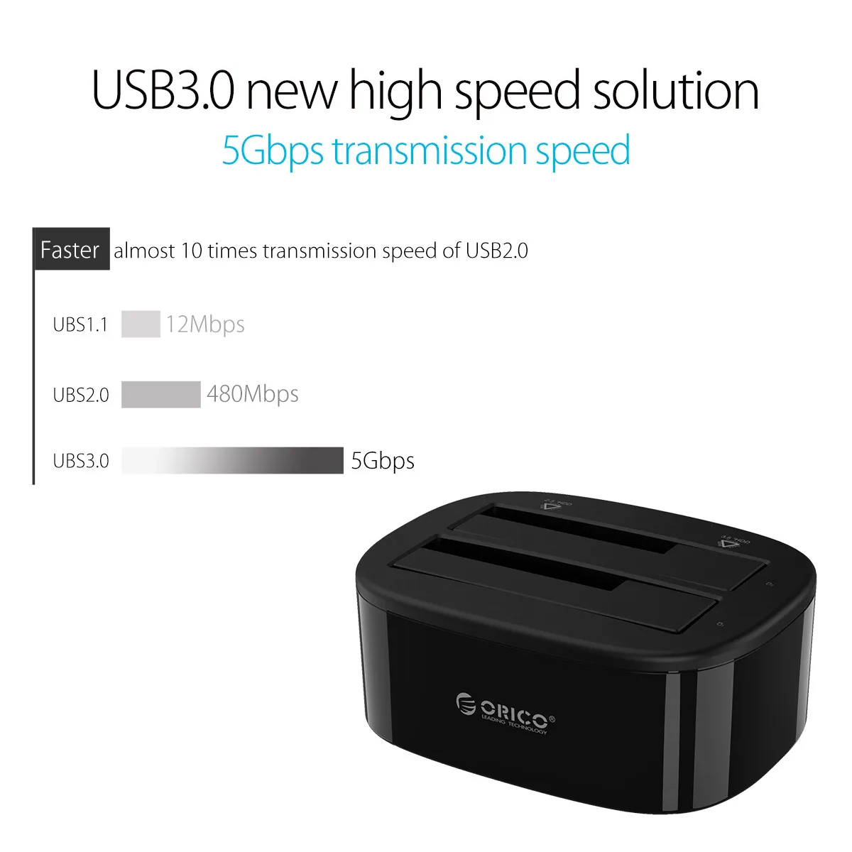 Comprar Estación de acoplamiento de disco duro ORICO de doble bahía para HDD SSD SATA de 2,5/3,5 pulgadas a USB 3,0 estación de acoplamiento HDD con adaptador de corriente 12V3A