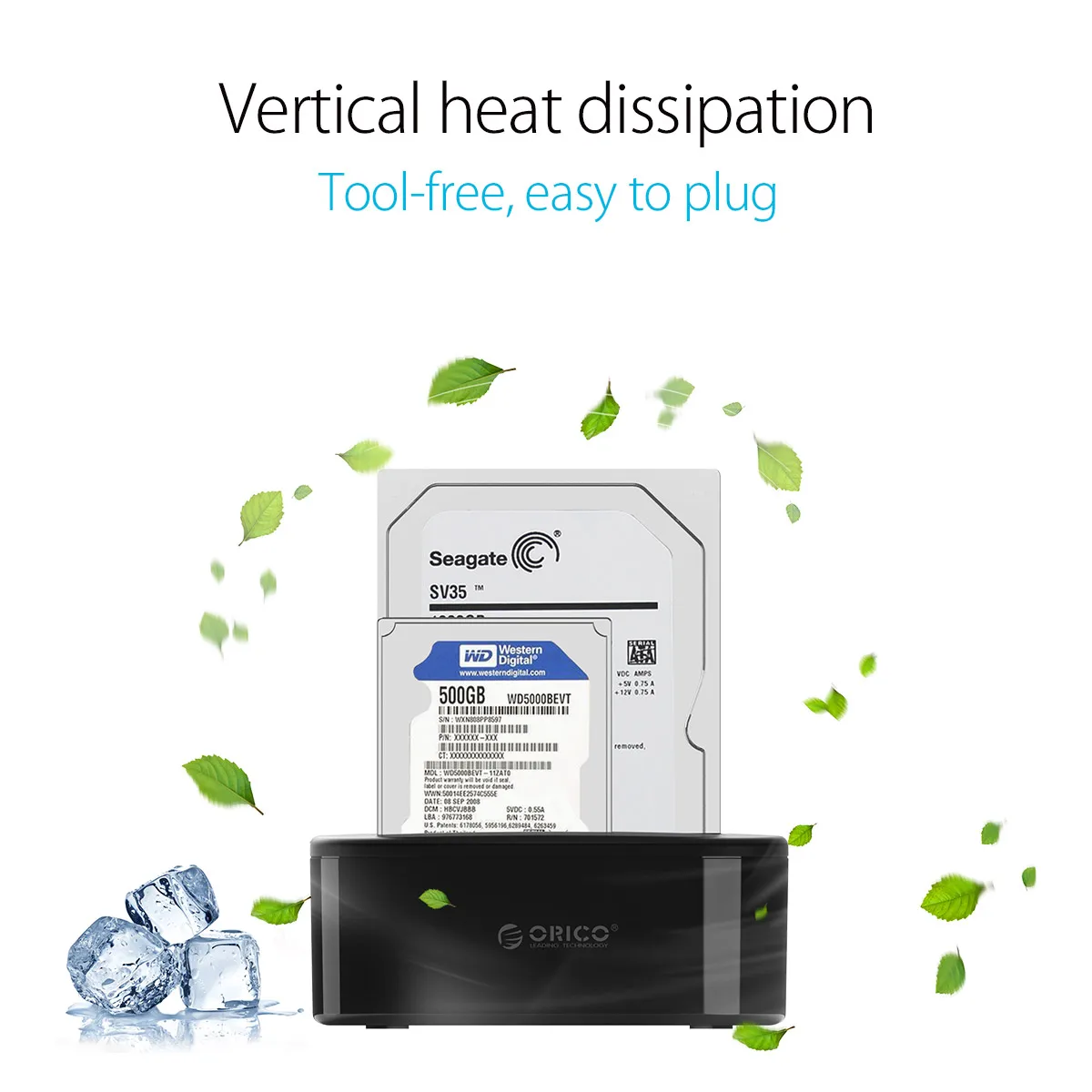 Estación de acoplamiento de disco duro ORICO de doble bahía. Esta estación de acoplamiento es compatible con HDD/SSD de 2,5 o 3,5 pulgadas de hasta 16 TB por bahía, proporciona una forma más conveniente de transmitir datos entre su disco duro y su computadora a través de un puerto USB disponible.