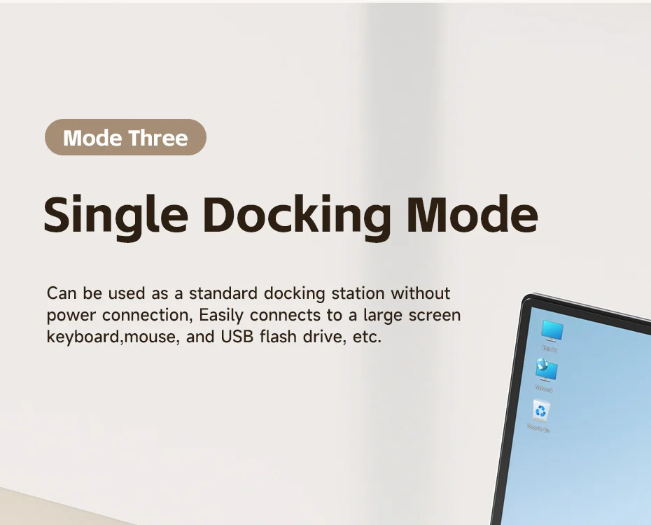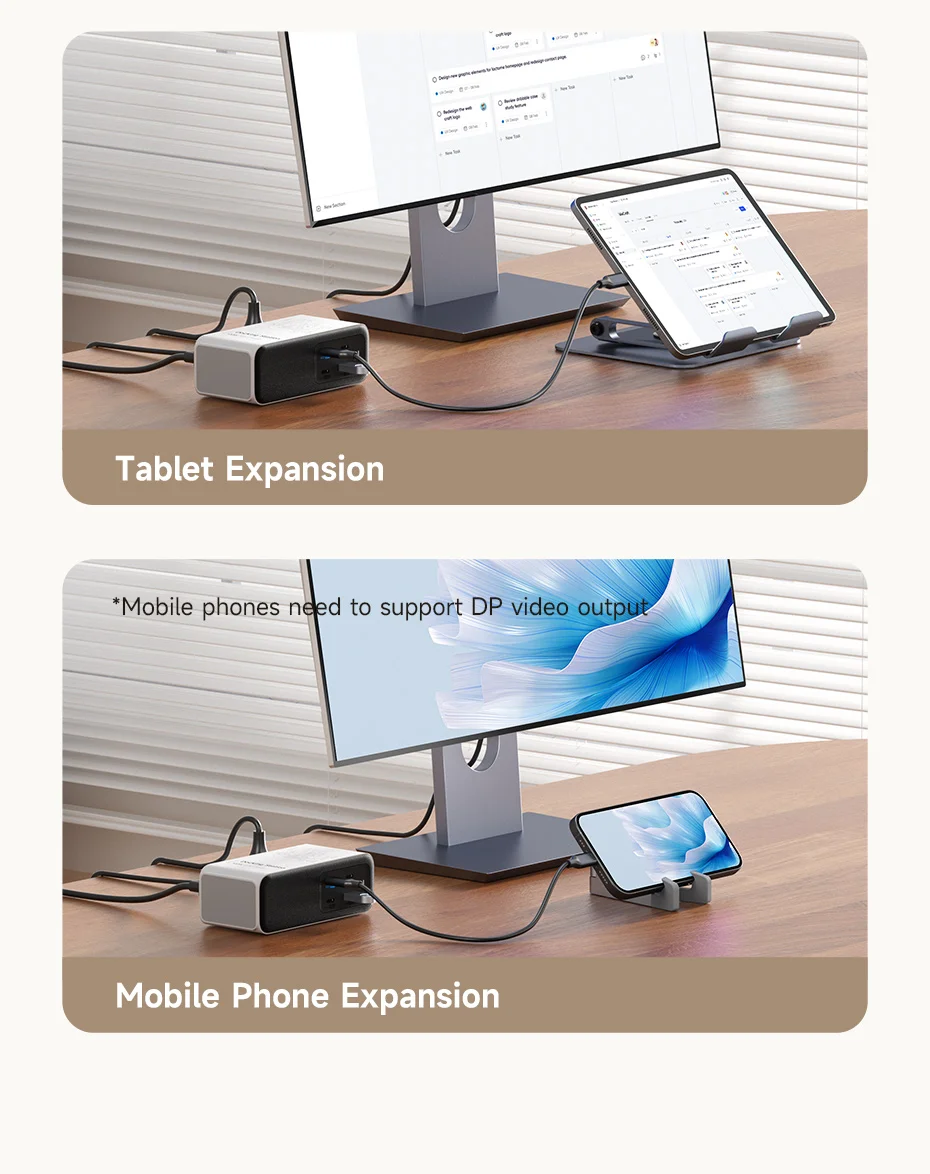 Modo de extensión única:Sin fuente de alimentación, también se puede utilizar como estación de acoplamiento estándar y es fácil conectar una pantalla grande, un teclado y un mouse y un disco U.