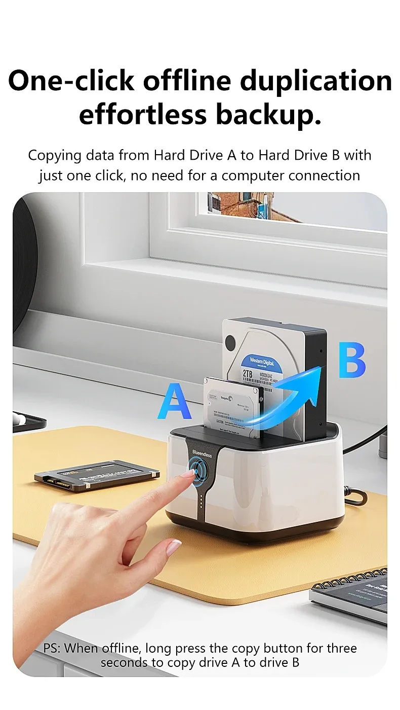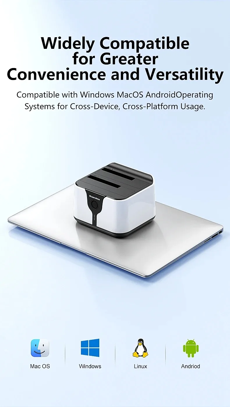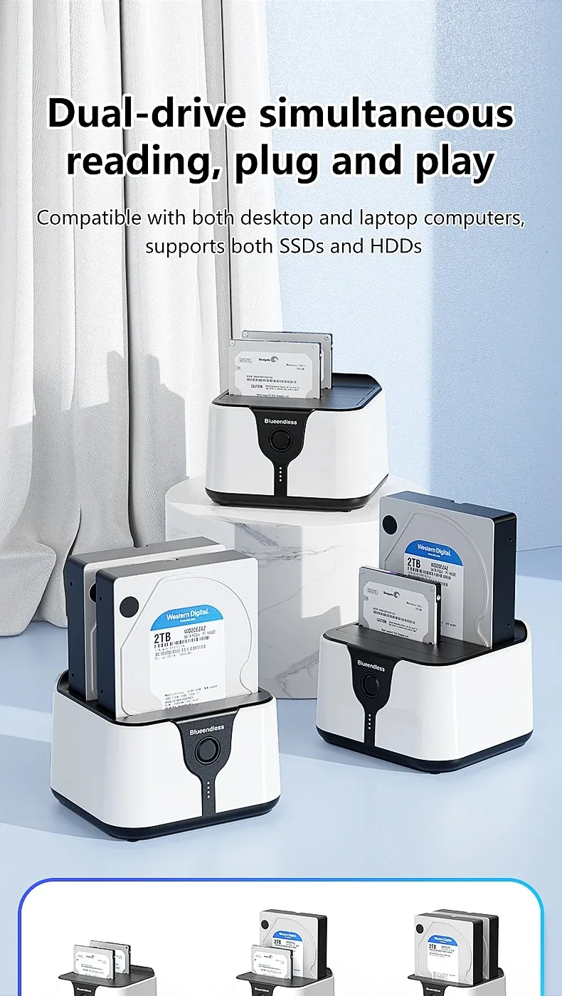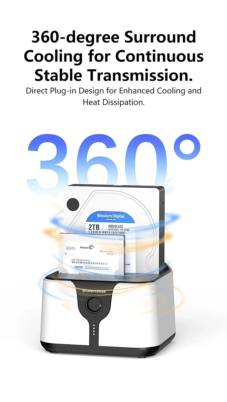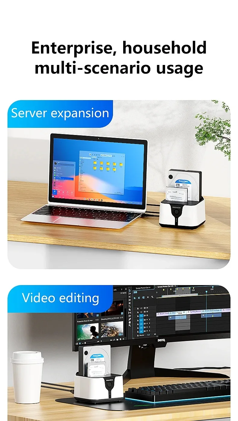 Estación de acoplamiento para disco duro de doble bahía. Esta estación de acoplamiento es compatible con HDD/SSD de 2,5 o 3,5 pulgadas de hasta 20 TB por bahía, proporciona una forma más conveniente de transmitir datos entre su disco duro y su computadora a través de un puerto USB disponible.