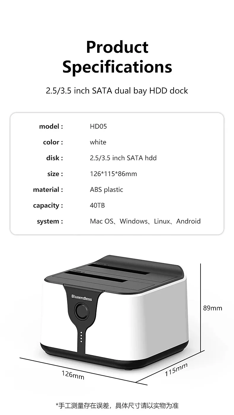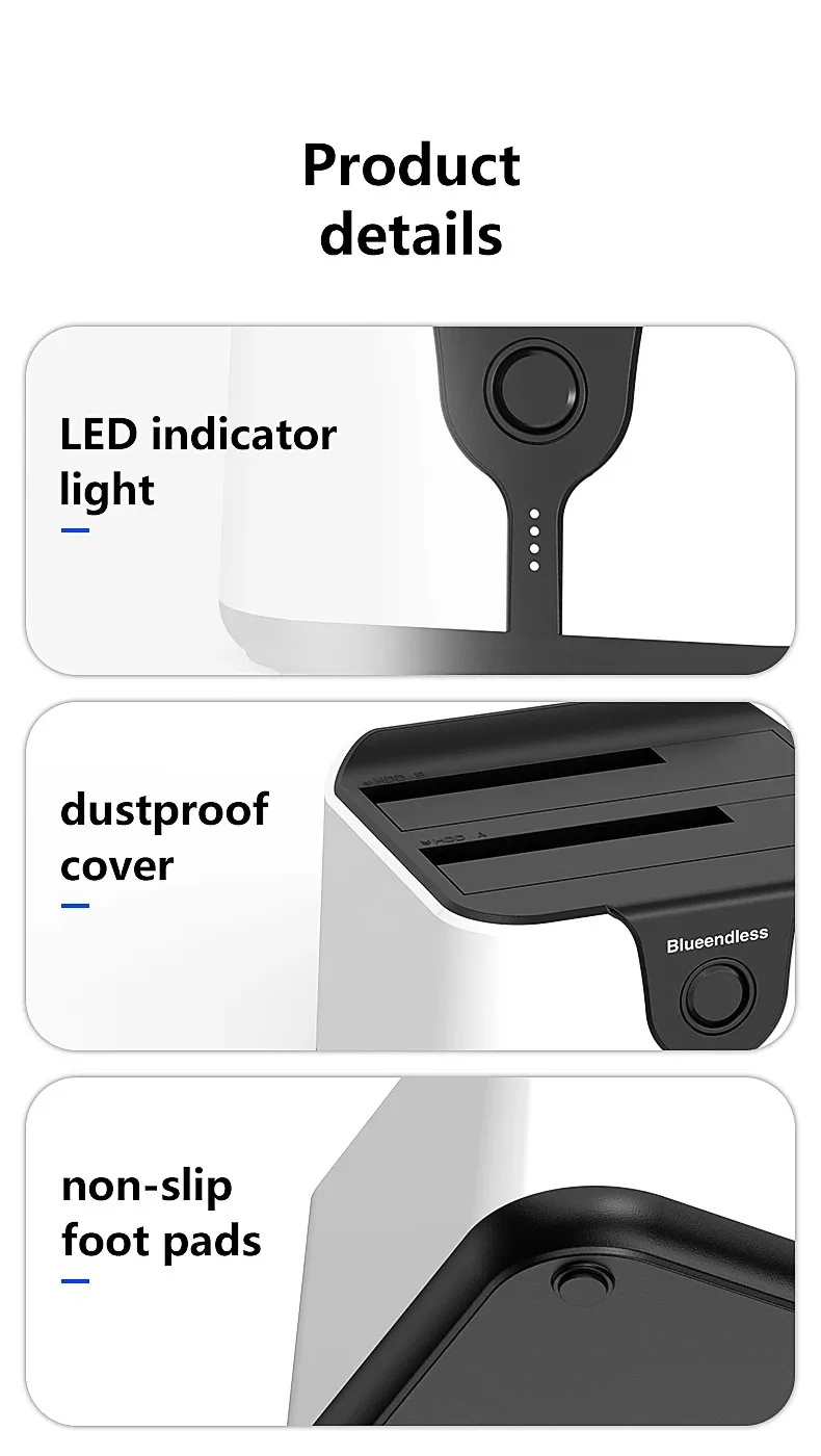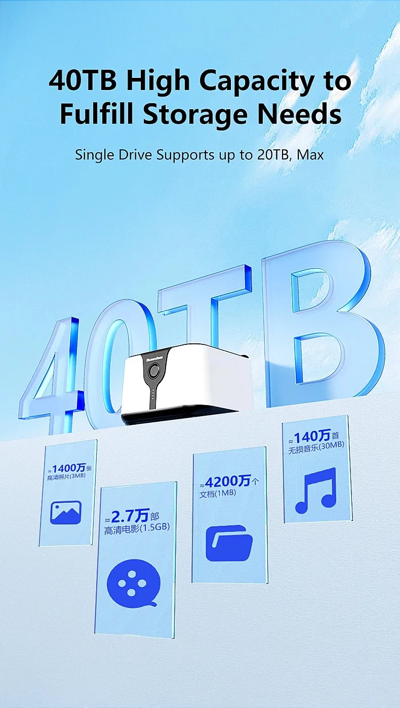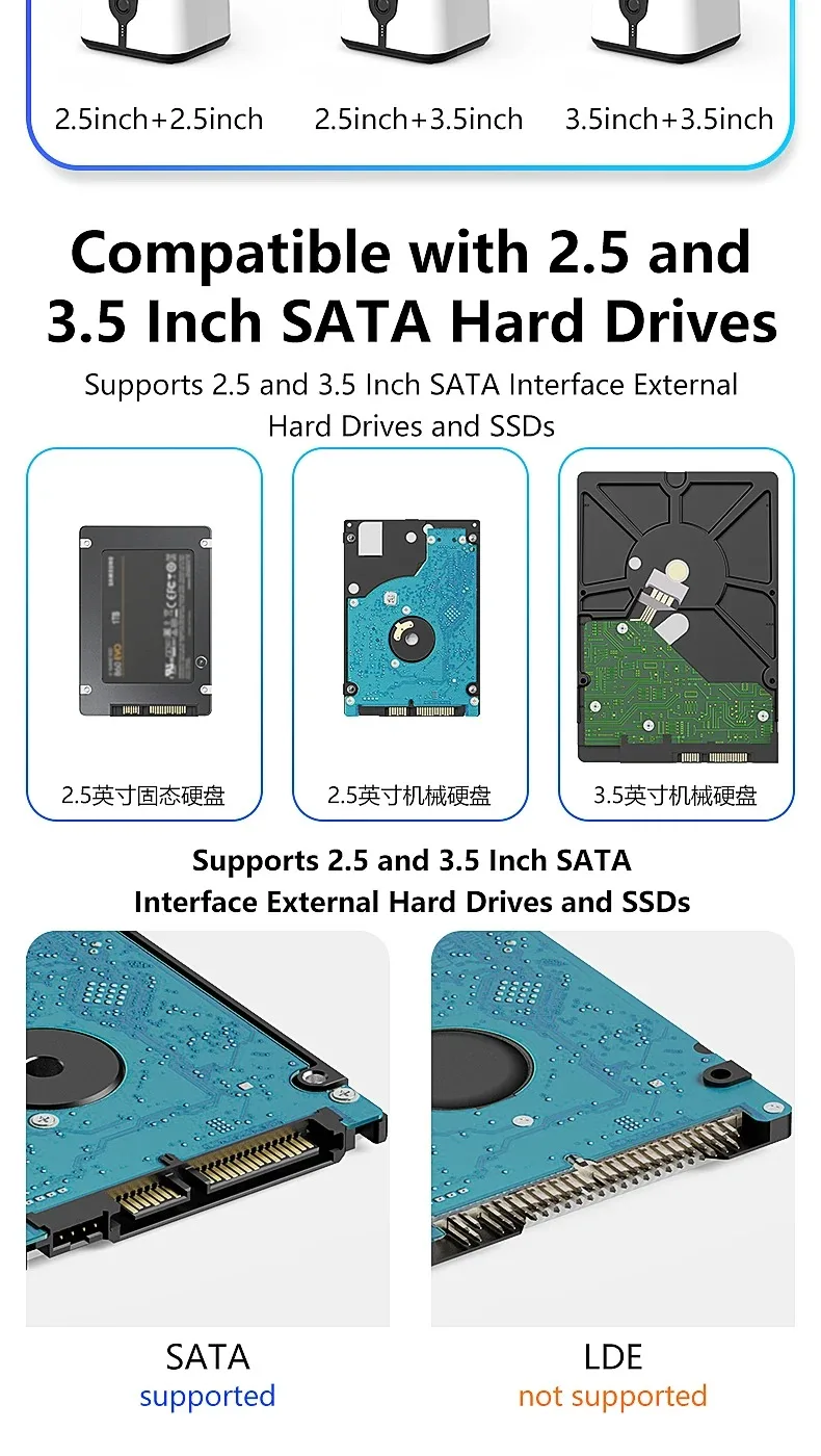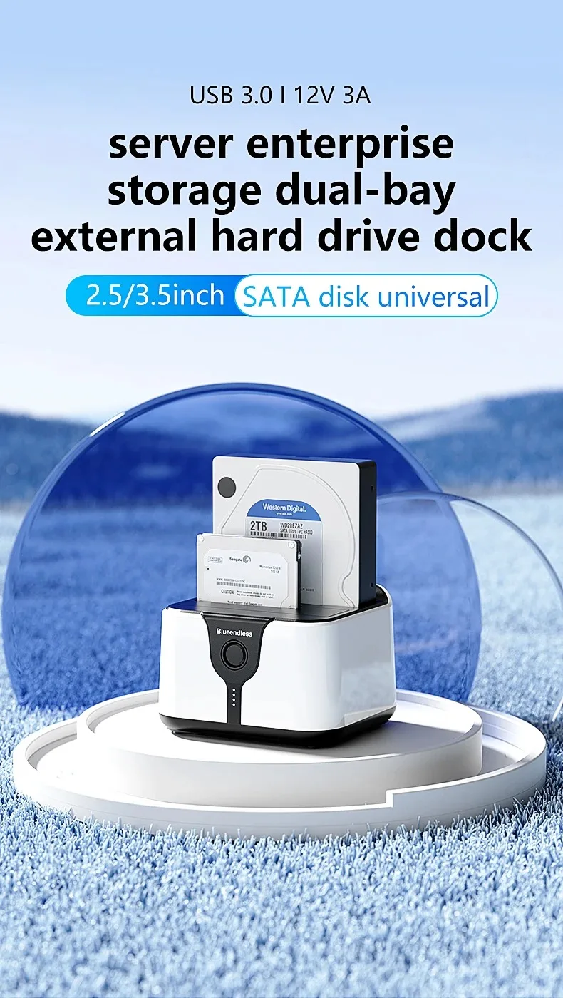 Estación de acoplamiento para disco duro de doble bahía. Esta estación de acoplamiento es compatible con HDD/SSD de 2,5 o 3,5 pulgadas de hasta 20 TB por bahía, proporciona una forma más conveniente de transmitir datos entre su disco duro y su computadora a través de un puerto USB disponible.