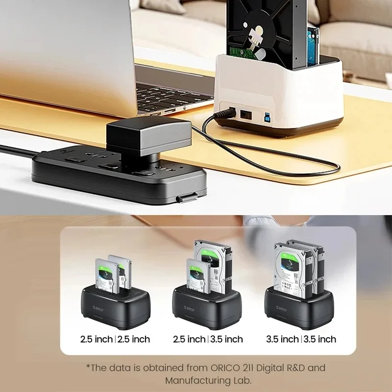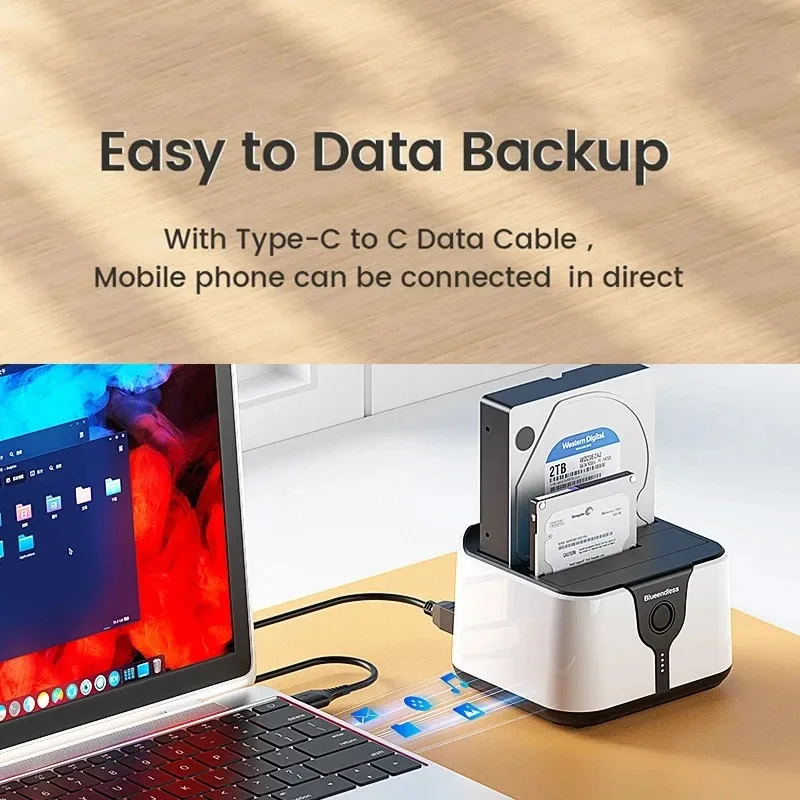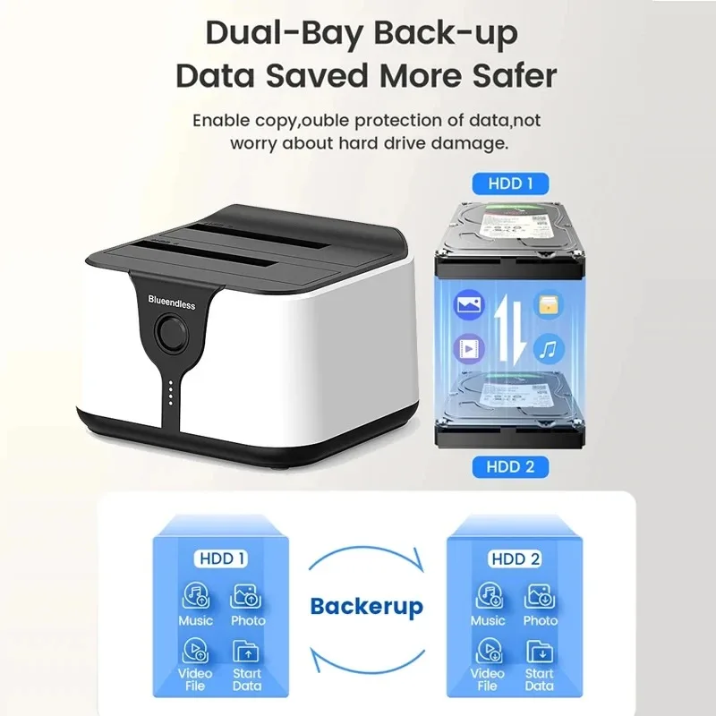 Estación de acoplamiento para disco duro de doble bahía. Esta estación de acoplamiento es compatible con HDD/SSD de 2,5 o 3,5 pulgadas de hasta 20 TB por bahía, proporciona una forma más conveniente de transmitir datos entre su disco duro y su computadora a través de un puerto USB disponible.