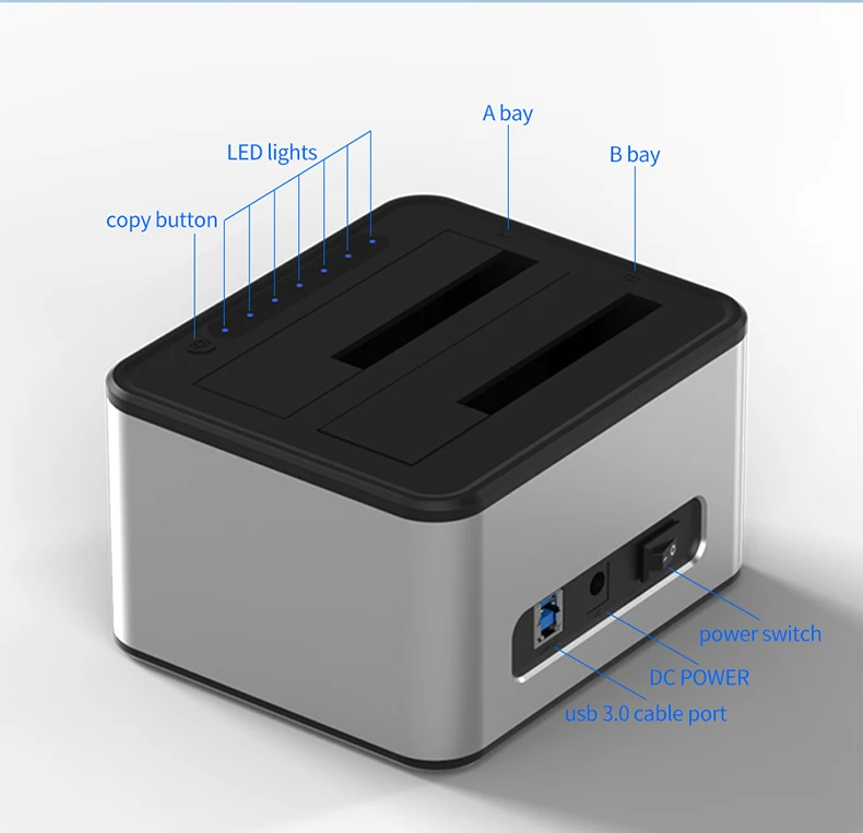 2.El disco trasero (B) debe tener una capacidad mayor (eliminar la pérdida de espacio) que el disco frontal (A)(Aviso amable: (a) Para evitar que el archivo del disco se dañe, no detenga el dispositivo cuando esté en función de clonación.(b)CuandoCopiar el disco, asegúrese de que el disco B esté vacío, o el archivo anterior en el disco B se perderá. Si el disco B tiene un archivo antes y desea copiar del disco A también, no use la función de copia, simplemente copie y pegue en computadora)
