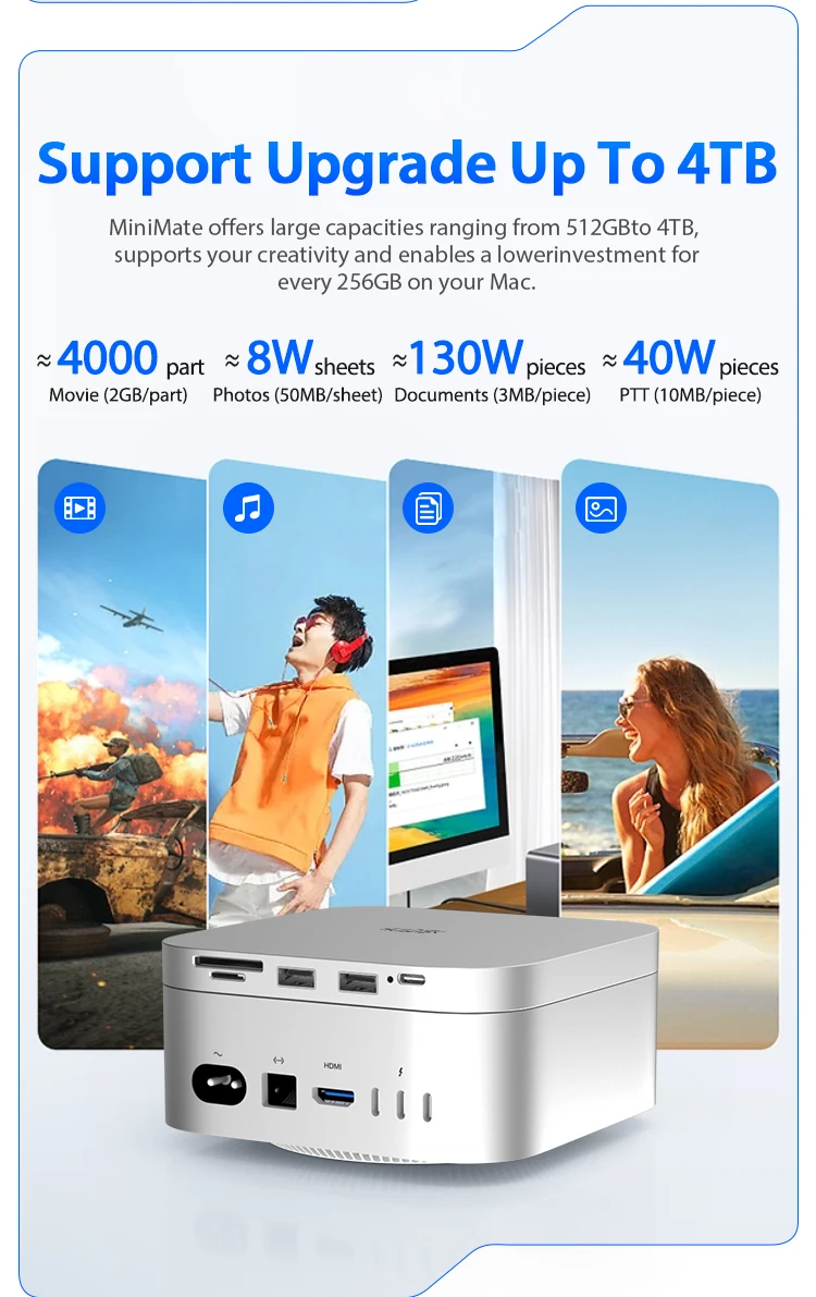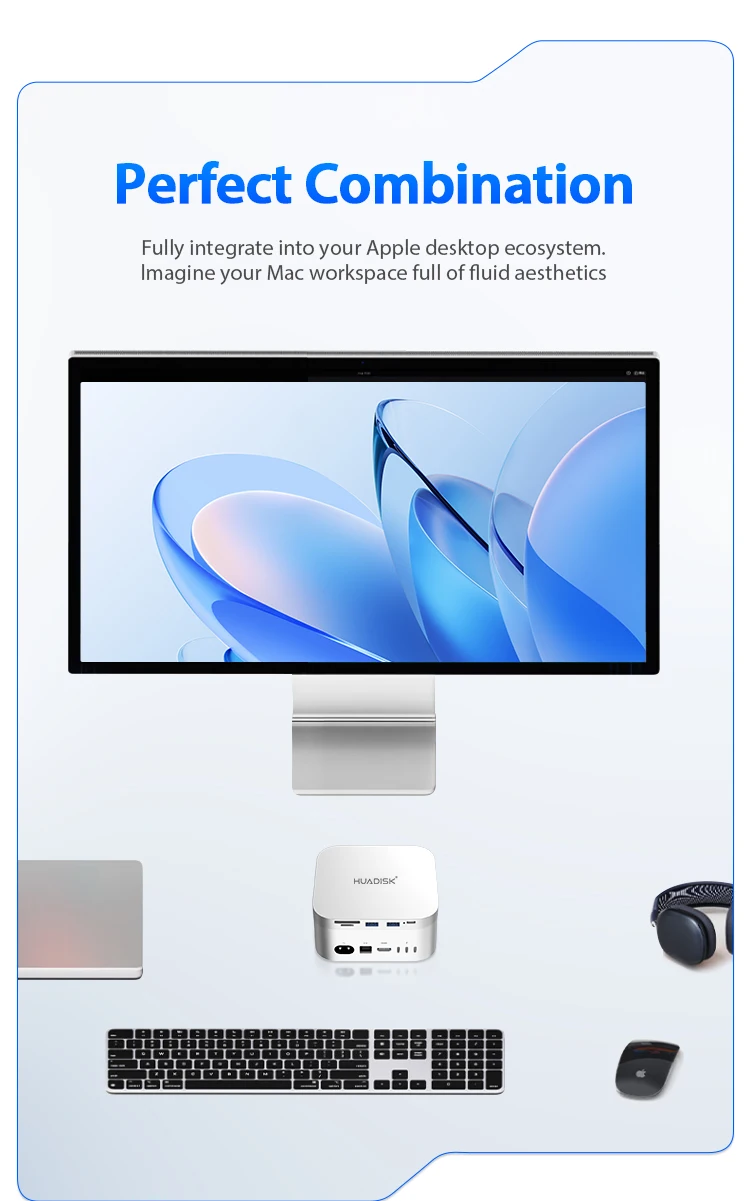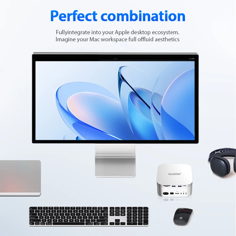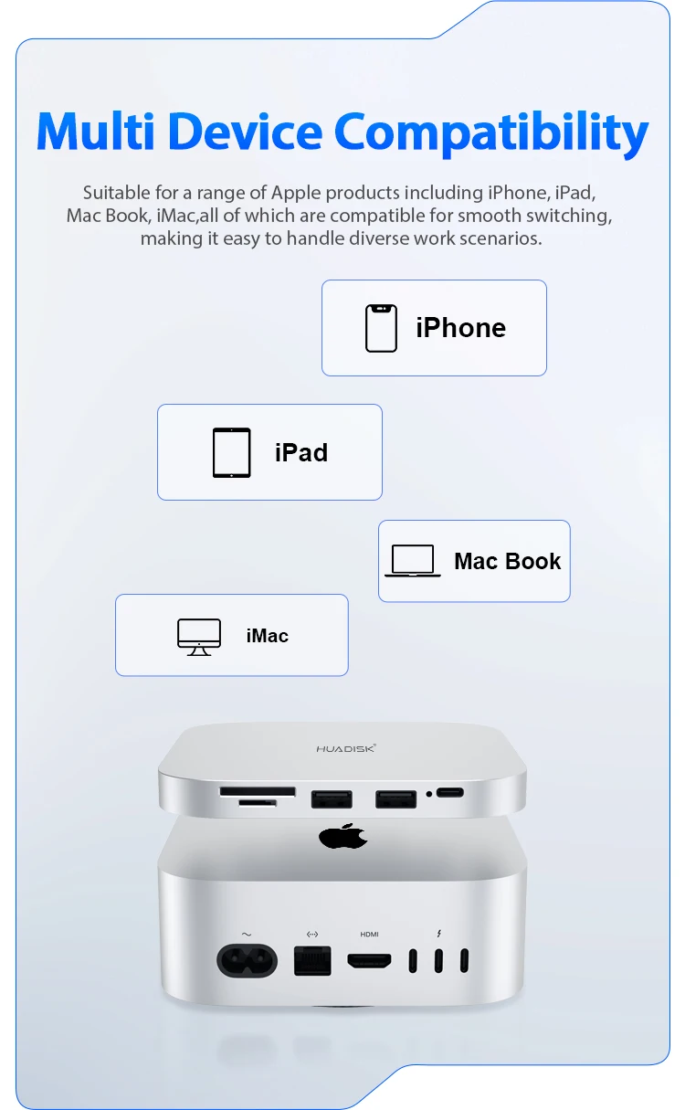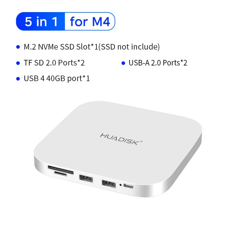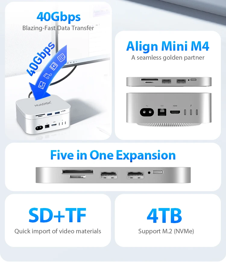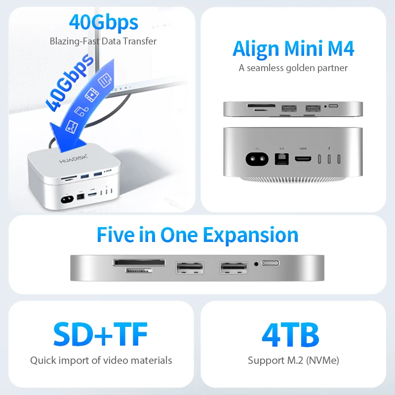 Comprar Estación de acoplamiento HUADISK para Mac Mini M4, base de expansión compatible con interfaz NVMe M.2 SSD de hasta 4TB, velocidad de transferencia ultrarrápida de 40Gbps