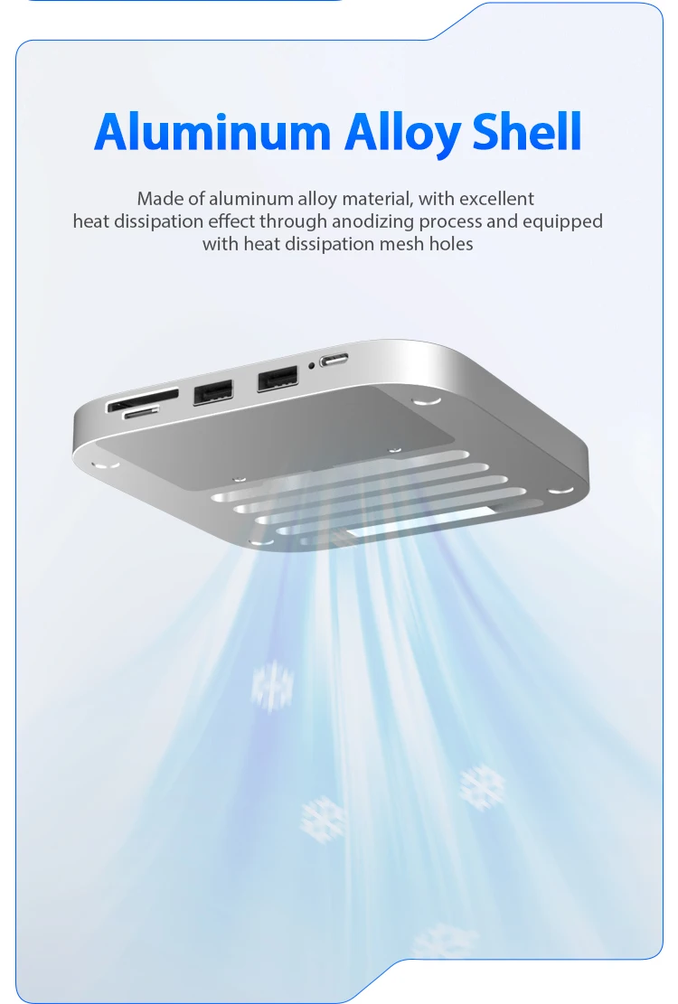 USB-C Hub with Dual Hard Drive Enclosure has multiple interfaces to meet multiple needs. Same size, alloy material, plug and play, light, solid, fast heat dissipation,more suitable for your Mac Mini