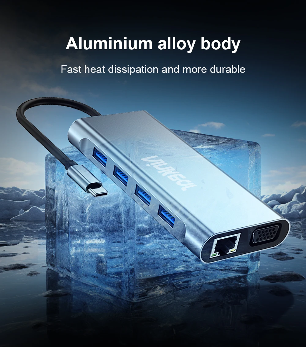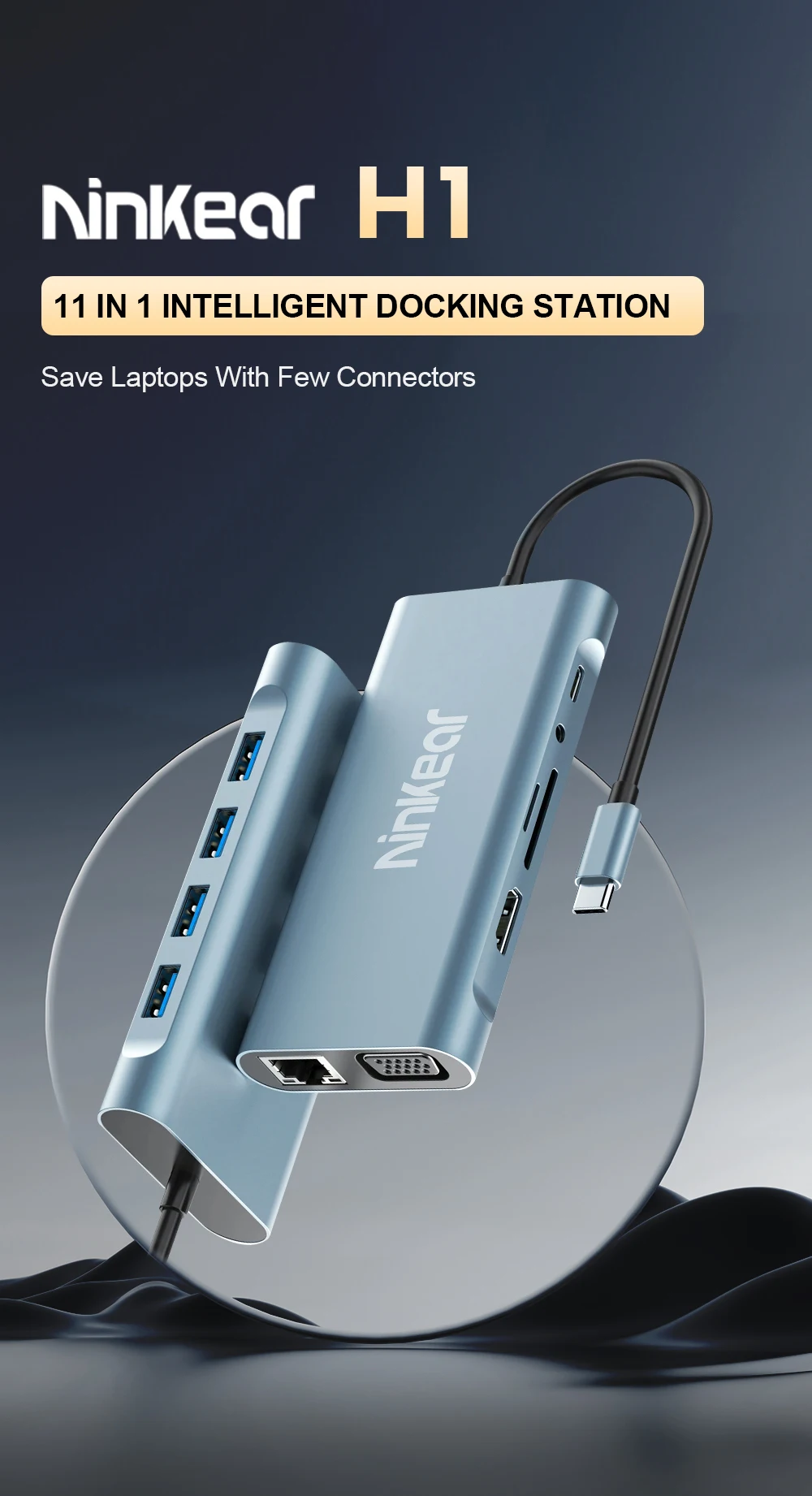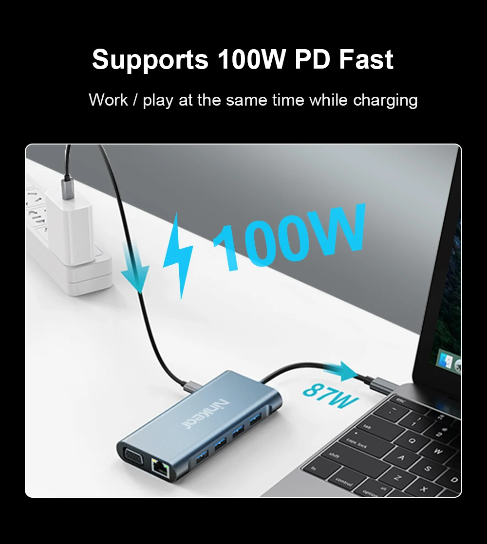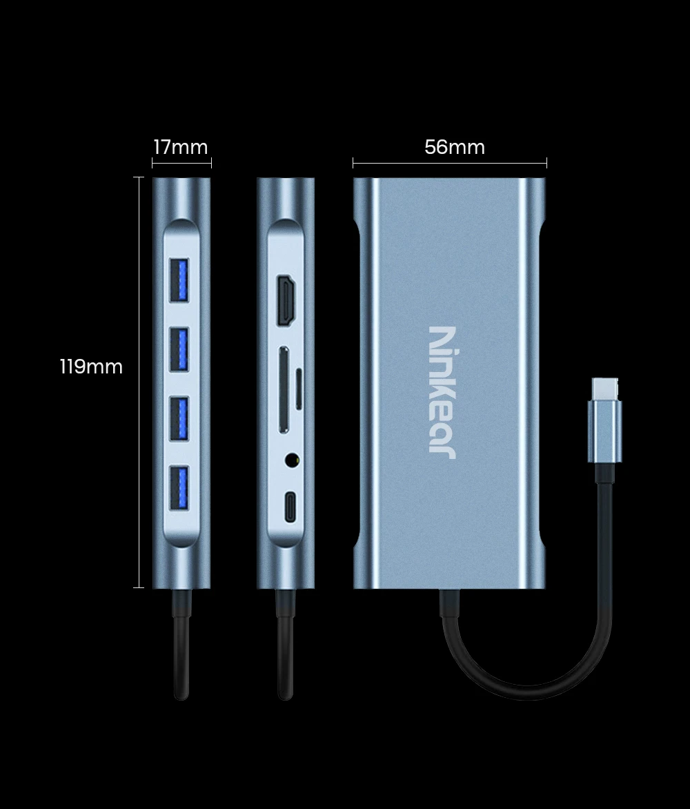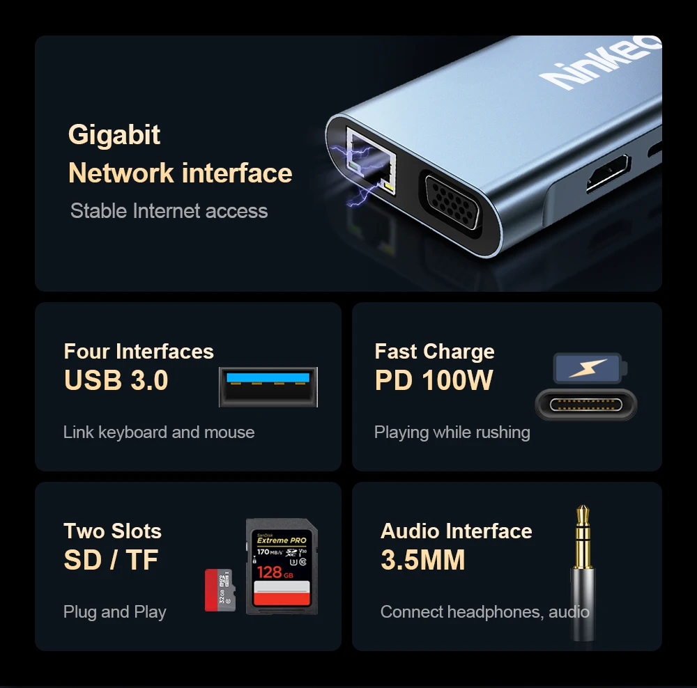 Estación de acoplamiento Ninkear 11 en 1 Resolución HD 4K 30Hz USB2.0*3 USB3.0*1 Resolución VGA 1080P /60Hz Carcasa de aleación de aluminio