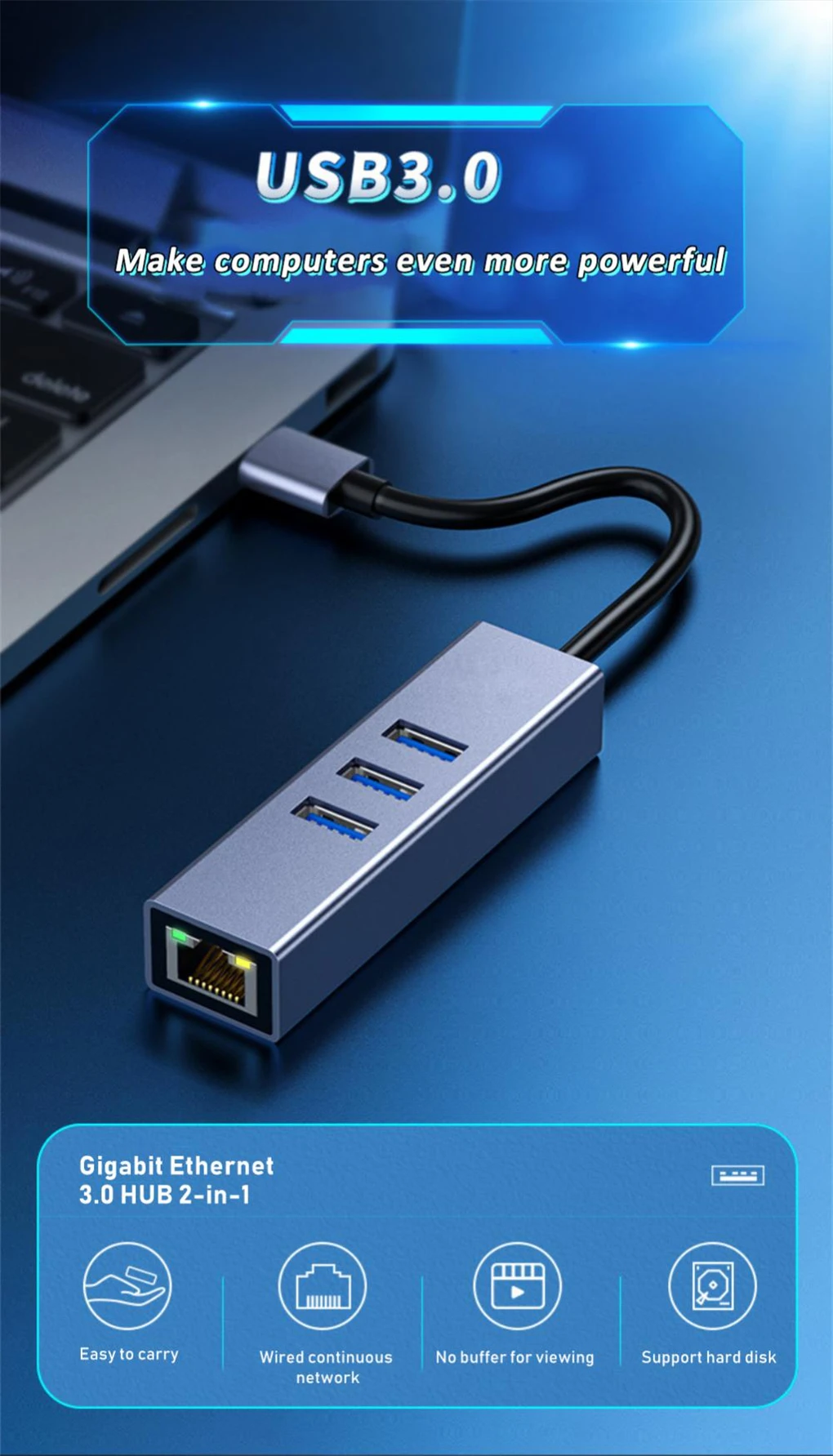 2.Transmisión de alta velocidad: USB3.Tarjeta de red de 0 gigabits+3.0 HUB hub drive gratis es más simple, USB3.La transmisión de velocidad ultraalta de 0 (5GMbps) cumple con los requisitos de transmisión 3.Interfaz de red de 1000 Mbps, mejora la velocidad de transmisión de la red, tiene su propio cable de datos USB, que es conveniente para usar computadoras portátiles, compatible con USB2.Versión 0 o inferior, intercambio de datos más aleatorio.