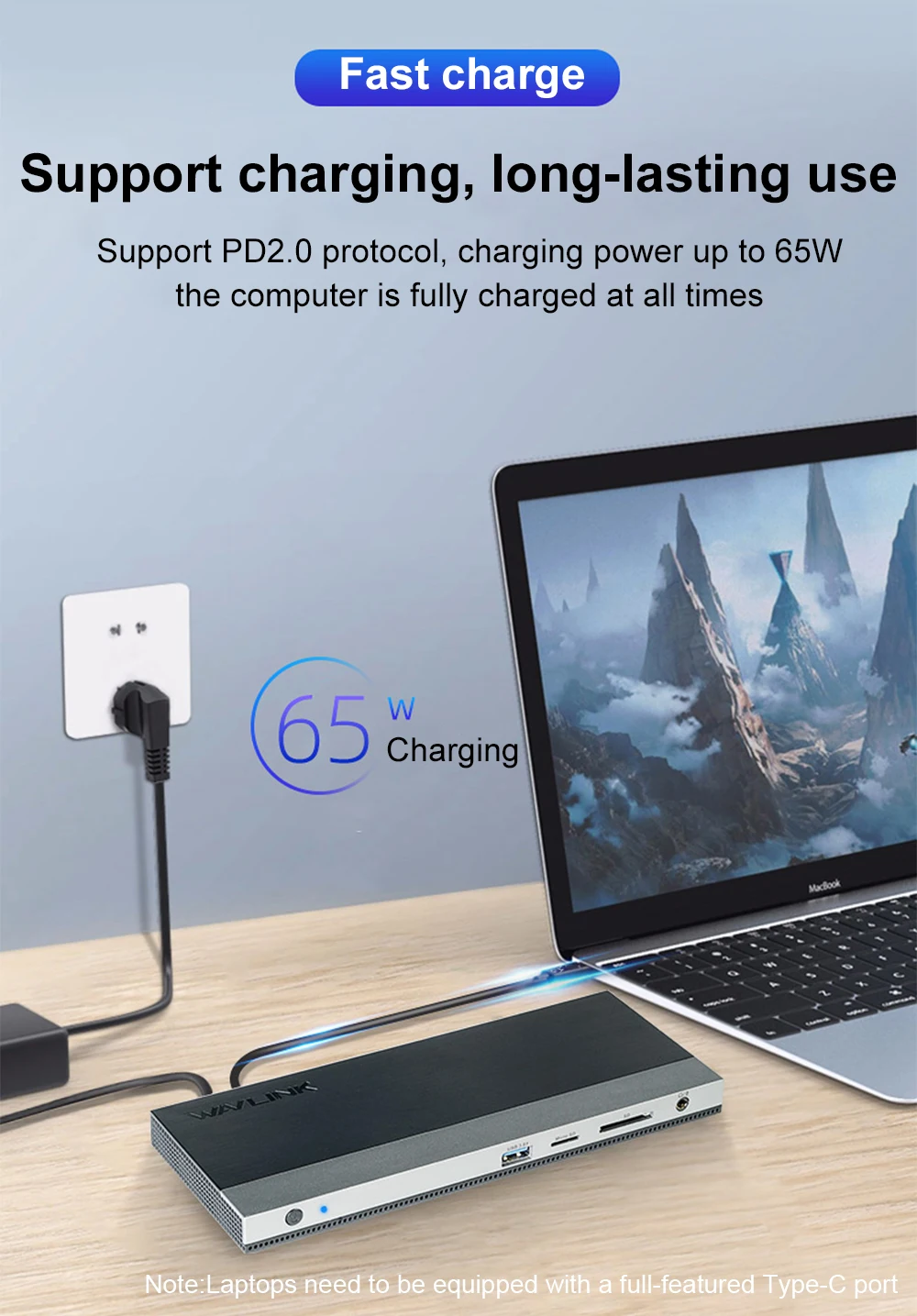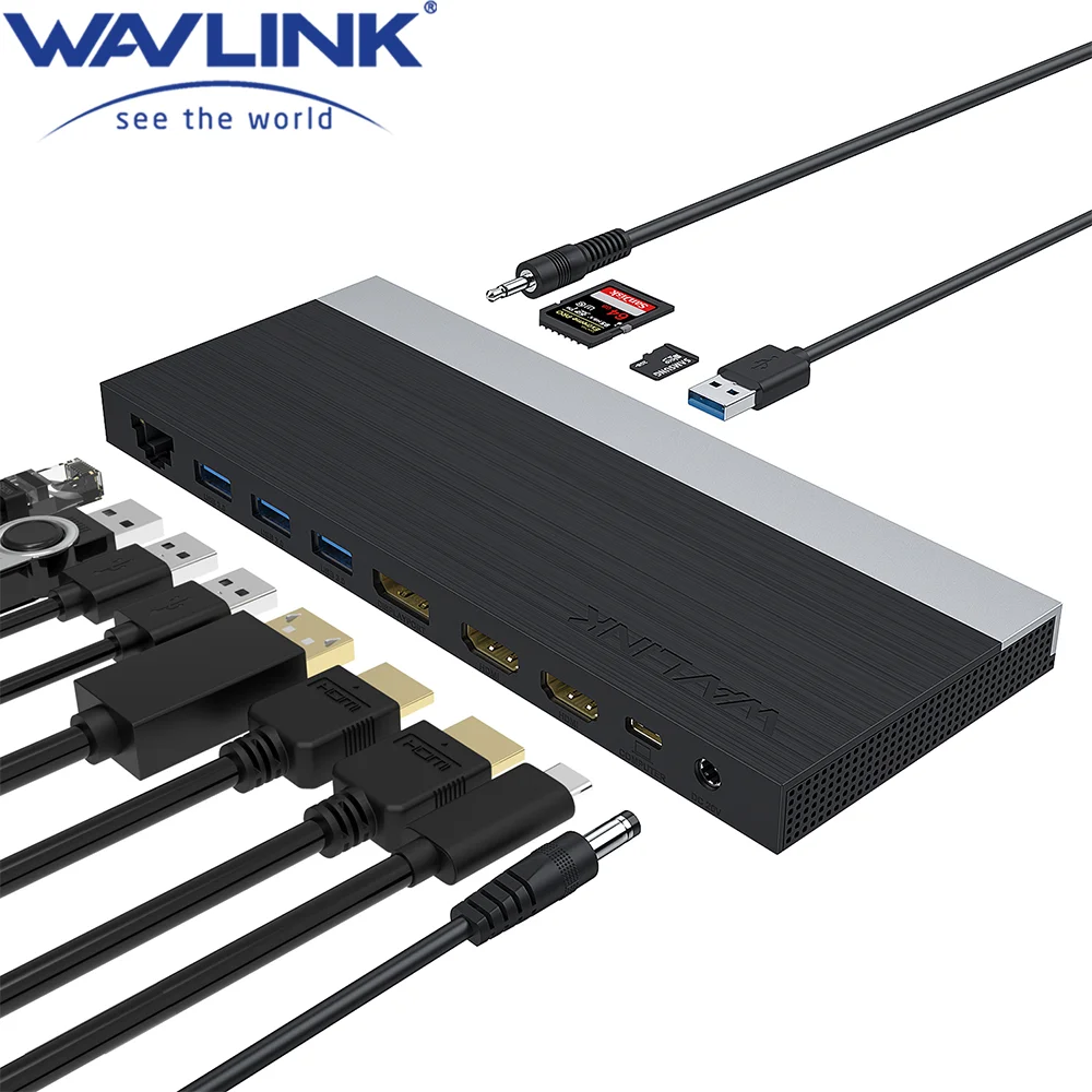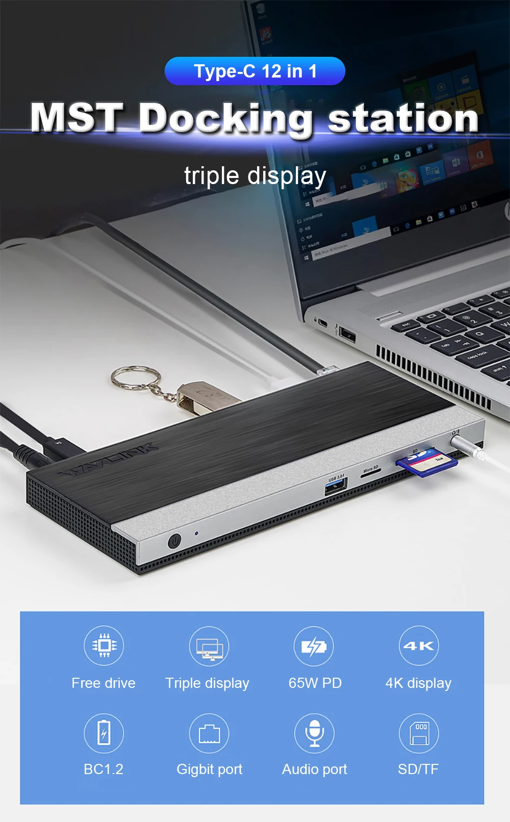 Wavlink-Estación de acoplamiento MST 4K con entrega de energía USB para estación de acoplamiento portátil USB 3,0, pantalla triple 2 DP + 1 puerto HDMI o 1 DP + 2 HDMIDescripciónLa estación de acoplamiento MST de triple Pantalla de USB-C carga el dispositivo a su ordenador portátil, admite hasta tres pantallas y permite la conectividad a su red cableada y otros accesorios.Características