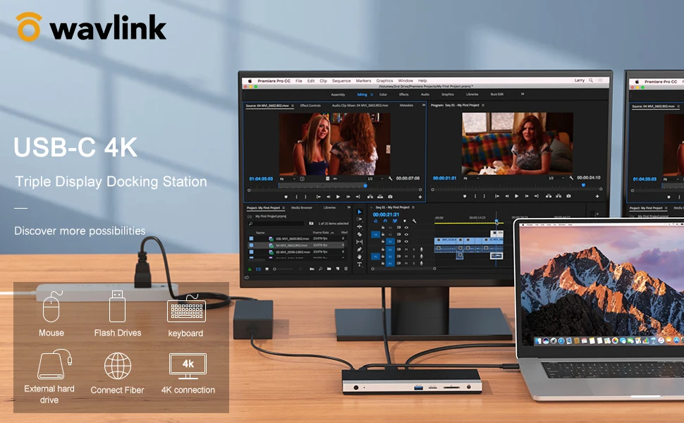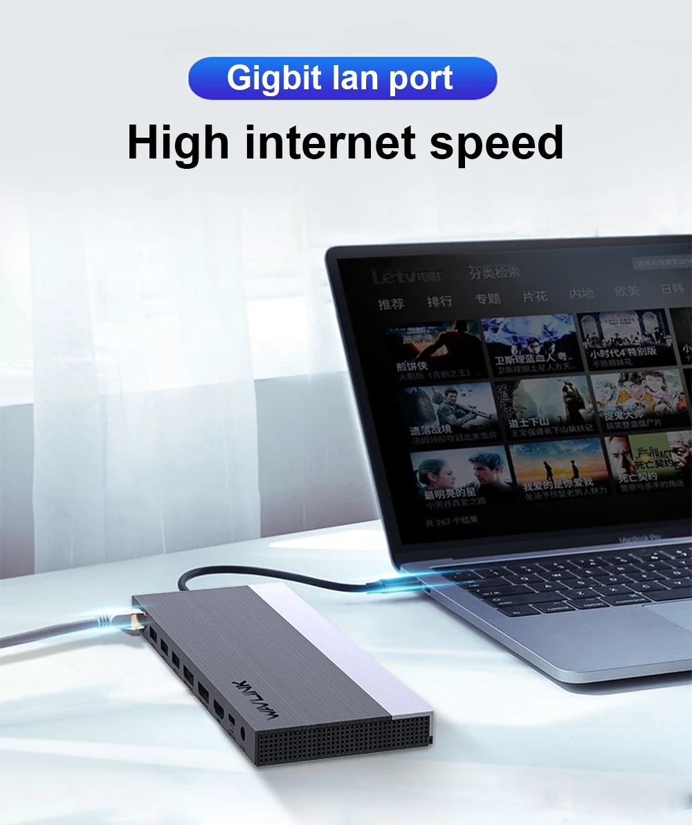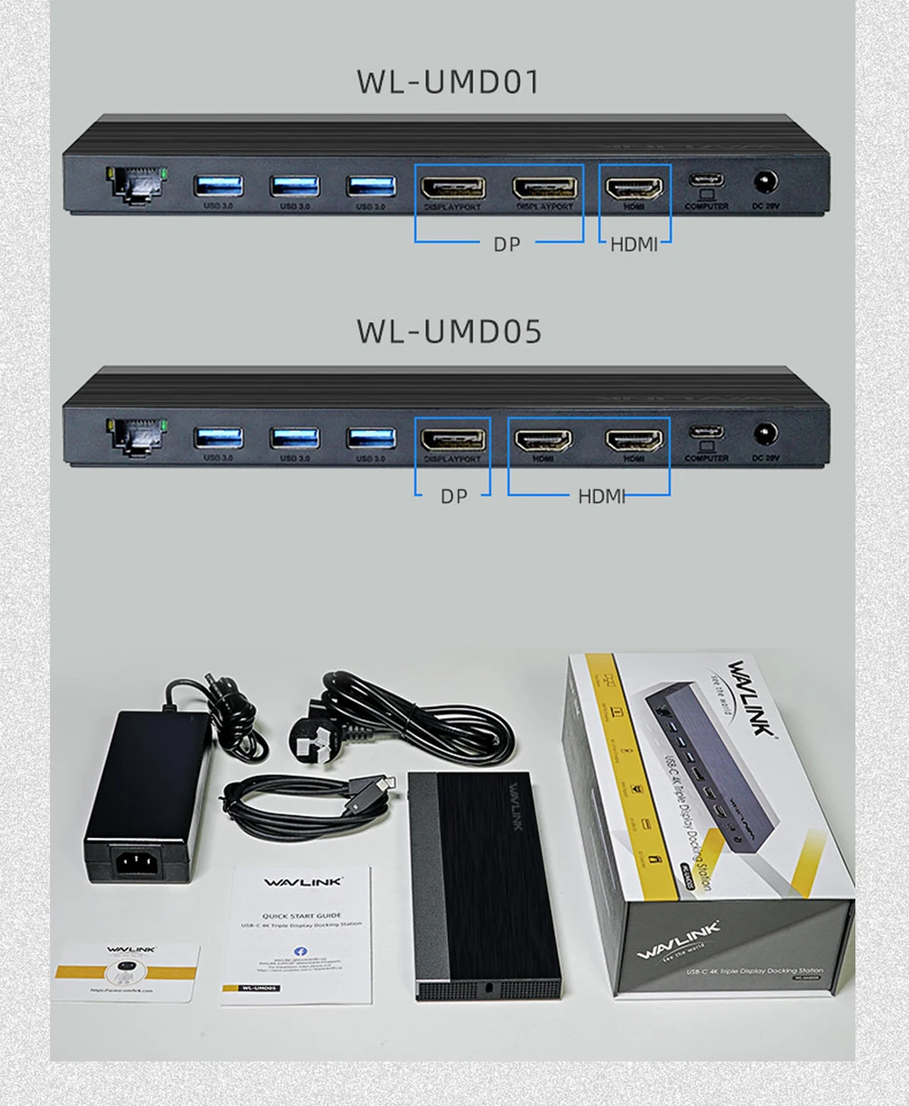 Wavlink-Estación de acoplamiento MST 4K con entrega de energía USB para estación de acoplamiento portátil USB 3,0, pantalla triple 2 DP + 1 puerto HDMI o 1 DP + 2 HDMIDescripciónLa estación de acoplamiento MST de triple Pantalla de USB-C carga el dispositivo a su ordenador portátil, admite hasta tres pantallas y permite la conectividad a su red cableada y otros accesorios.Características