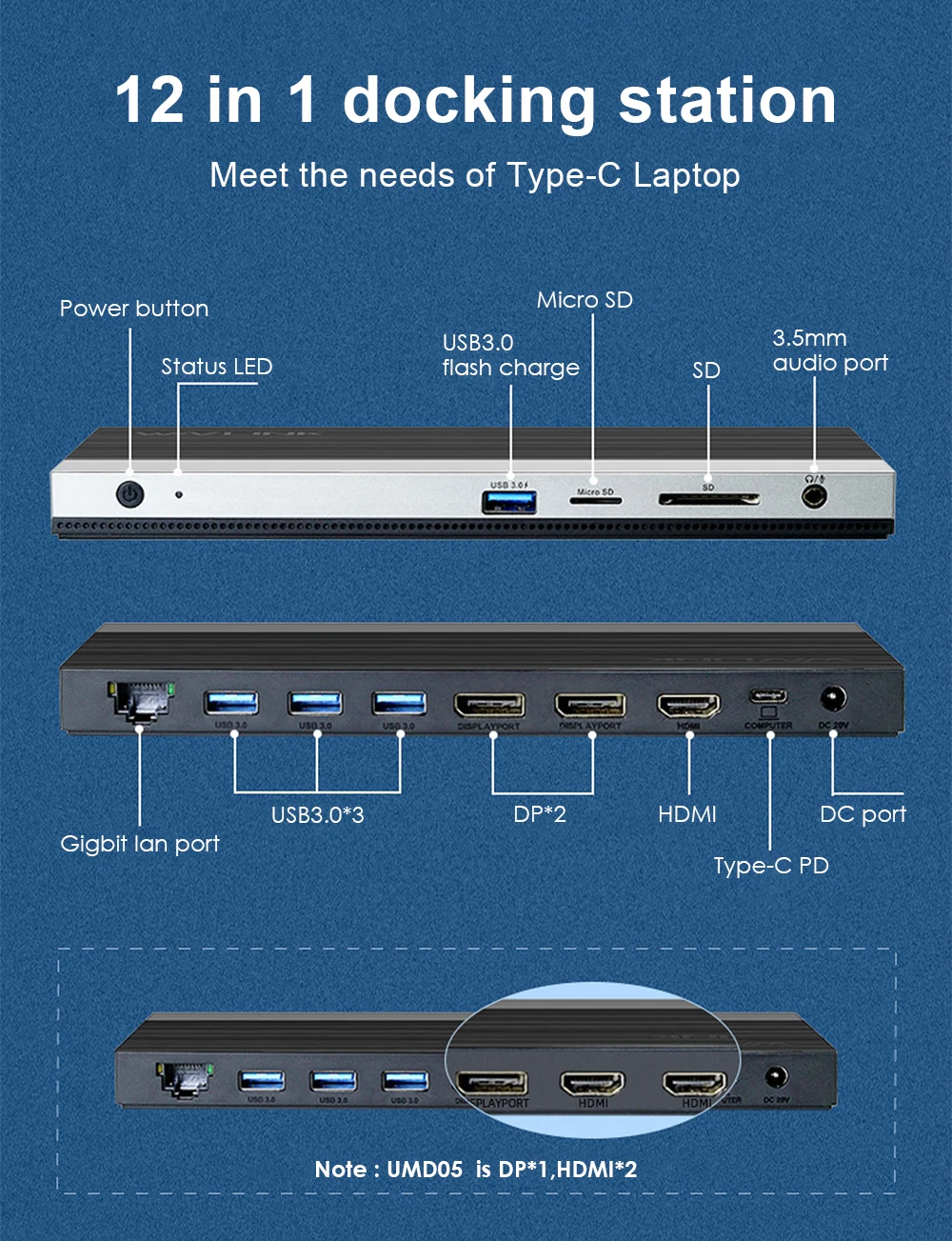 Requisitos del sistema1. El ordenador con USB3.1 tiene función completa con transferencia de datos, entrega de energía y modo alternativo de vídeo en el que se puede ver el producto.2. Windows 7 /8 /10 o posterior3. MacOS 10.X o superiorAtención:Este enlace incluye dos modelos, modeloUMD01(DP * 2,HDMI * 1)Y modeloUMD05(DP * 1,HDMI * 2)Por favor, compre según sus necesidades.