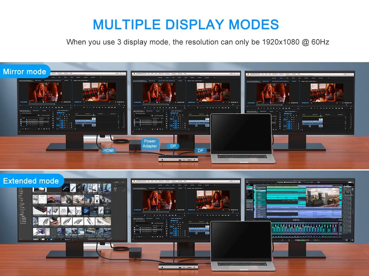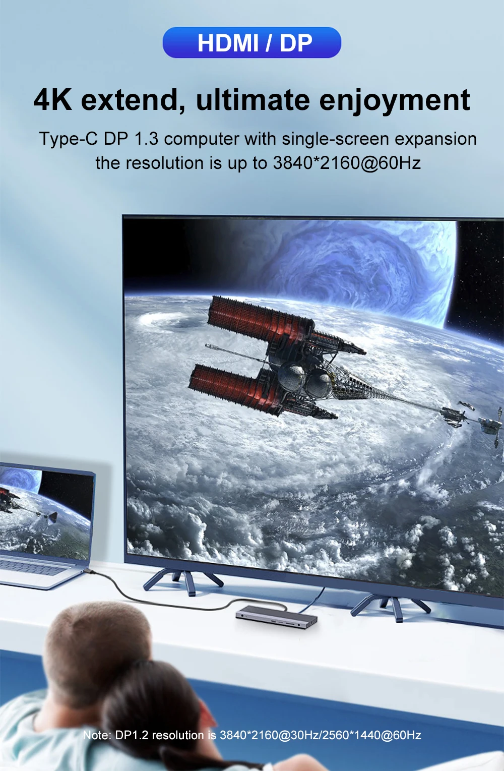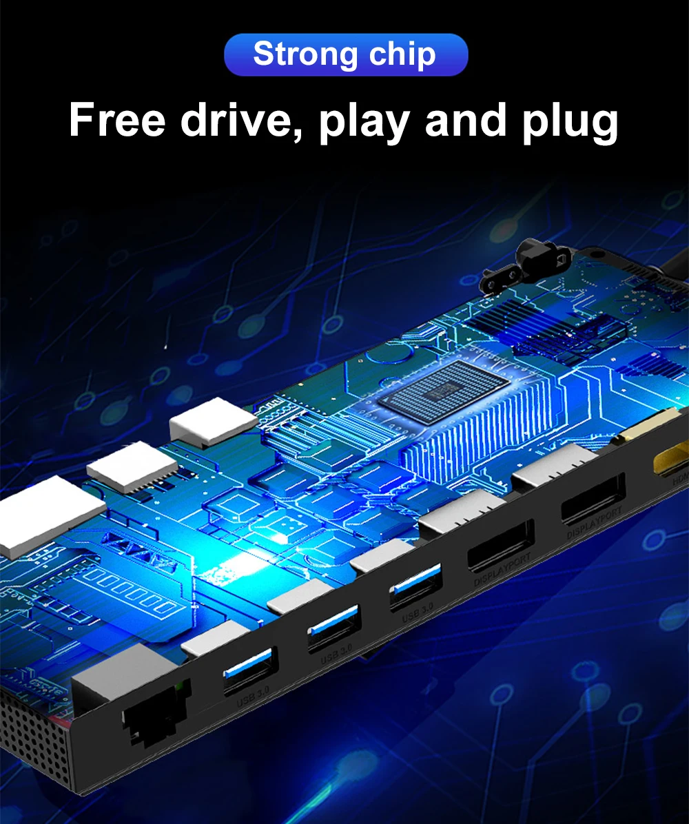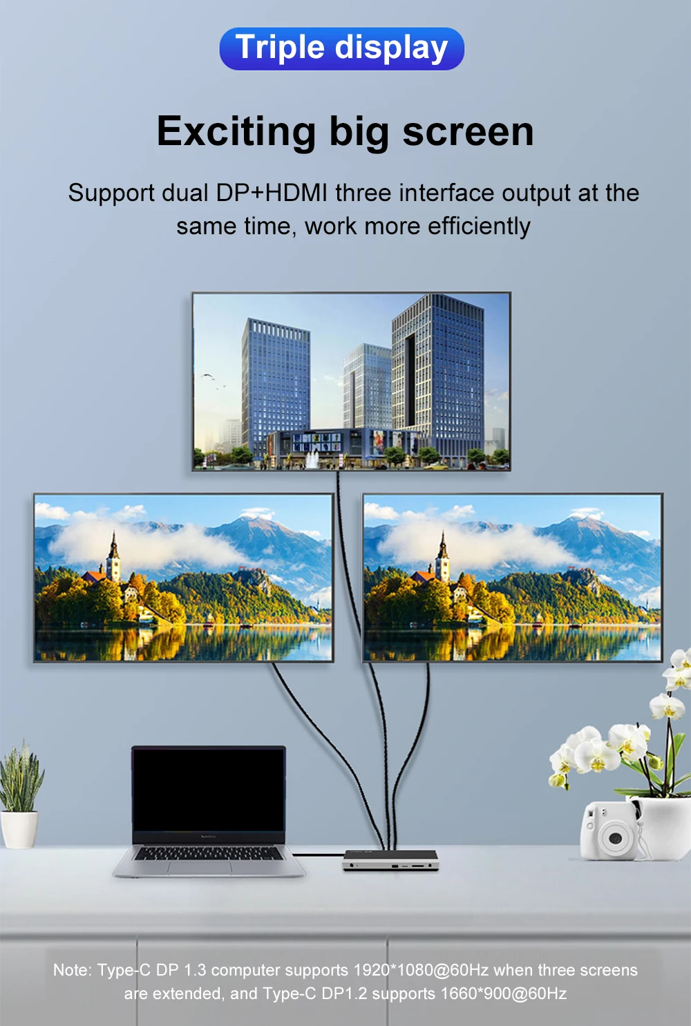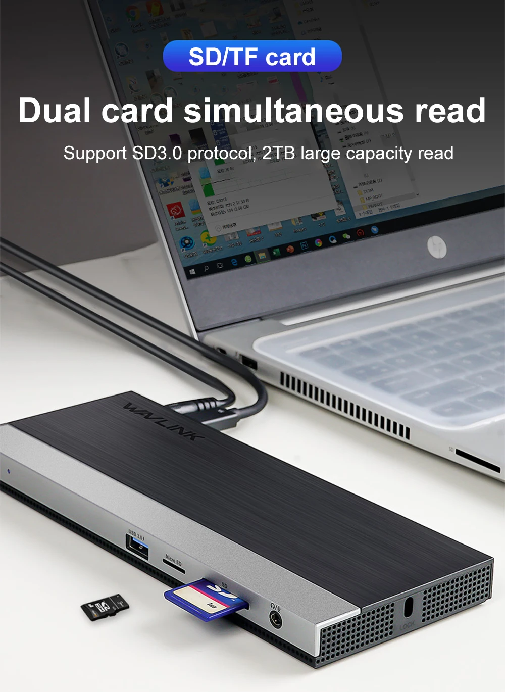 ---- 1. Compatible con ordenador de PC de especificación completa USB3.1 Gen2 tipo C.--- 2. Entrega de energía USB con soporte de 4 perfiles Carga ascendente de 65 vatios.--- 3. Soporte de DisplayPort V1.4; soporte de Puerto HDMI V2.0---- 4. Compatible con pantalla triple, resolución máxima de hasta 1920x1080 @ 60 (HBR3 DP1.3)--- 5. Admite pantalla dual, resolución máxima de hasta 2560x1440 @ 60 (HBR3 DP1.3)---- 6. Admite una sola pantalla, resolución máxima de hasta 3840x2160 @ 60 (HBR3 DP1.3)--- 7. Red Gigabit Ethernet integrada, con versiones anteriores a 10/100 Ethernet.---- 8. Conector de teléfono integrado de 4 polos para salida de audio estéreo y entrada de micrófono.--- 9. Combo integrado SD/lector de tarjetas TF SD V3.01 compatible con capacidad SDHC / SDXC de hasta 2TB.---- 10. Cuatro puertos USB 3,0 tipo A con un puerto tiene carga rápida BC1.2.--- 11. Compatible con sistema operativo Windows 7 / 8 / 10; Max OSX 10 o la última versión.