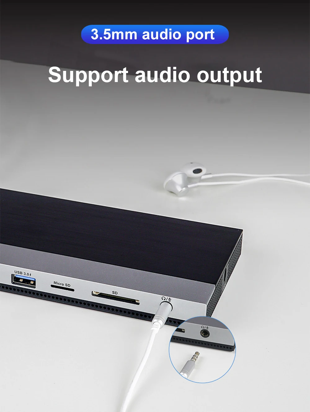 Trabajo estándar1. I/P: USB3.1 Gen2 (datos, vídeo y carga ascendente).2. DisplayPort único: 4K/60Hz máx.3. Puerto HDMI único: 4K/60Hz máx.4. Puerto: 5Gbps5. 3 puertos de 2/: 5Gbps6. USBA 1 puerto: 5Gbps + carga BC1.27. RJ45: Gigabit Ethernet8. Lector de tarjetas: SDHC /SDXC /TF9. Conector De Teléfono: estéreo TRRS estéreo de 4 polos