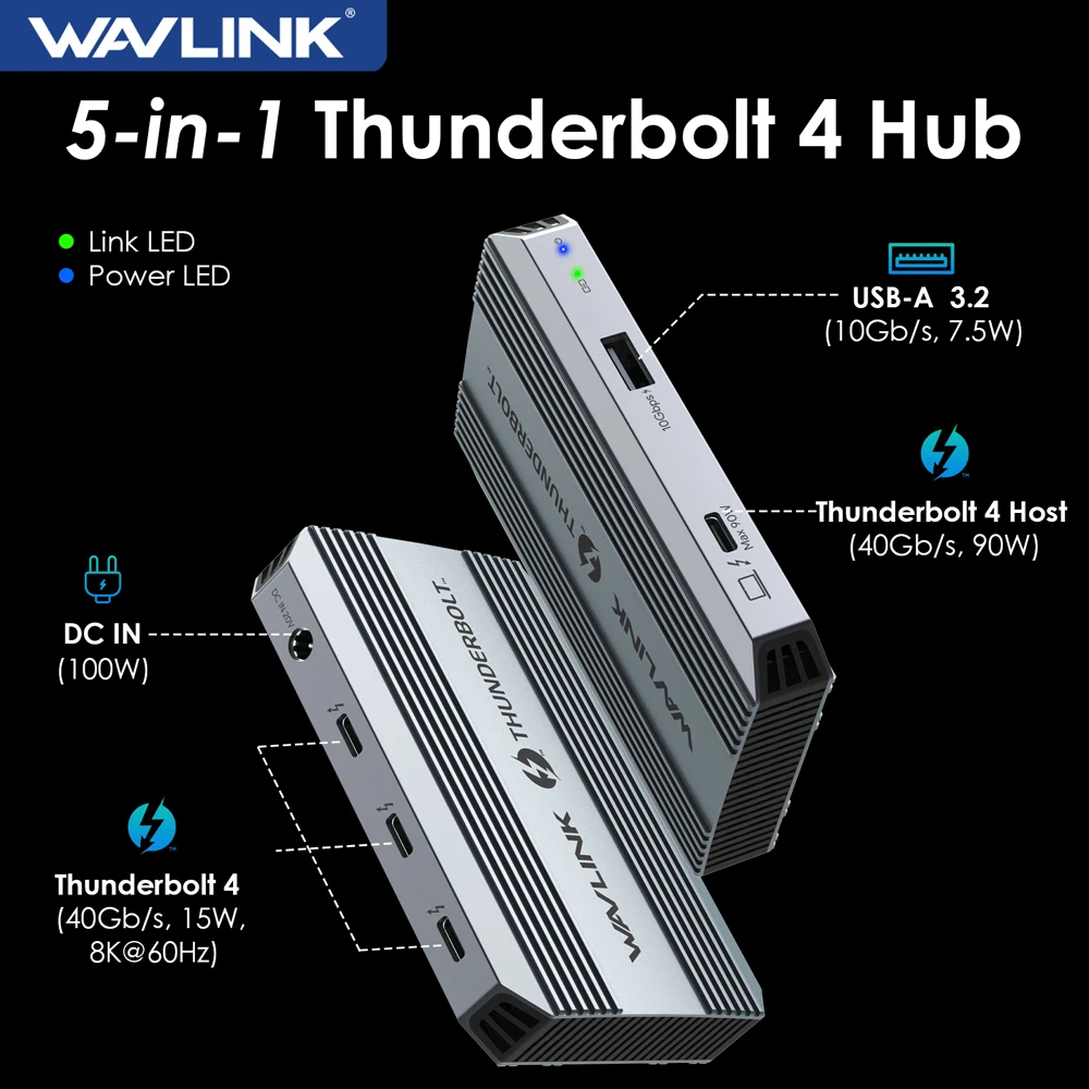 WAVLINK 5-en-1 Thunderbolt 4 Hub, 90W PD de carga, una sola pantalla de 8K o doble pantalla 4K para MacBook Pro/Air M1 M2 M3, Thunderbolt 4/3,/USB 4 Windows