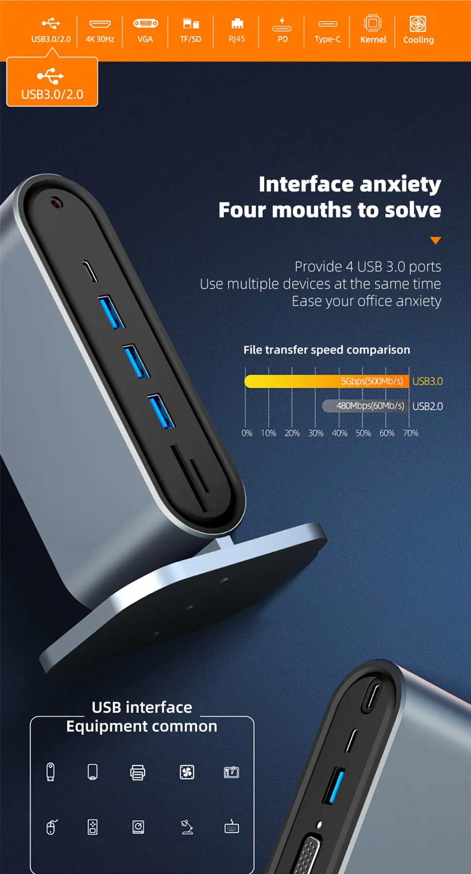 4. Ansiedad de la interfaz Cuatro bocas para resolver, proporciona 4 puertos USB 3,0. Usa varios dispositivos al mismo tiempo para aliviar la ansiedad de tu oficina