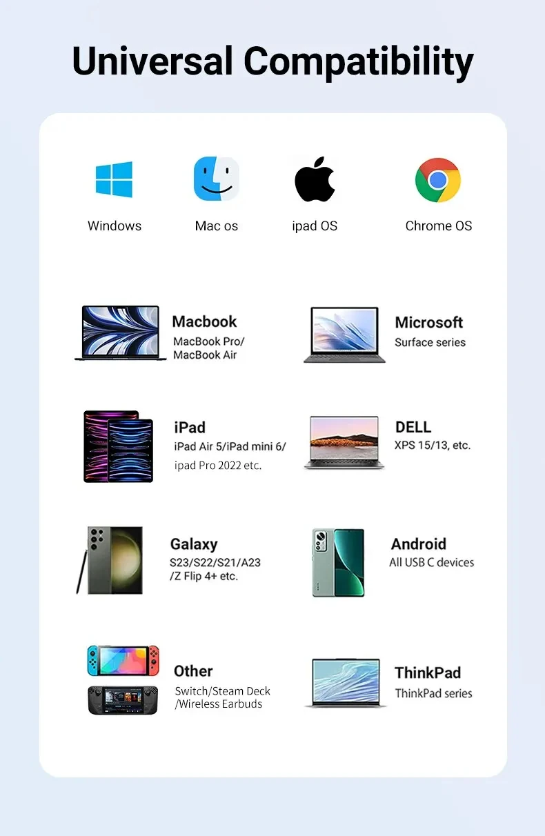 • Certificación RoHS: Con la certificación RoHS, esta estación de acoplamiento es segura y está libre de sustancias nocivas, lo que garantiza un entorno seguro para sus dispositivos.