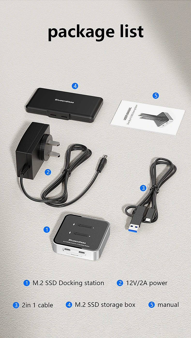 Estación de acoplamiento SSD con protocolo Blueendless de 2 bahías M.2 NVMe/SATA