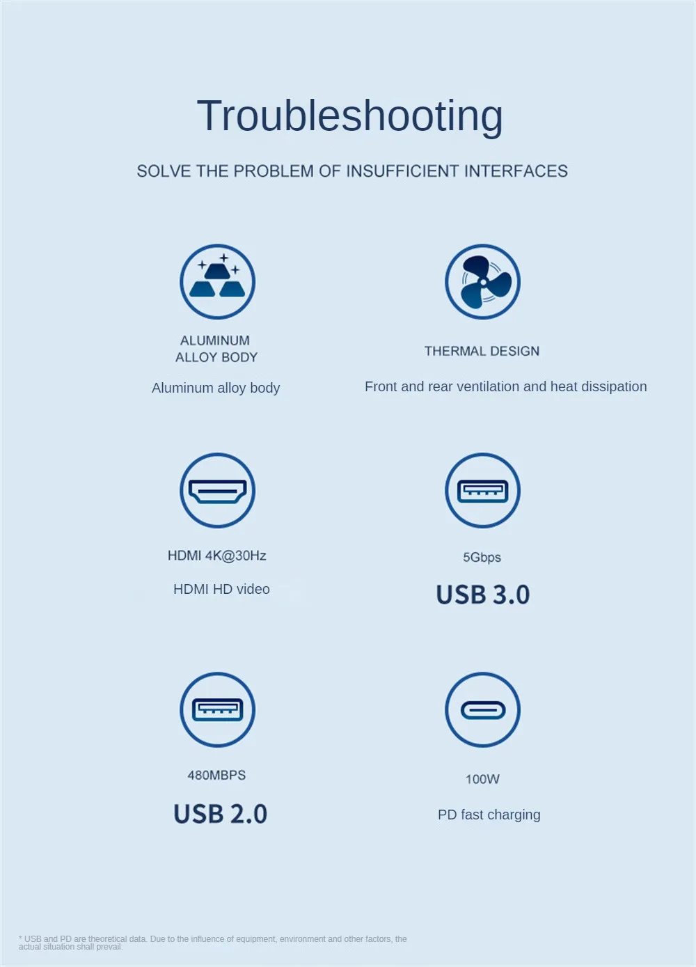 3. Interfaz de salida: USB3.0 * 1,USB2.0 * 1, velocidad de transmisión de hasta 5Gbps, se puede utilizar con teclado, ratón, unidad flash o cable USB para sincronizar y cargar teléfonos inteligentes u otros dispositivos.