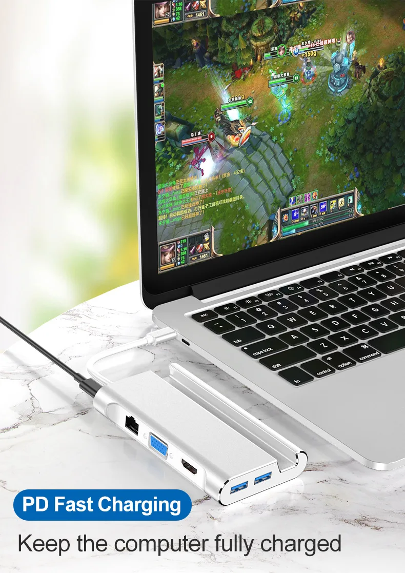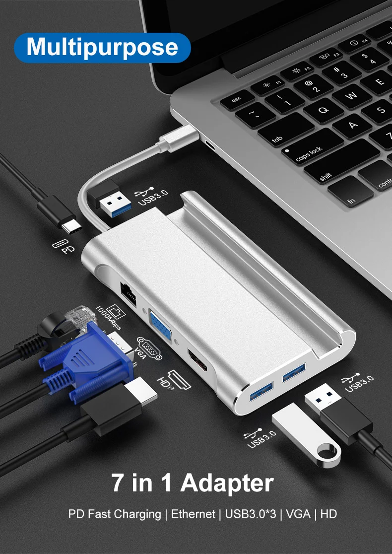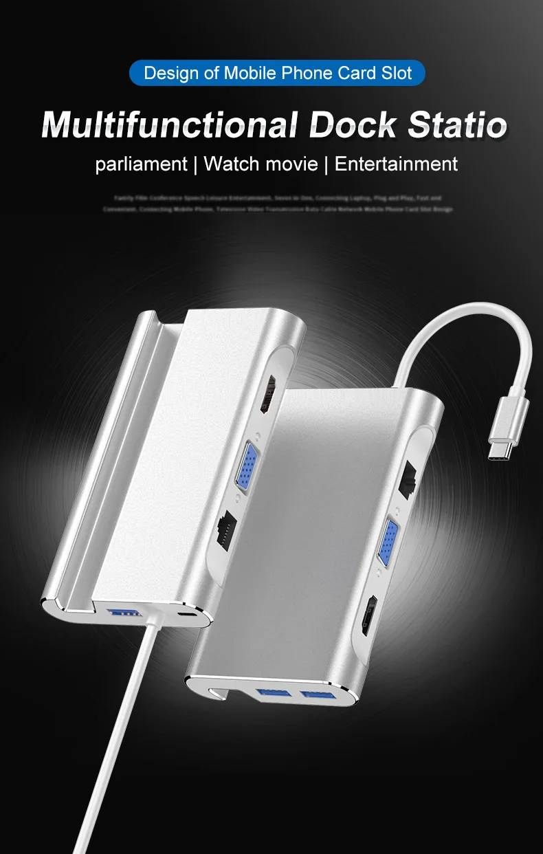 1. Dock multifuncional, con un puerto compatible con HDMI, tres puertos USB 3,0 tipo A, un puerto Gigabit Ethernet de ultra alta velocidad, un puerto VGA, un puerto de carga de PD DE LA USB-C.