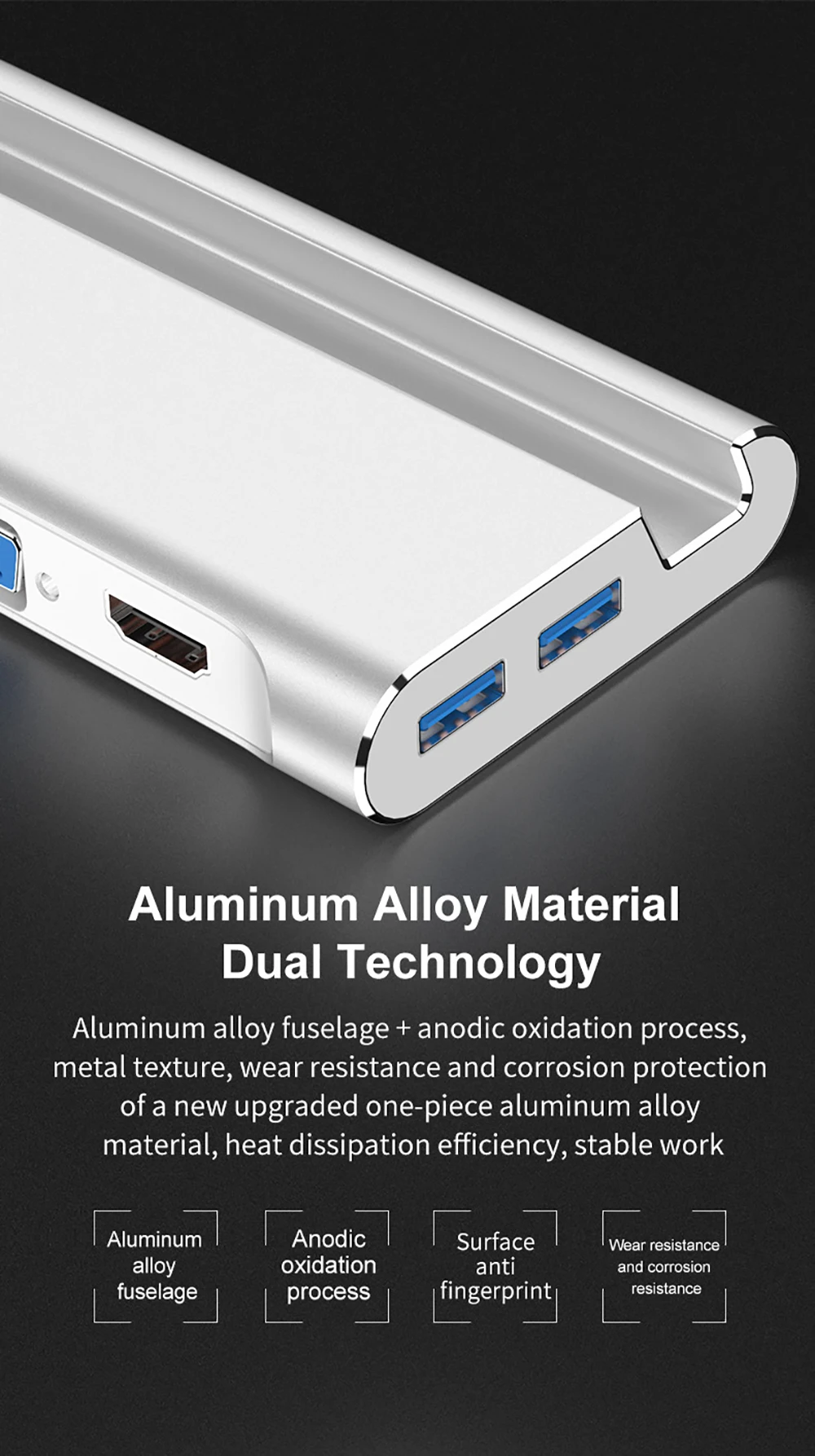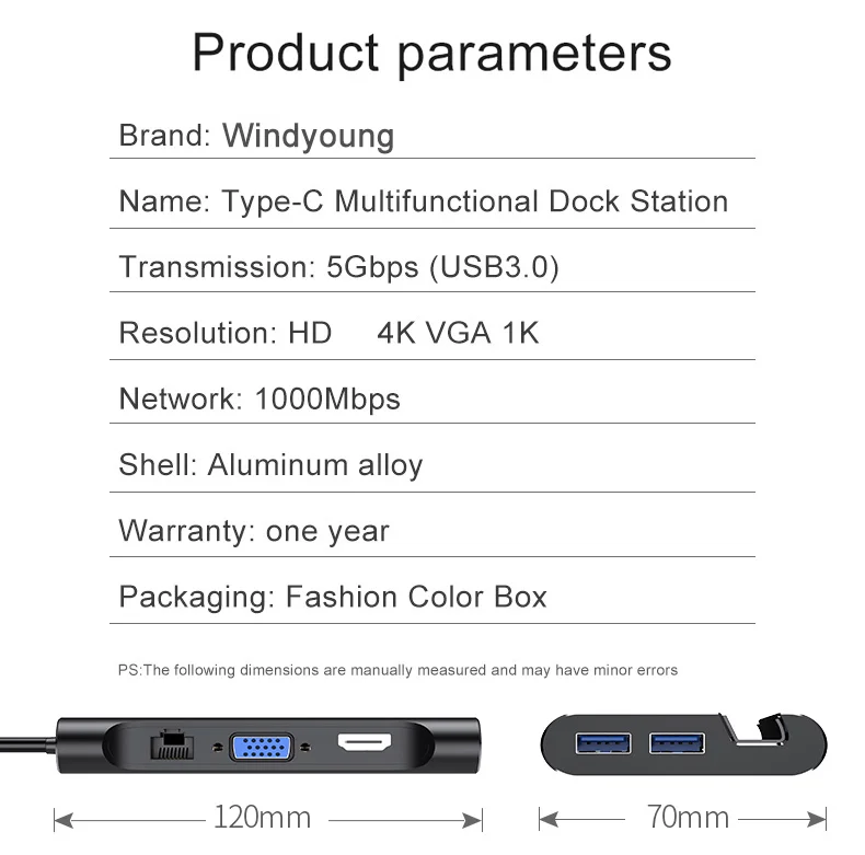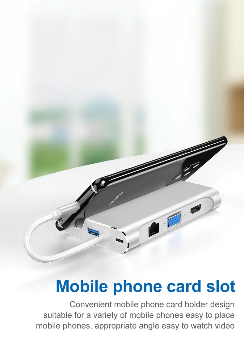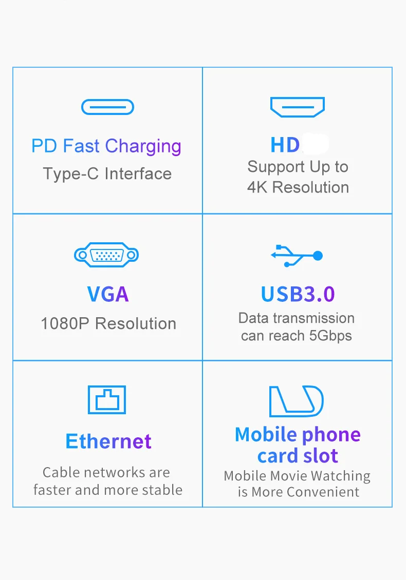 1. Dock multifuncional, con un puerto compatible con HDMI, tres puertos USB 3,0 tipo A, un puerto Gigabit Ethernet de ultra alta velocidad, un puerto VGA, un puerto de carga de PD DE LA USB-C.