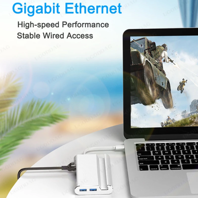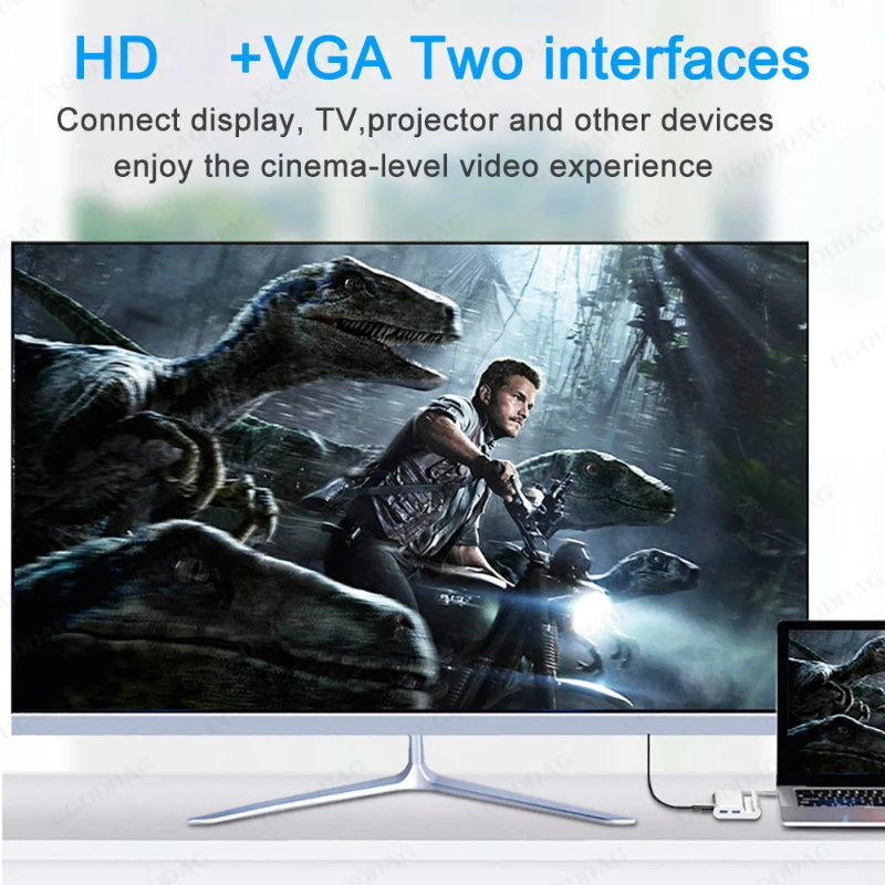 1. Dock multifuncional, con un puerto compatible con HDMI, tres puertos USB 3,0 tipo A, un puerto Gigabit Ethernet de ultra alta velocidad, un puerto VGA, un puerto de carga de PD DE LA USB-C.