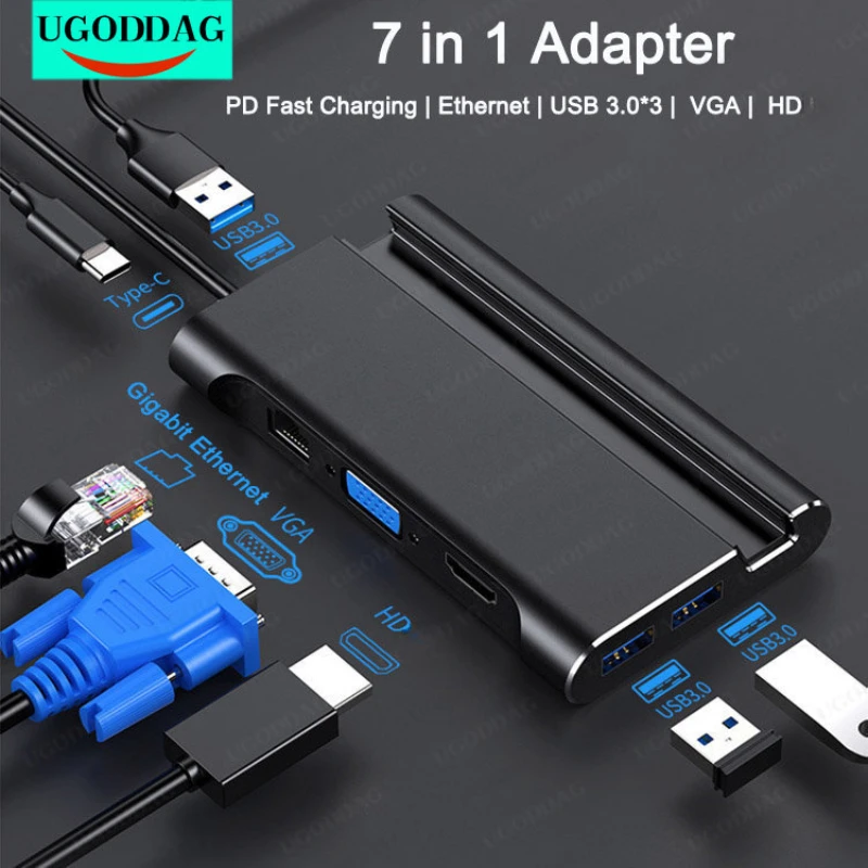 Estación de acoplamiento tipo C compatible con HDMI 4K USB 3,0 VGA RJ45 PD USB C Hub para computadora portátil Macbook Pro HP Surface DELL Lenovo Samsung