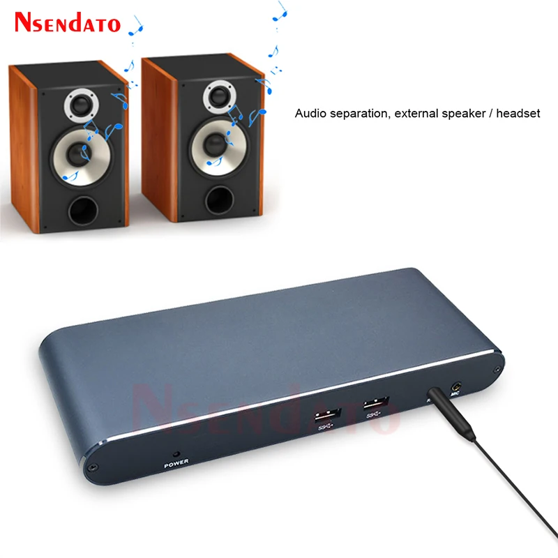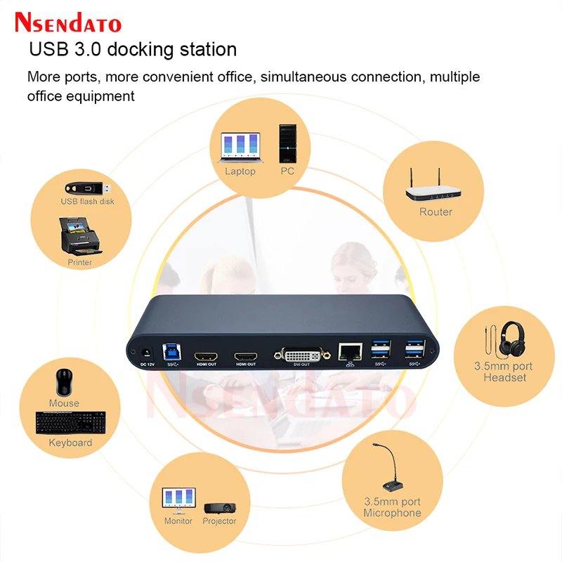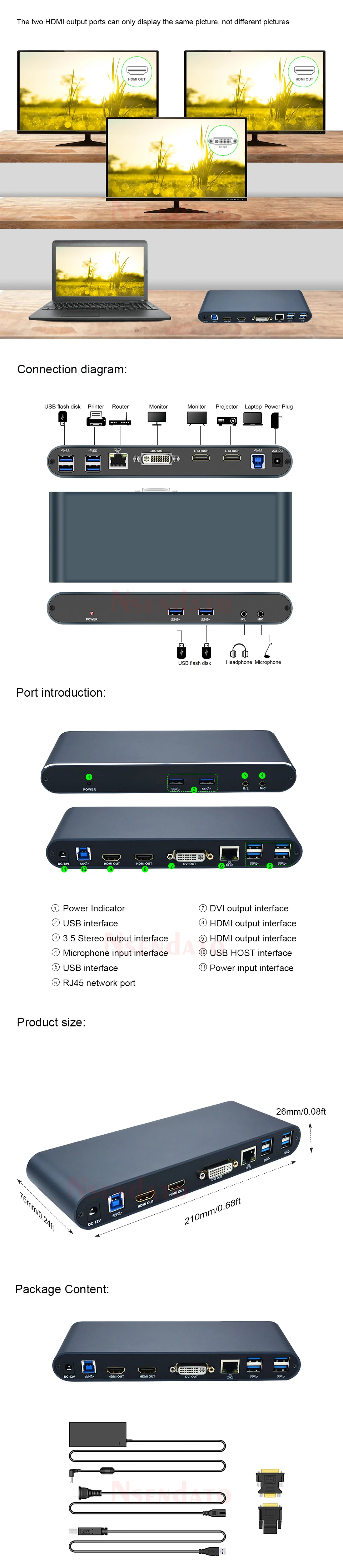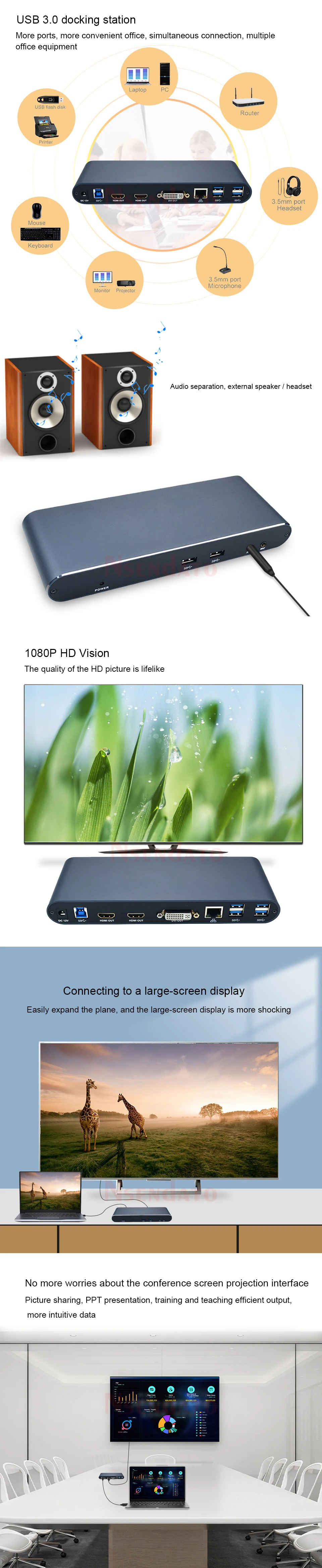 Descripción:Nsendato de interfaz USB3.0 del ordenador portátil a 12 interfaces adicionales en una parada, y solo necesita un cable USB para conectar dispositivos periféricos al ordenador portátil,. Soluciona eficazmente el problema de interfaces inadecuadas causadas por el diseño portátil del ordenador. Agrega un monitor DVI y dos monitores HDMI con la misma imagen, lo que puede maximizar la eficiencia de trabajo y ampliar el espacio de trabajo. Muy adecuado para uso en oficinas, como correos electrónicos, aplicaciones Web, Microsoft office, etc.La parte frontal de este producto está diseñada con interfaz USB, interfaz de salida estéreo e interfaz de entrada de micrófono, lo que es conveniente para la inserción y extracción frecuentes todos los días.Características:Soporte de Windows 7 8 8,1 10 XP (32bit) Vista (32bit) macOS Chrome OS sistemaAdmite 1 entrada USB.Admite salida estéreo de 3,5mm.Admite 1 entrada de micrófono.Admite 2 interfaces de salida HDMI, solo puede mostrar la misma imagen.Admite 1 Salida DVI.Admite salida USB de 6 canales.Admite 1 canal de entrada de puerto de red RJ45.La resolución de salida es de hasta 1920*1080P / 60Hz.Especificación:Interfaz USB: USB TYPE-AVersión USB: USB2.0, USB3.0Resolución de Salida: x a 60HzDistancia del cable de salida:=5m (cable AWG26 estándar HDMI1.4)Contenido del paquete:Multi-pantalla estación de acoplamiento universal hostAdaptador de corriente 12V aUSB3.0 HOST cable de conexiónDVI / VGA adaptadorDVI / HDMI adaptadorManual de usuario